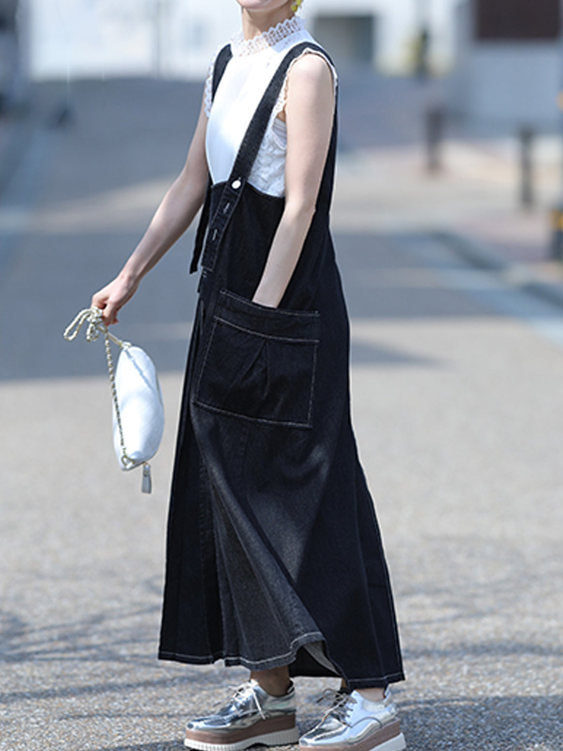 ・スニーカー+サロペットスカートのカジュアルな着こなしにも女性らしく着れちゃいます。
