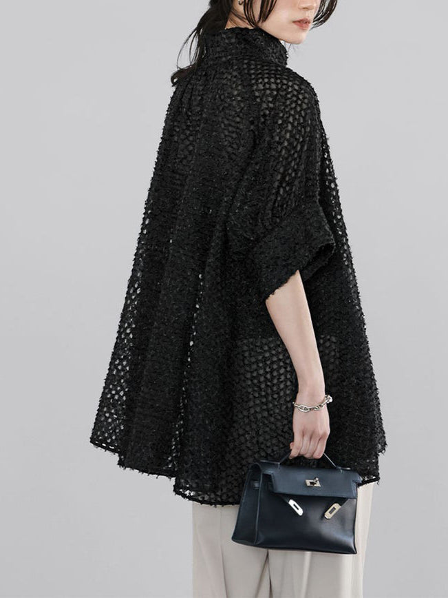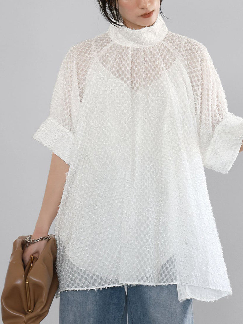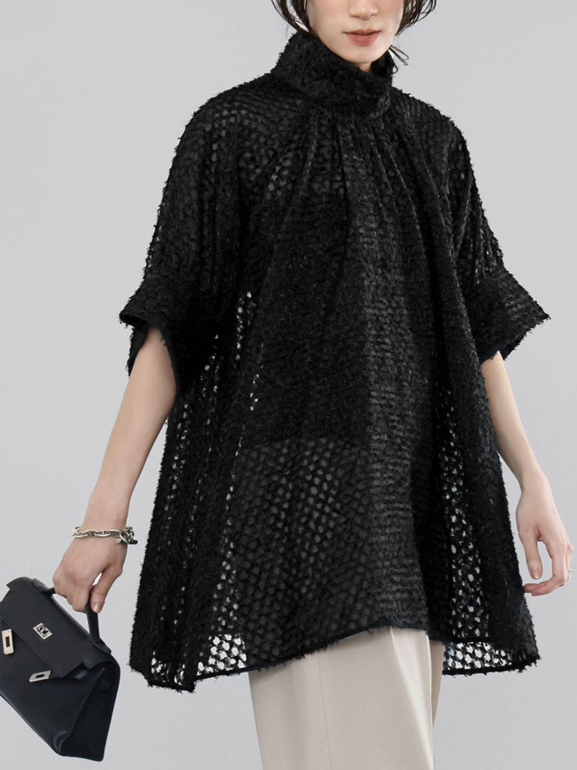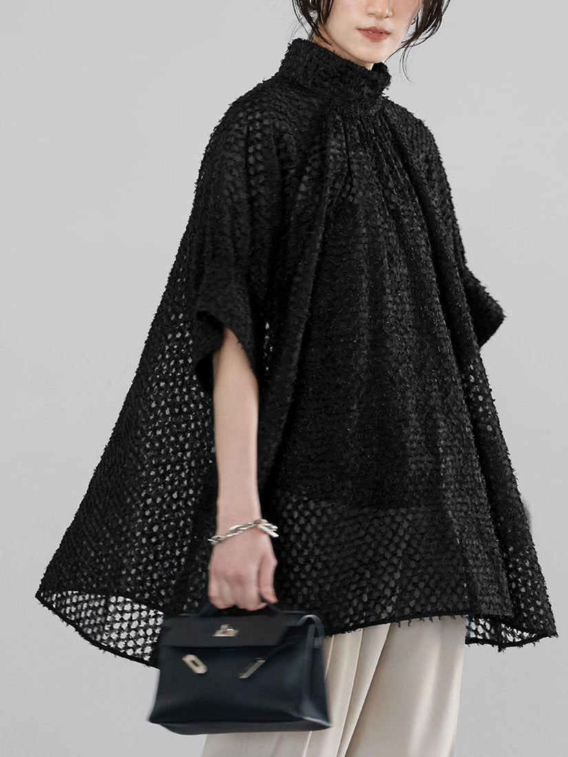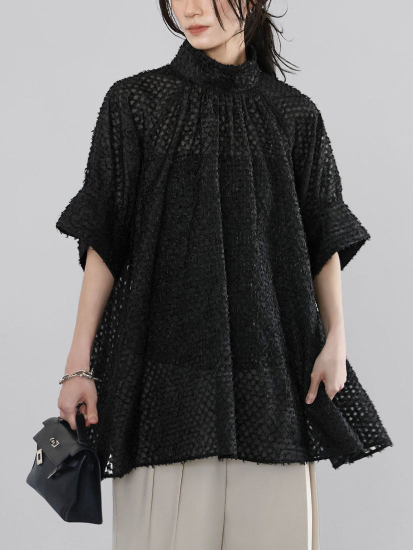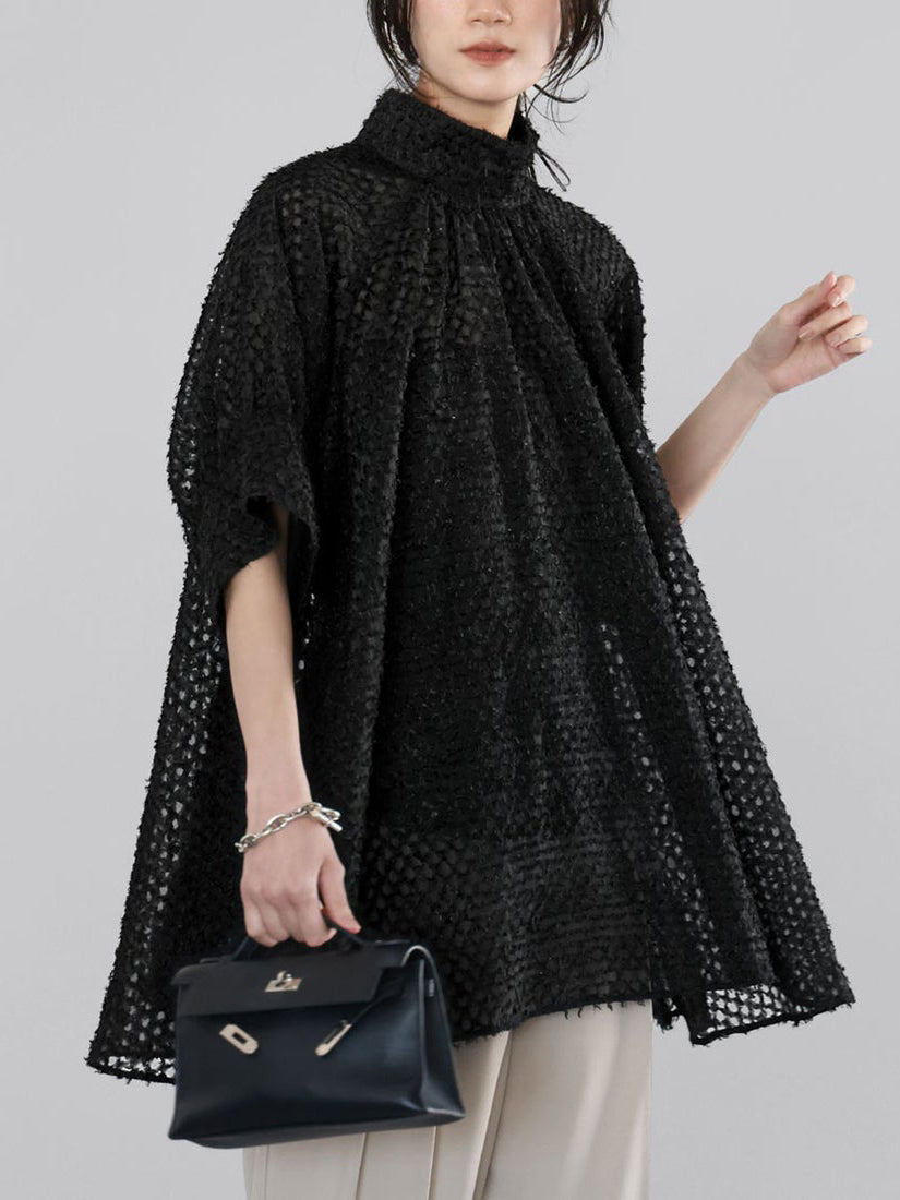 【凹凸のあるカットジャガードが目を惹くハイネックブラウス】