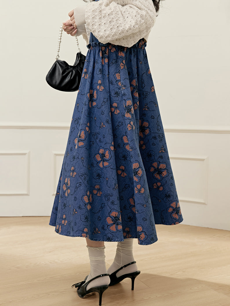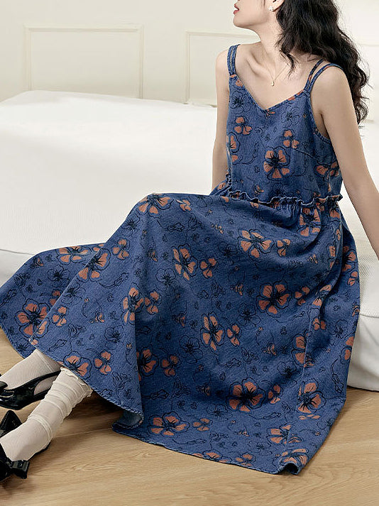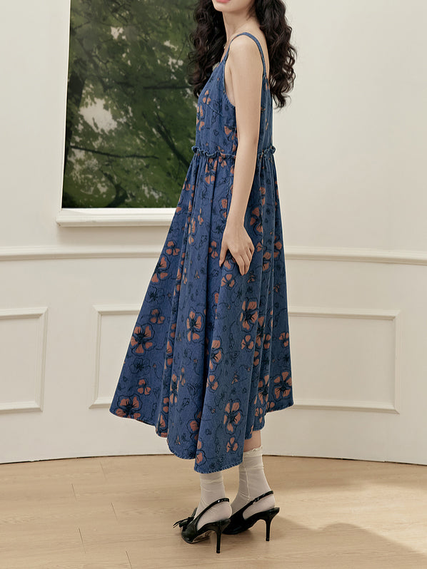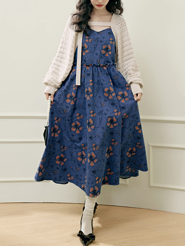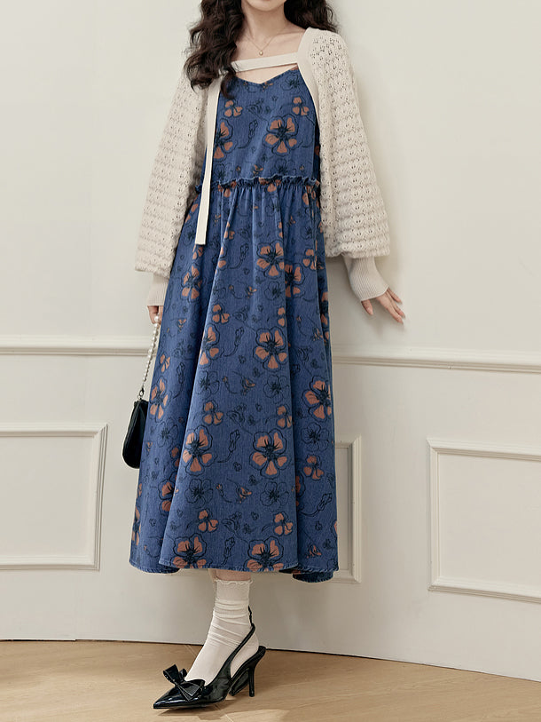 フラワーデニムキャミワンピース+クロッシェニットボレロ