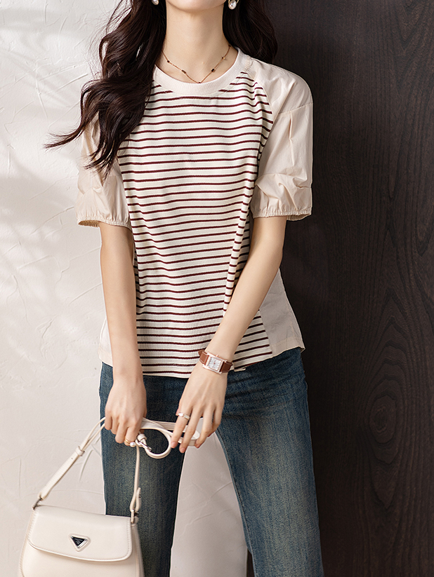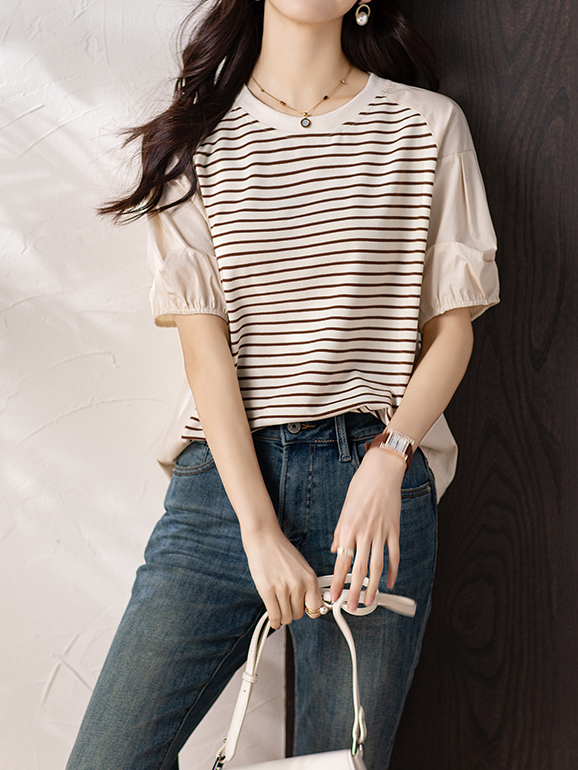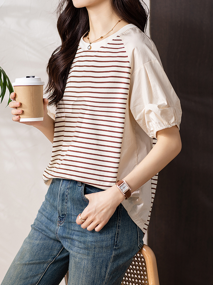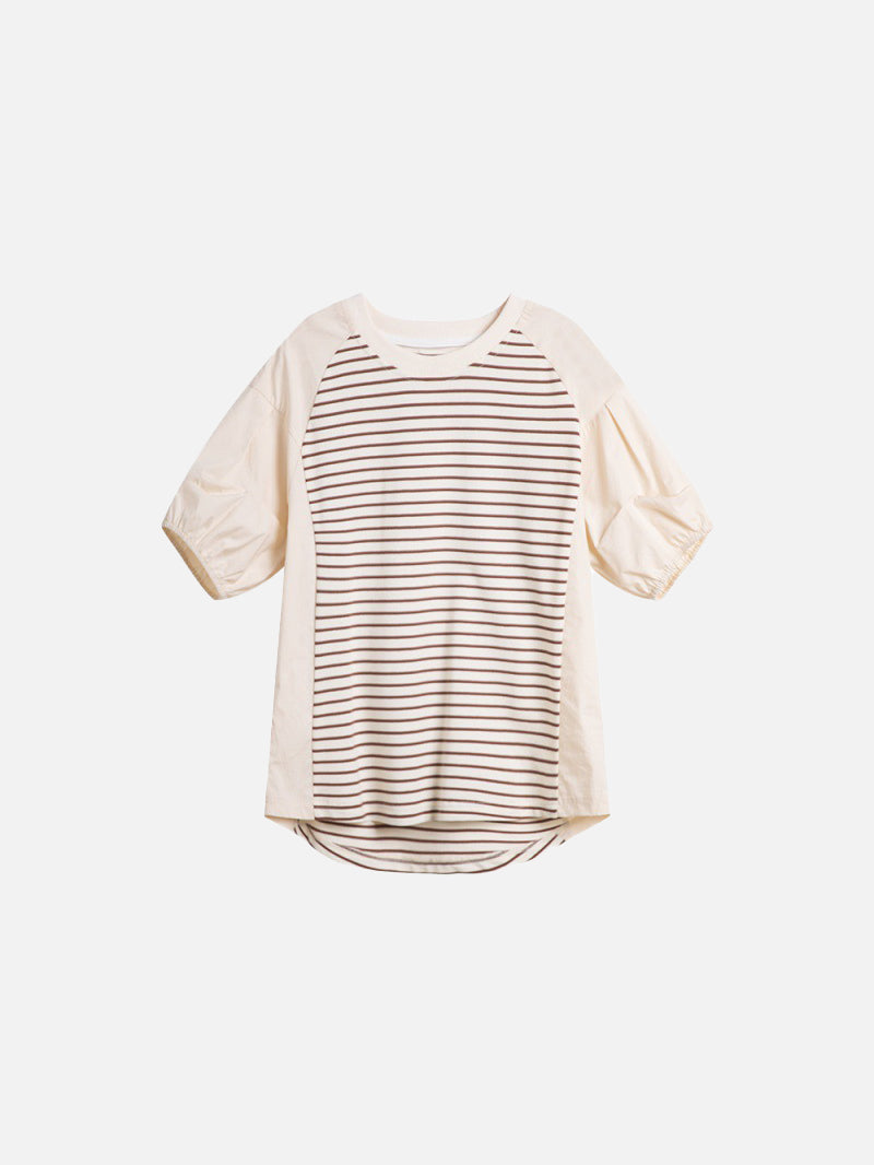 ボーダーのカジュアル要素とかわいいパフスリーブを合わせた大人カジュアル派Tシャツ。