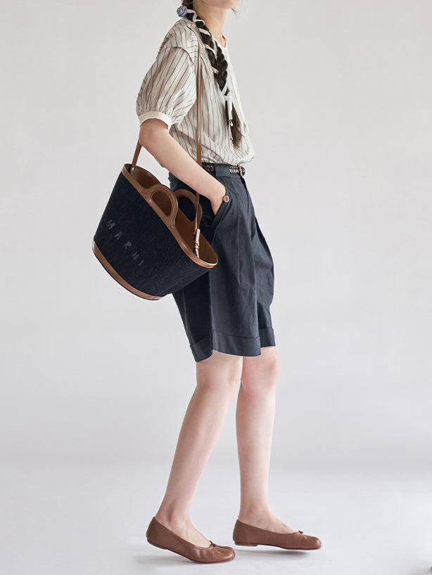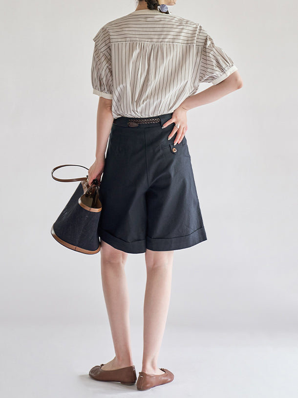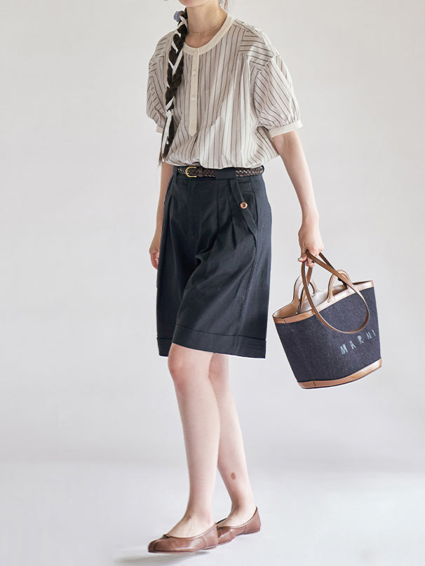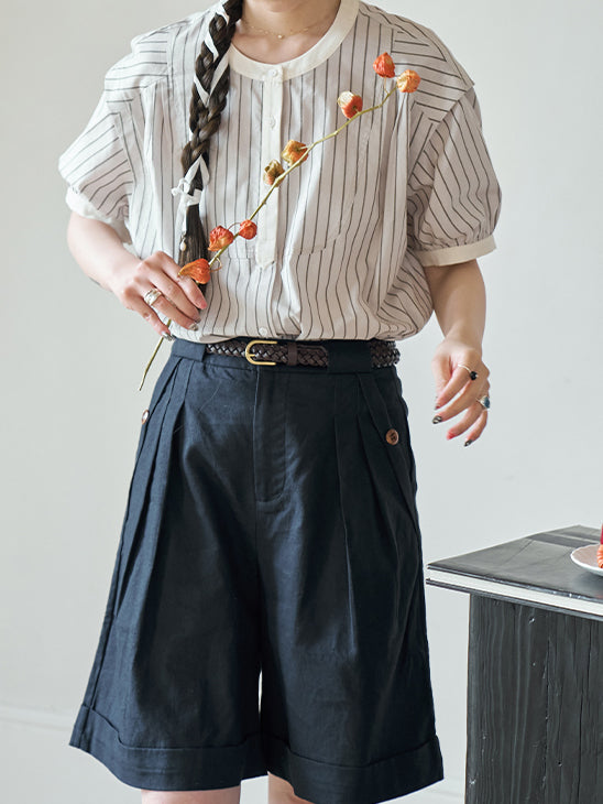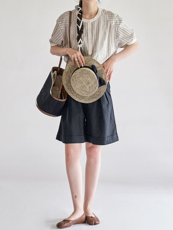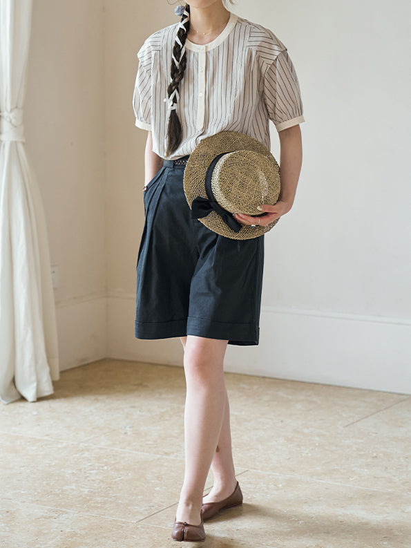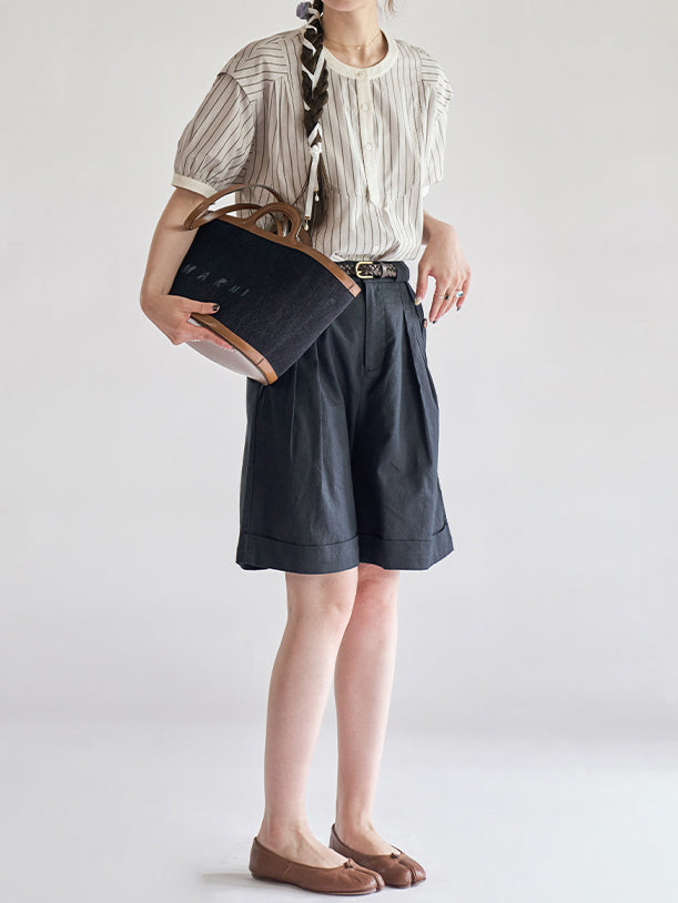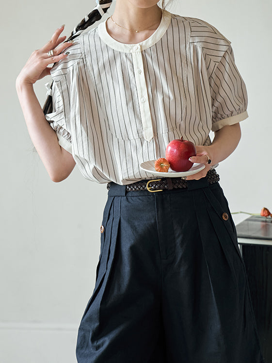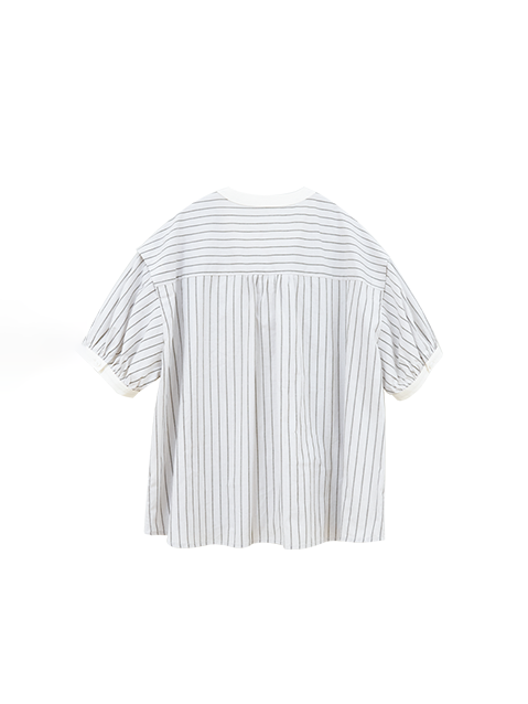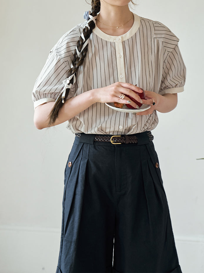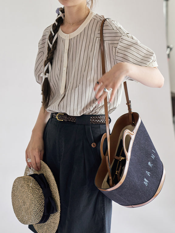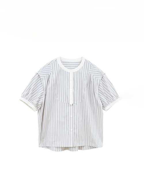 [ Puff sleeve striped blouse with stiff bust as the highlight ]