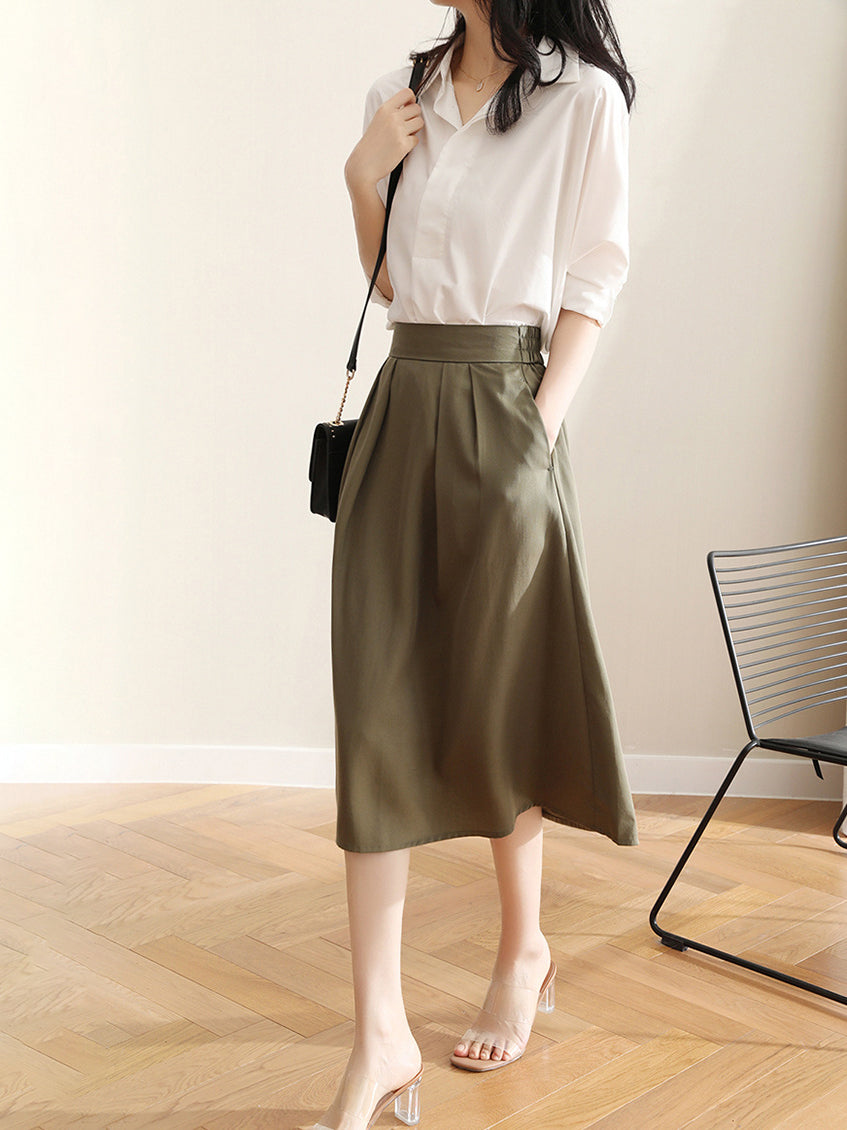 The tuck flared skirt is an elegant item with a beautiful tuck design that tightens the waist and creates a naturally flared silhouette.
