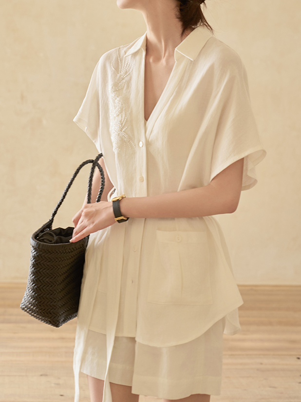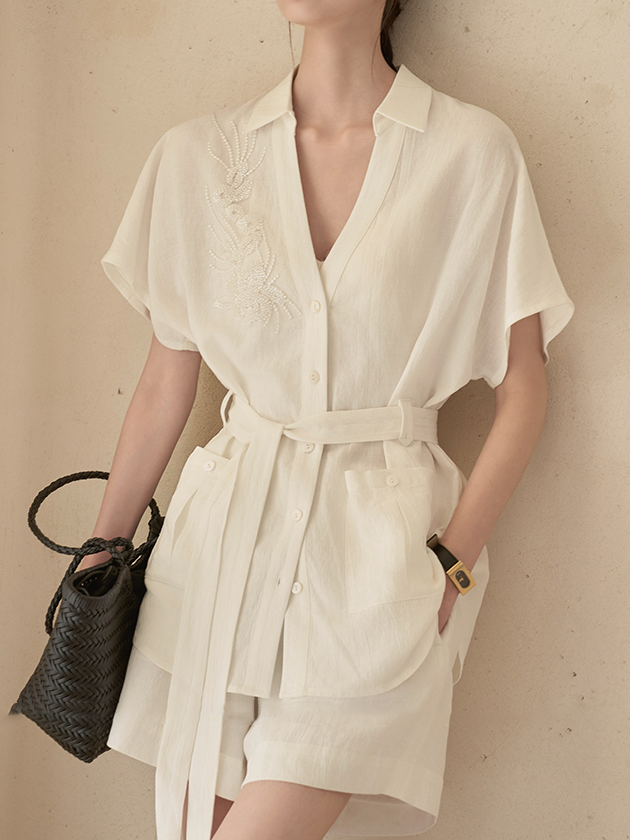 French sleeve work shirt + wide slacks pants SET 2 colors