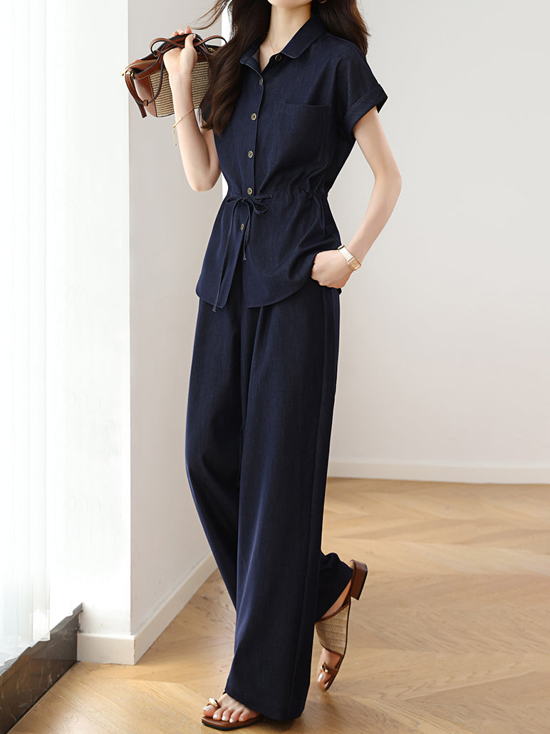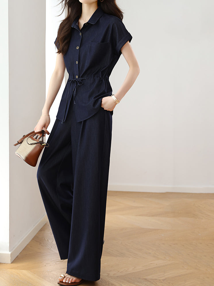 Wrinkled tucked-in blouse + drawstring waist wide pants set (2 colors)