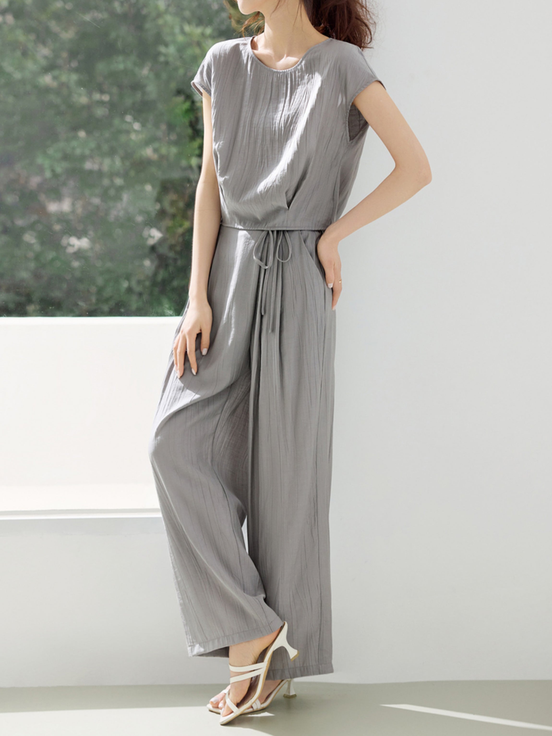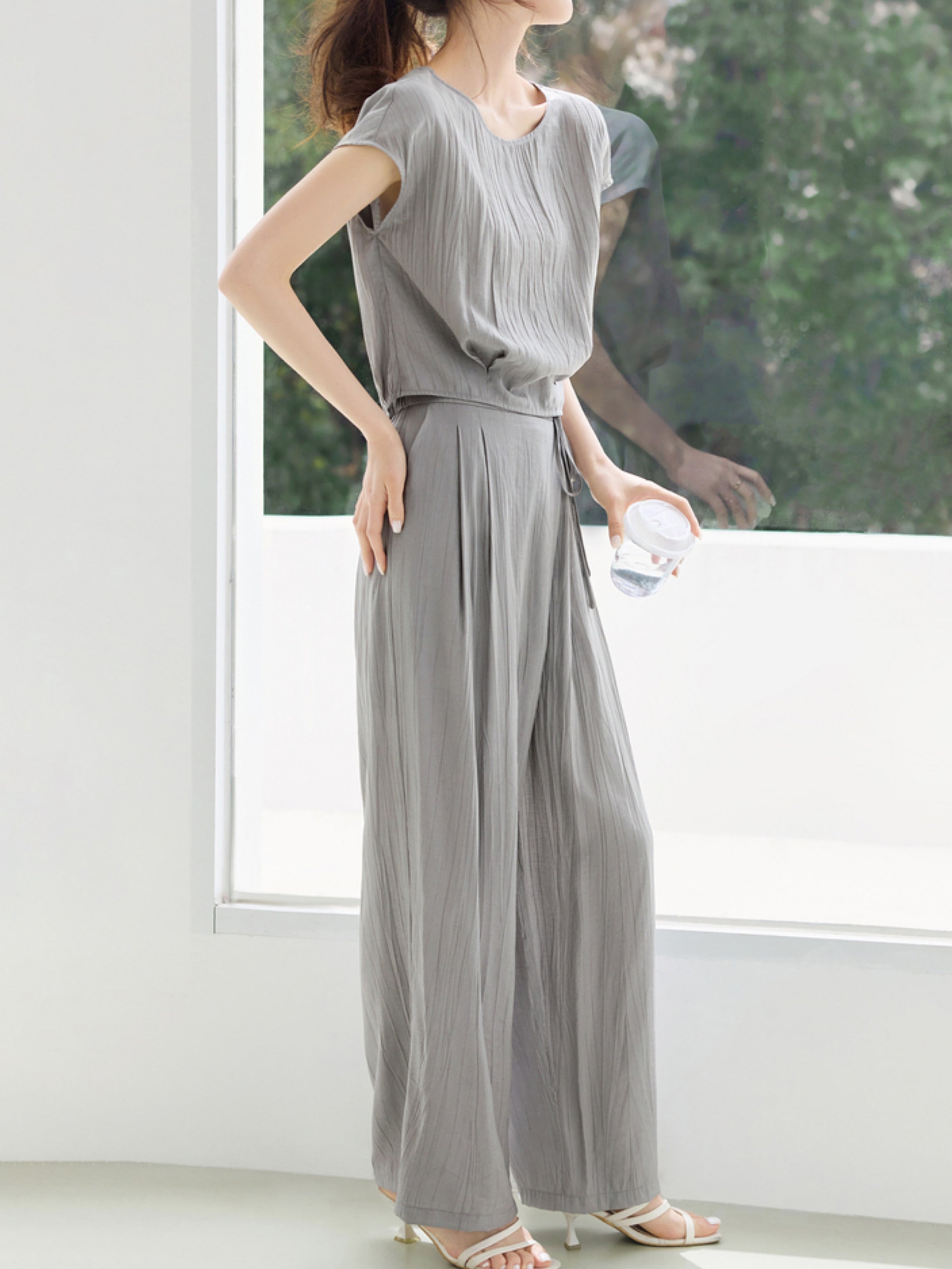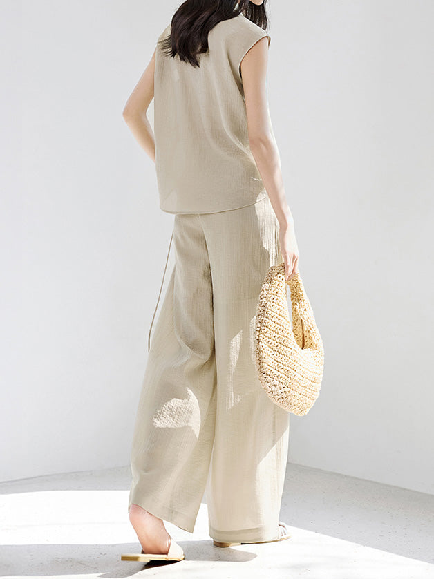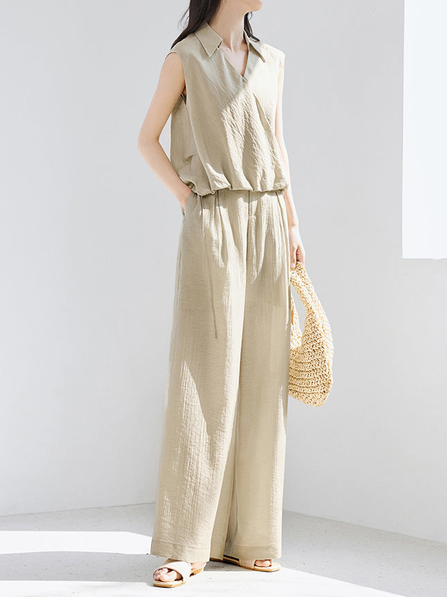 Wrinkled sleeveless blouse and wide pants set (2 colors)