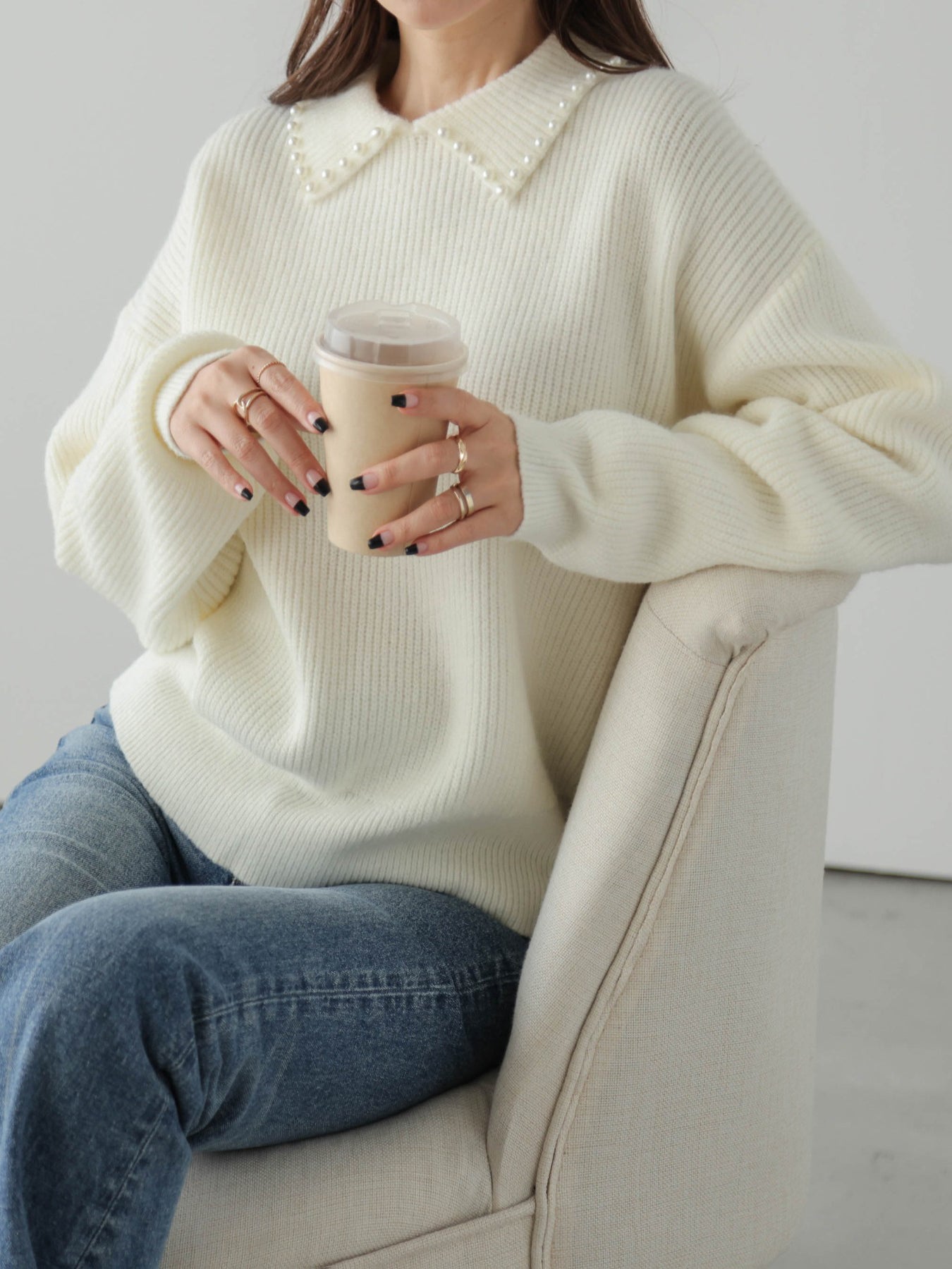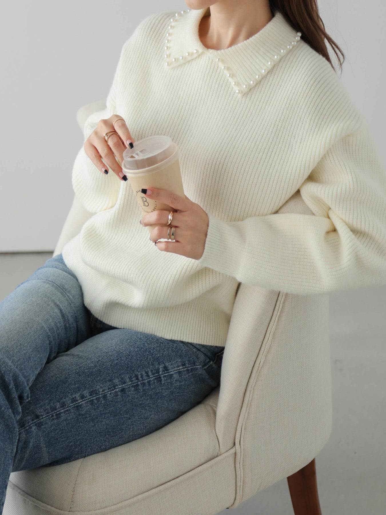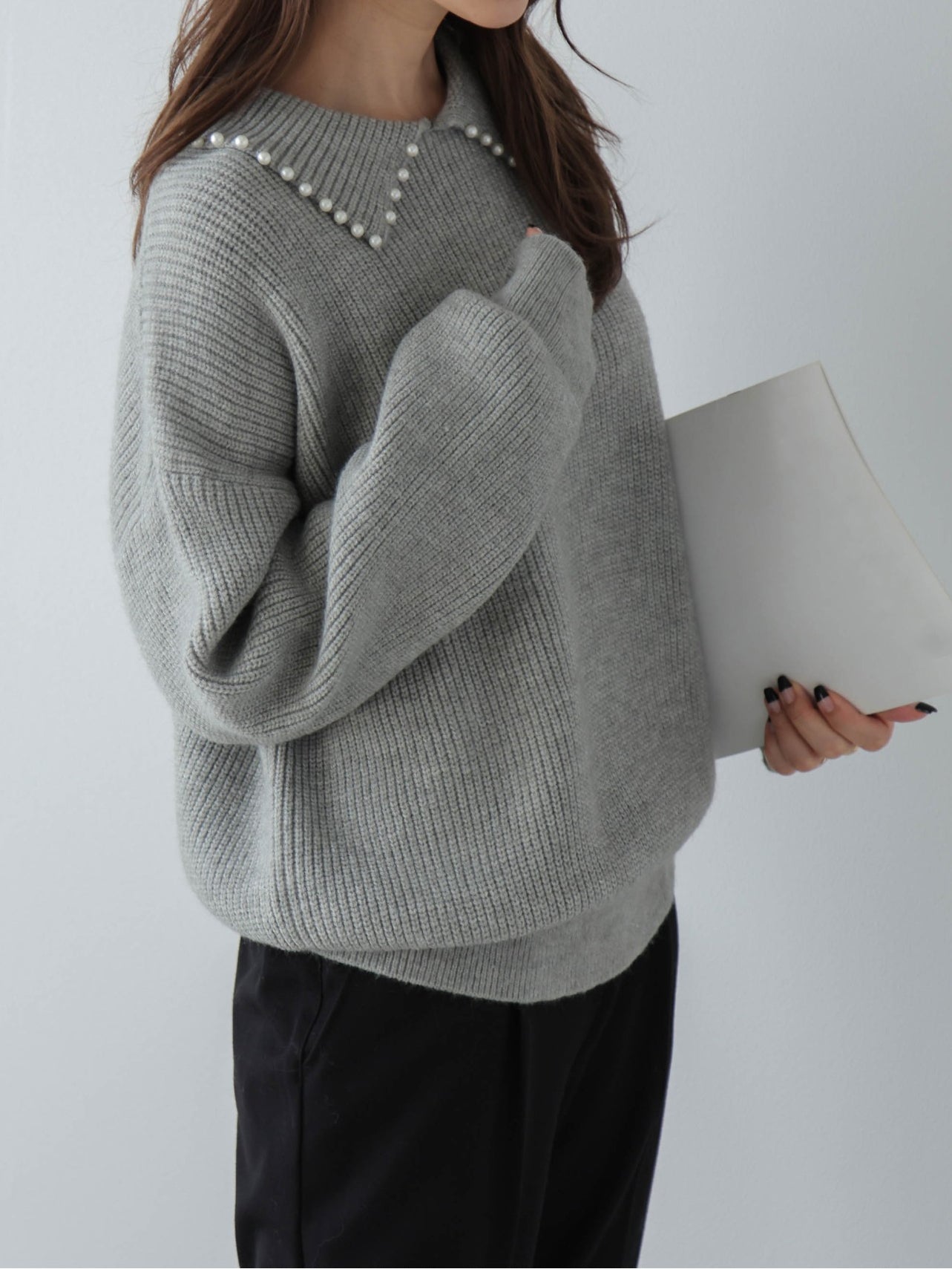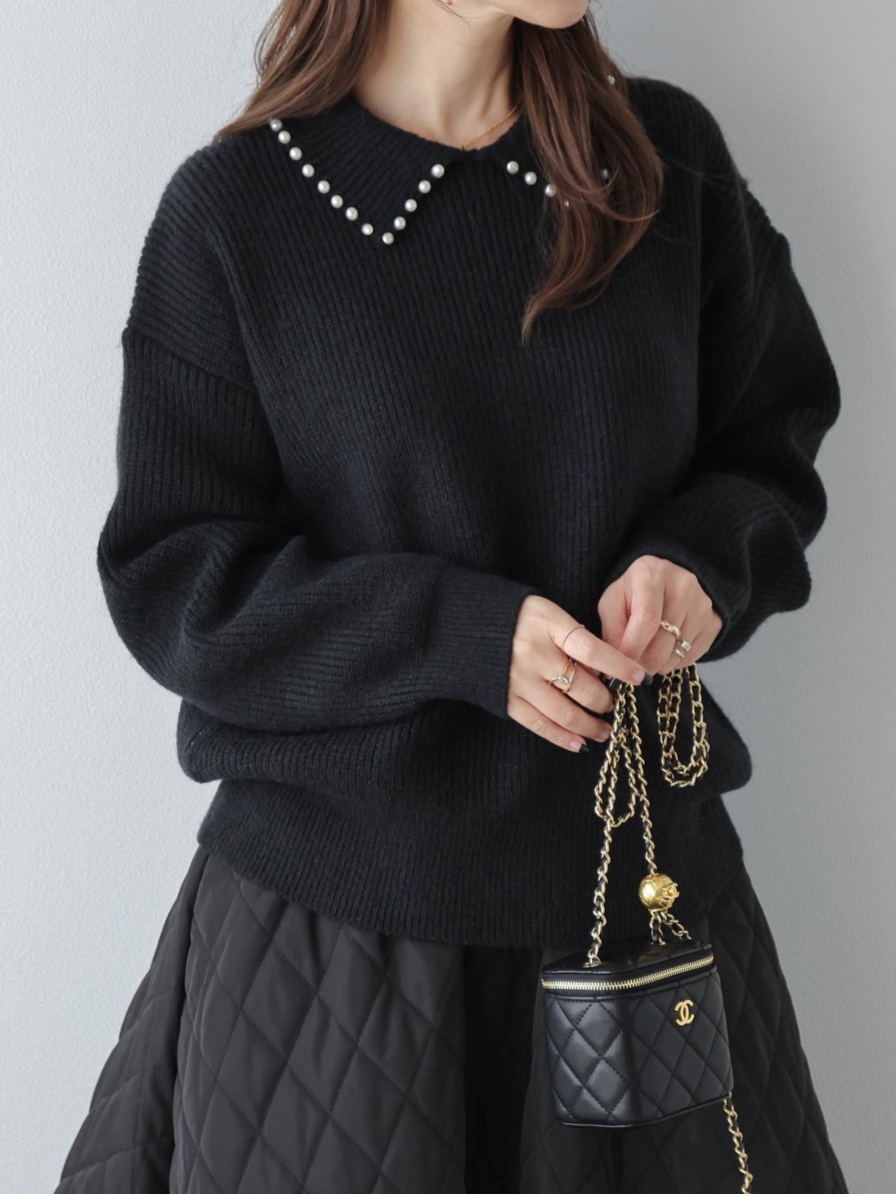 A cute knit for adults featuring a pearl-like motif on the collar.