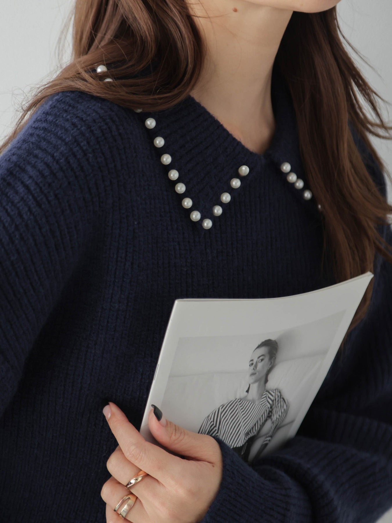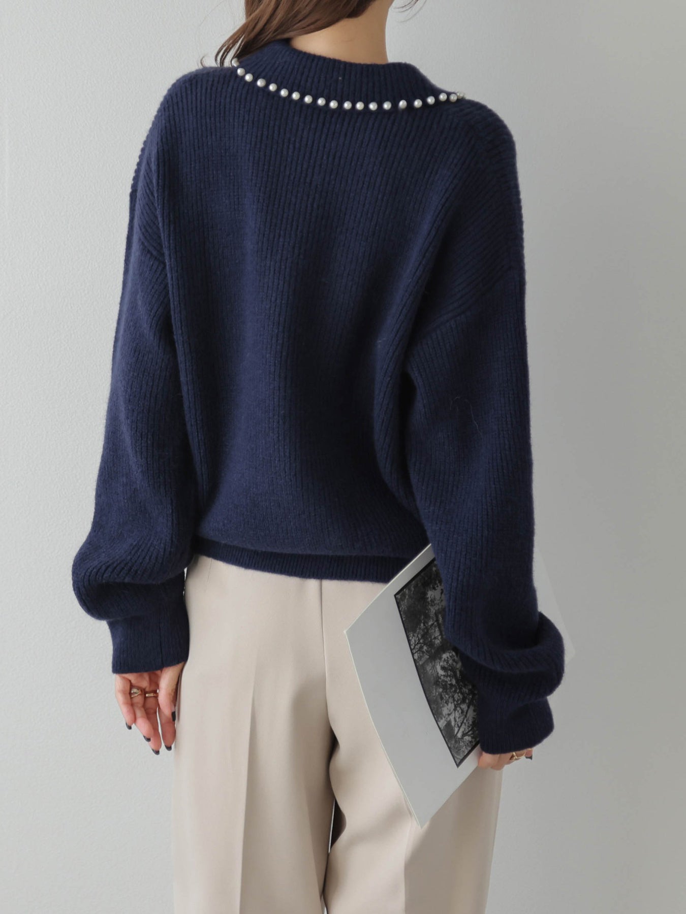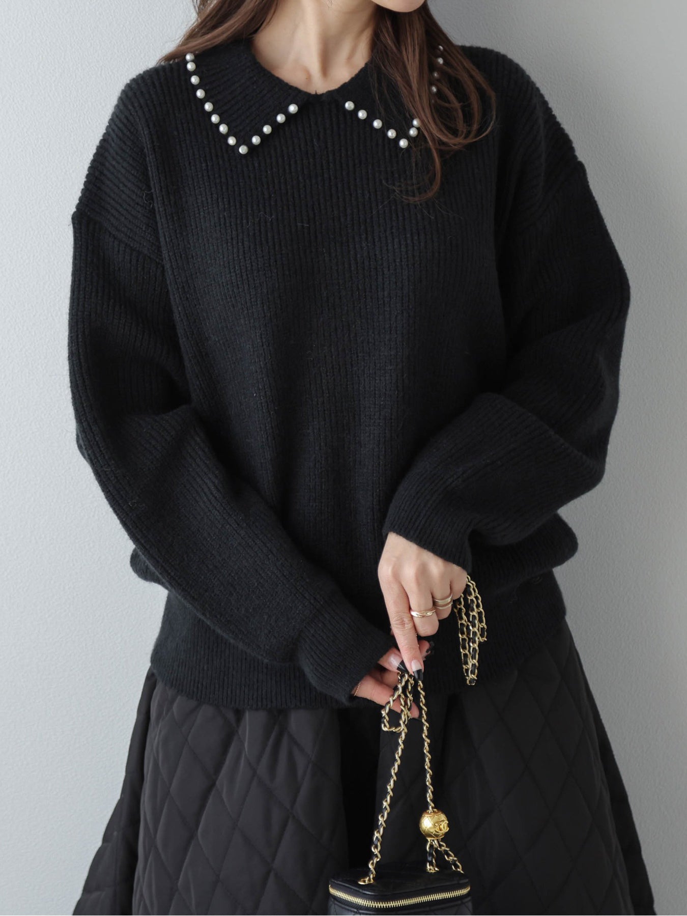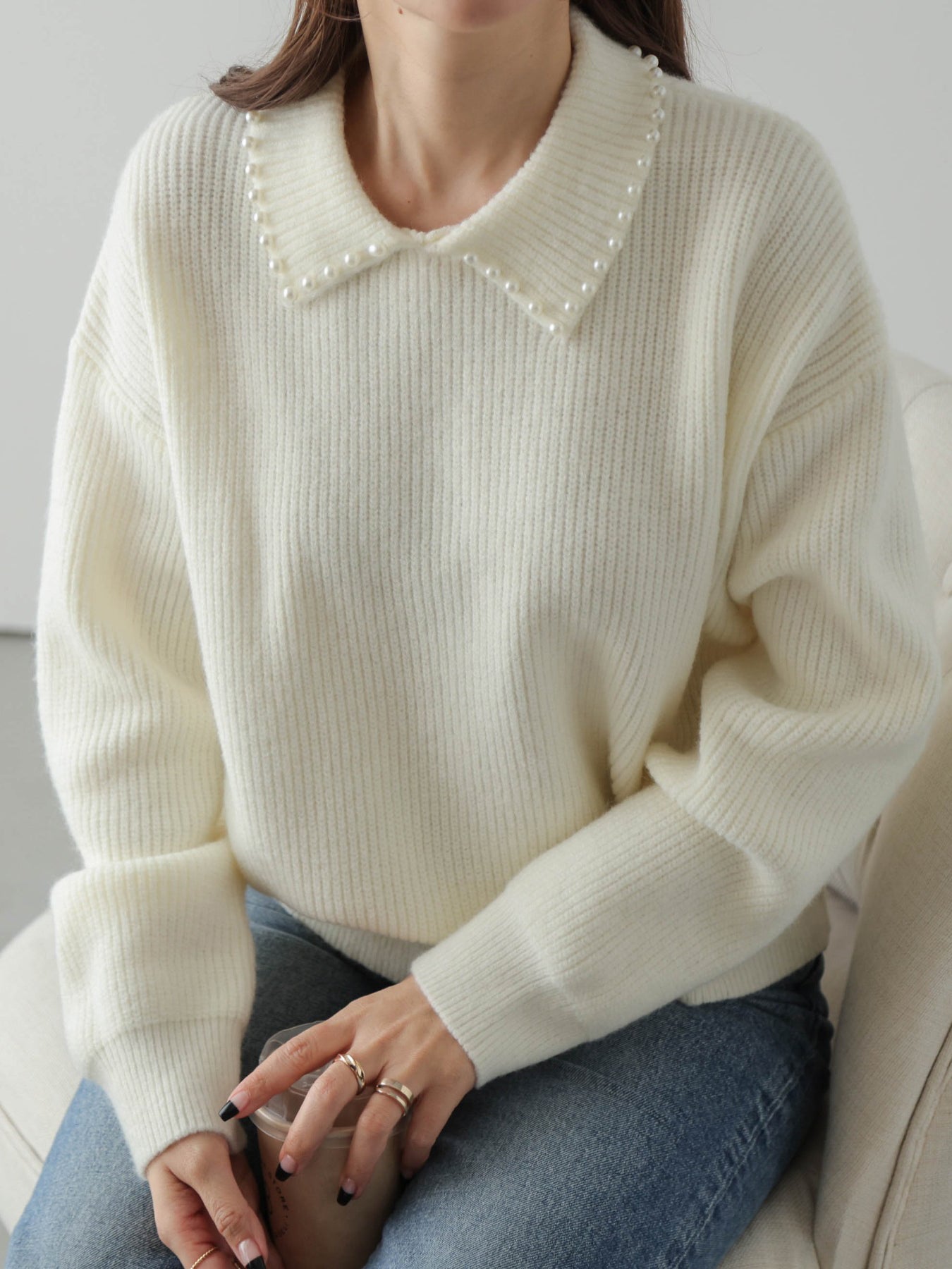 A cute knit for adults featuring a pearl-like motif on the collar.