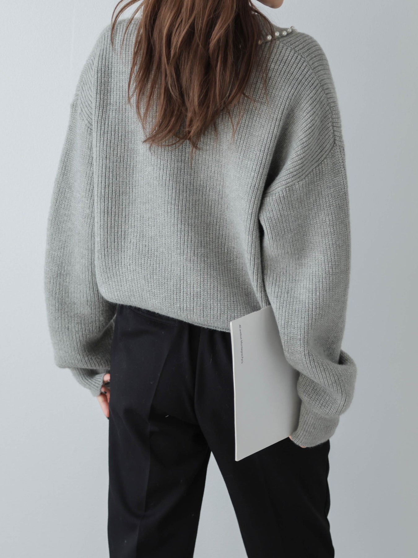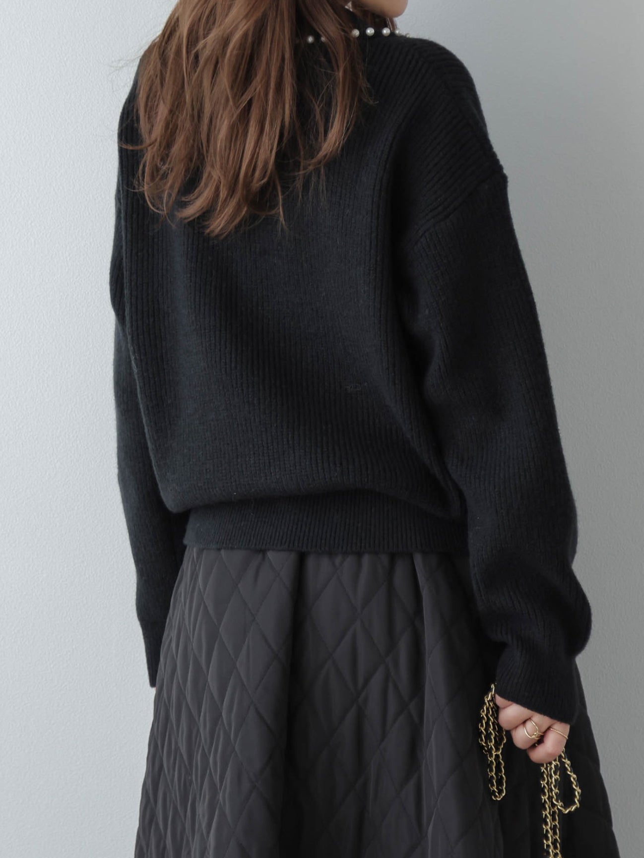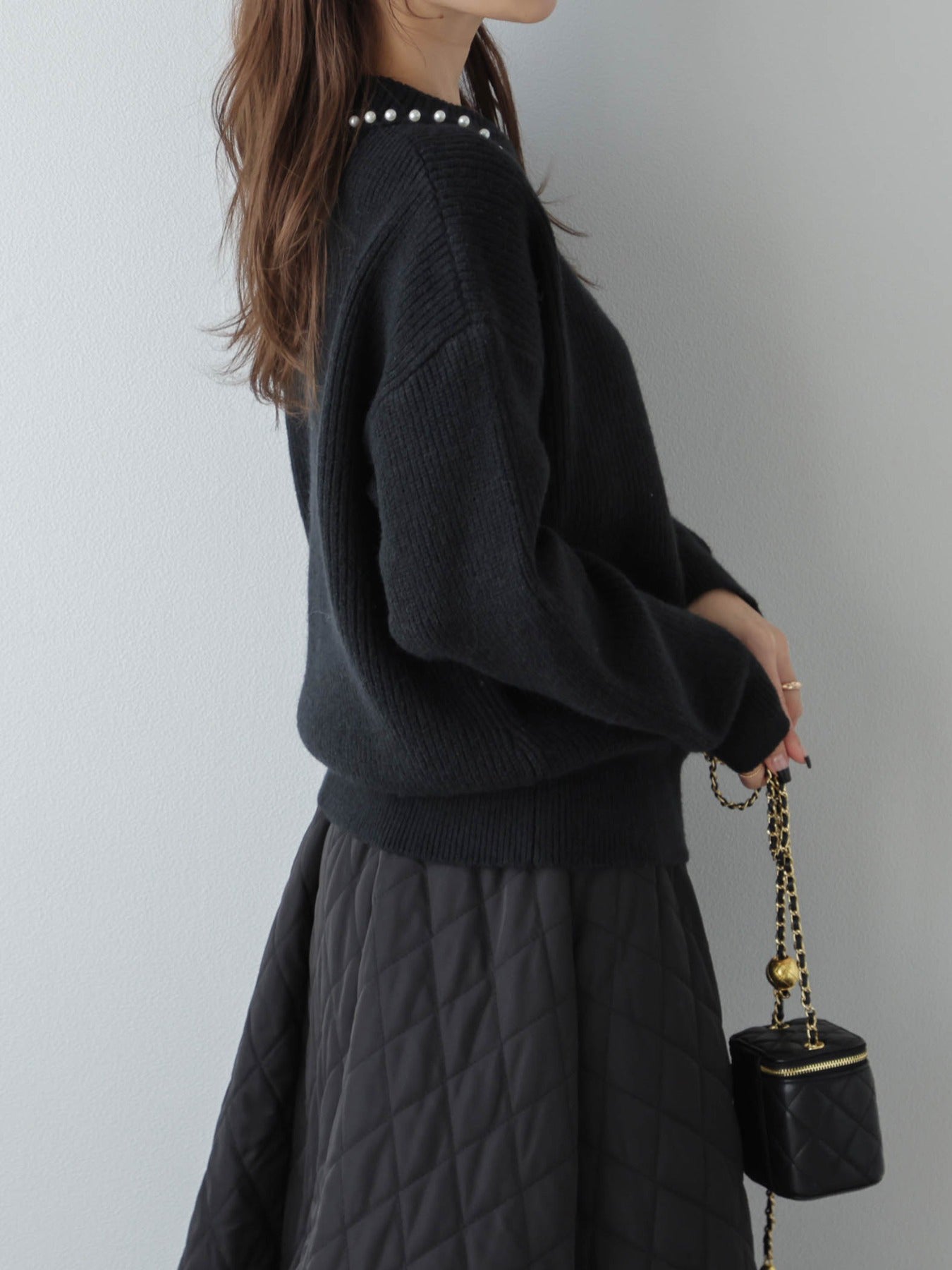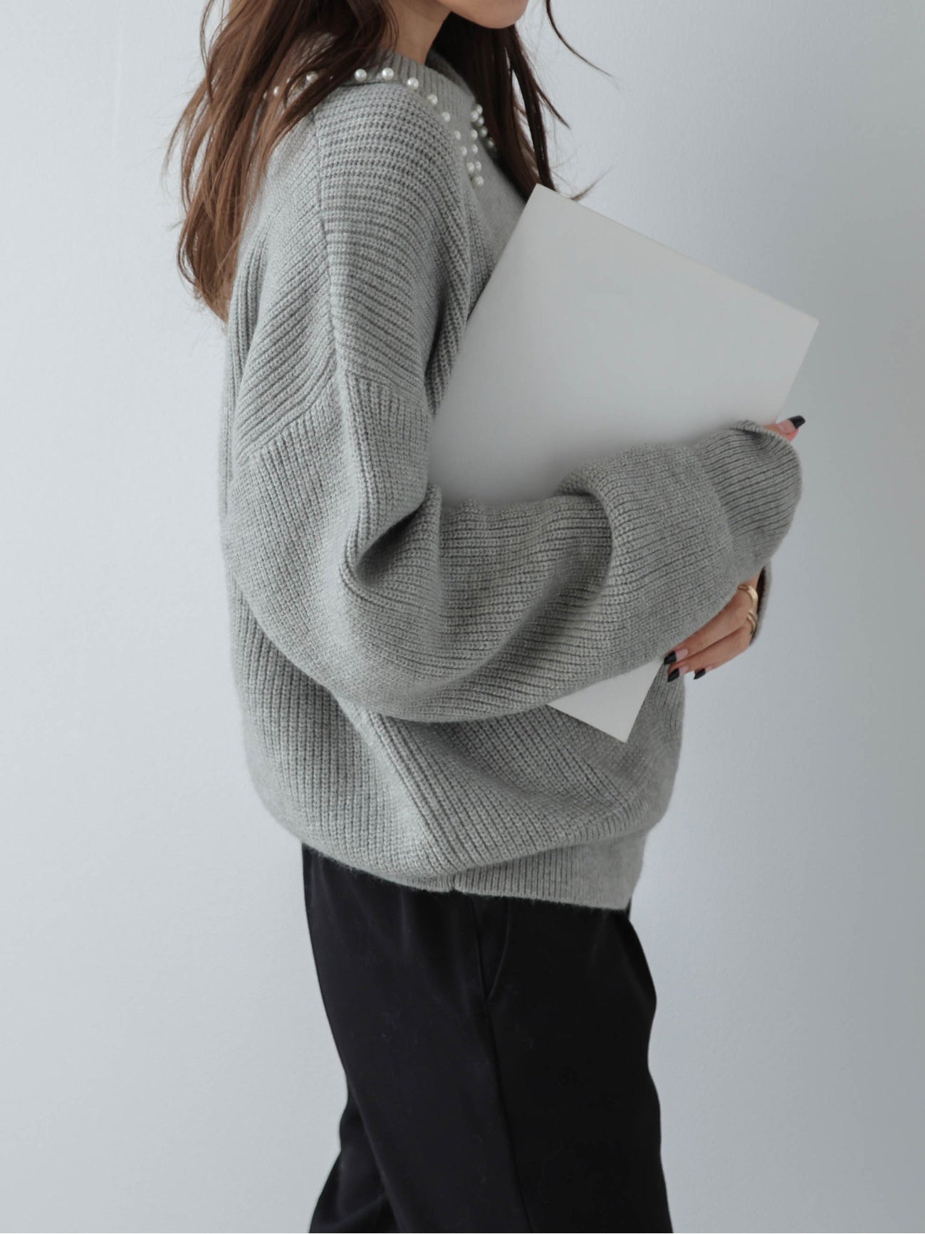 A cute knit for adults featuring a pearl-like motif on the collar.