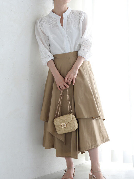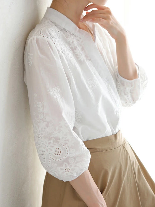 [Band-collar blouse with gorgeous embroidery and lace ]