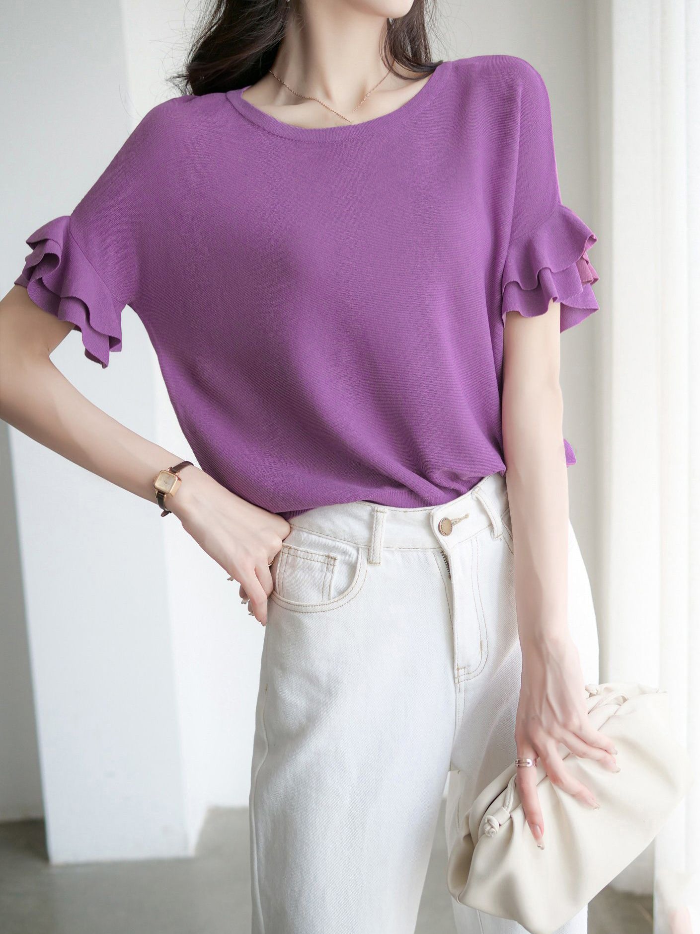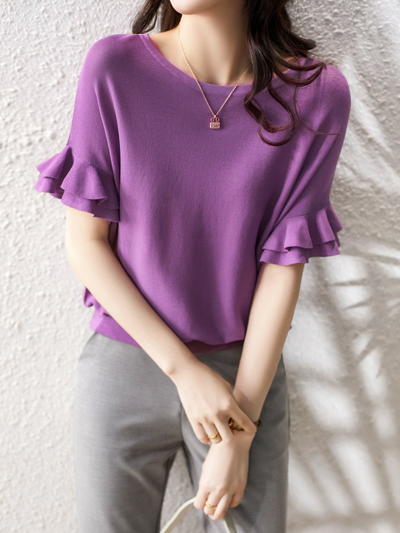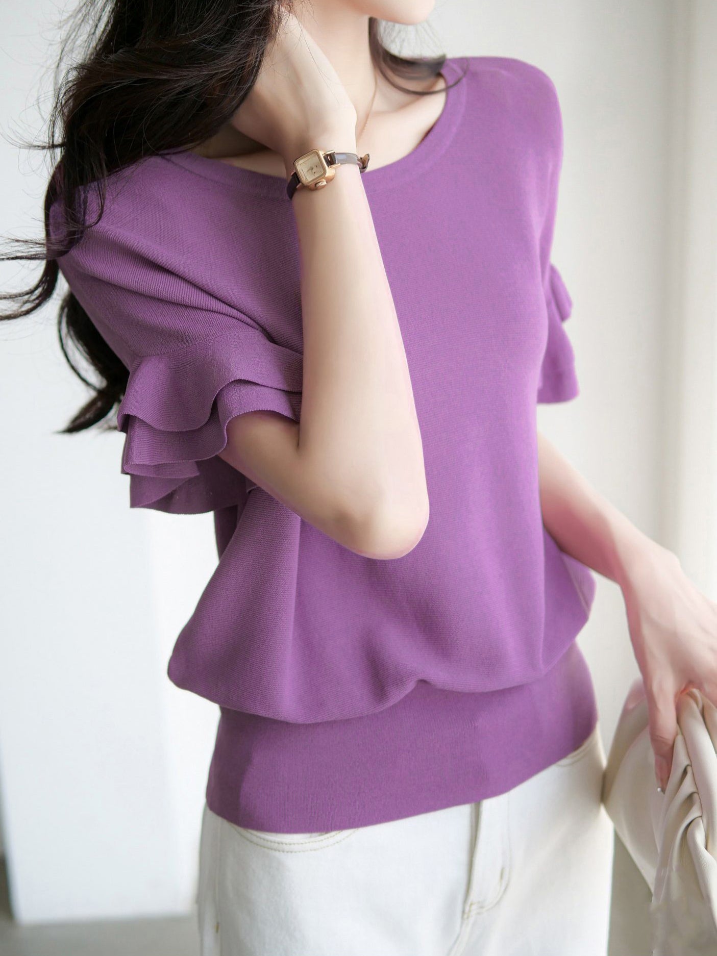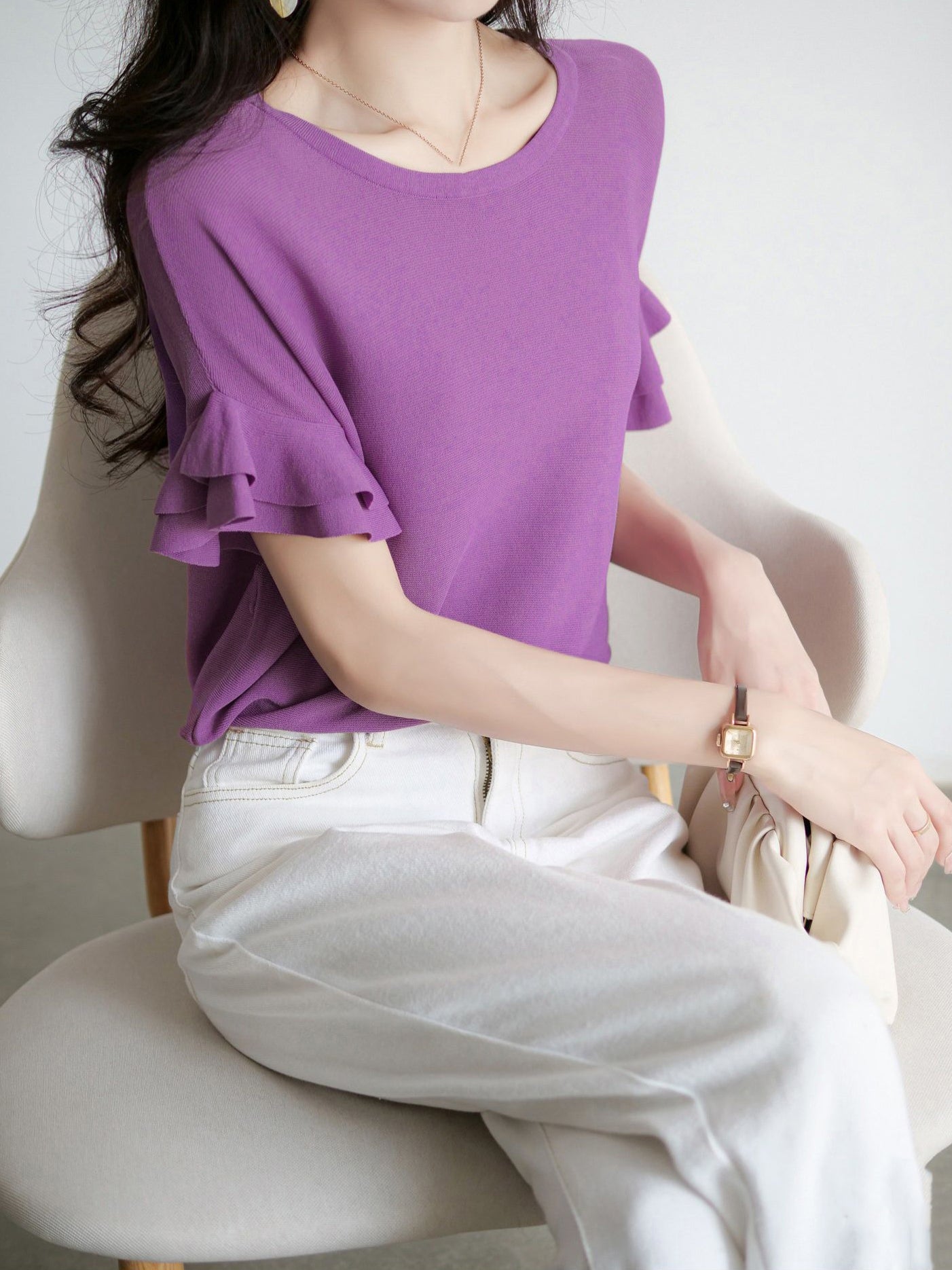This top features fluttering double flared sleeves that give it an elegant and feminine impression.