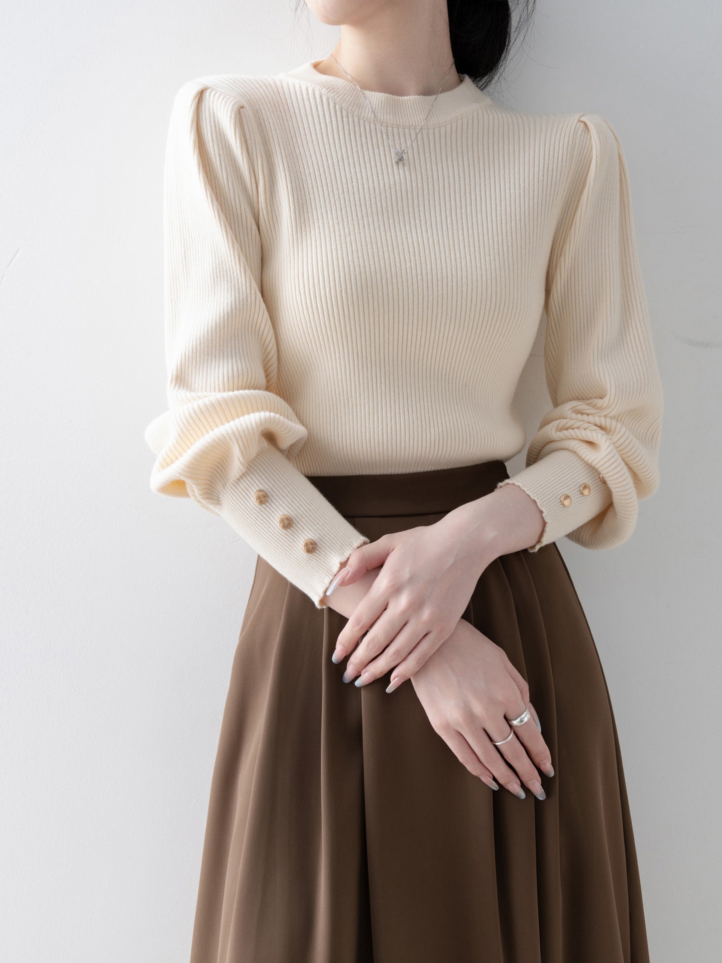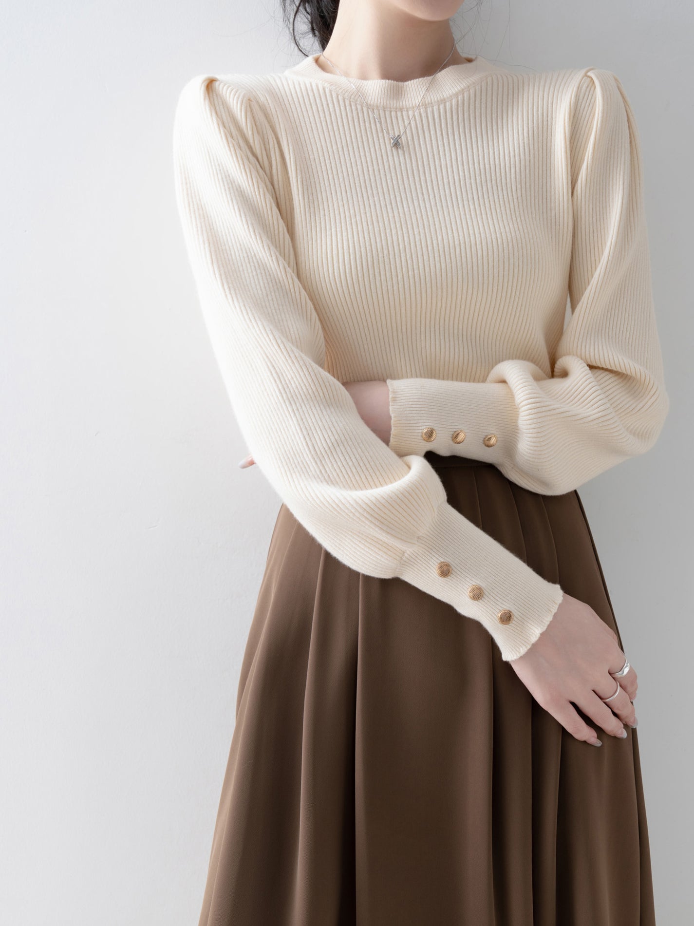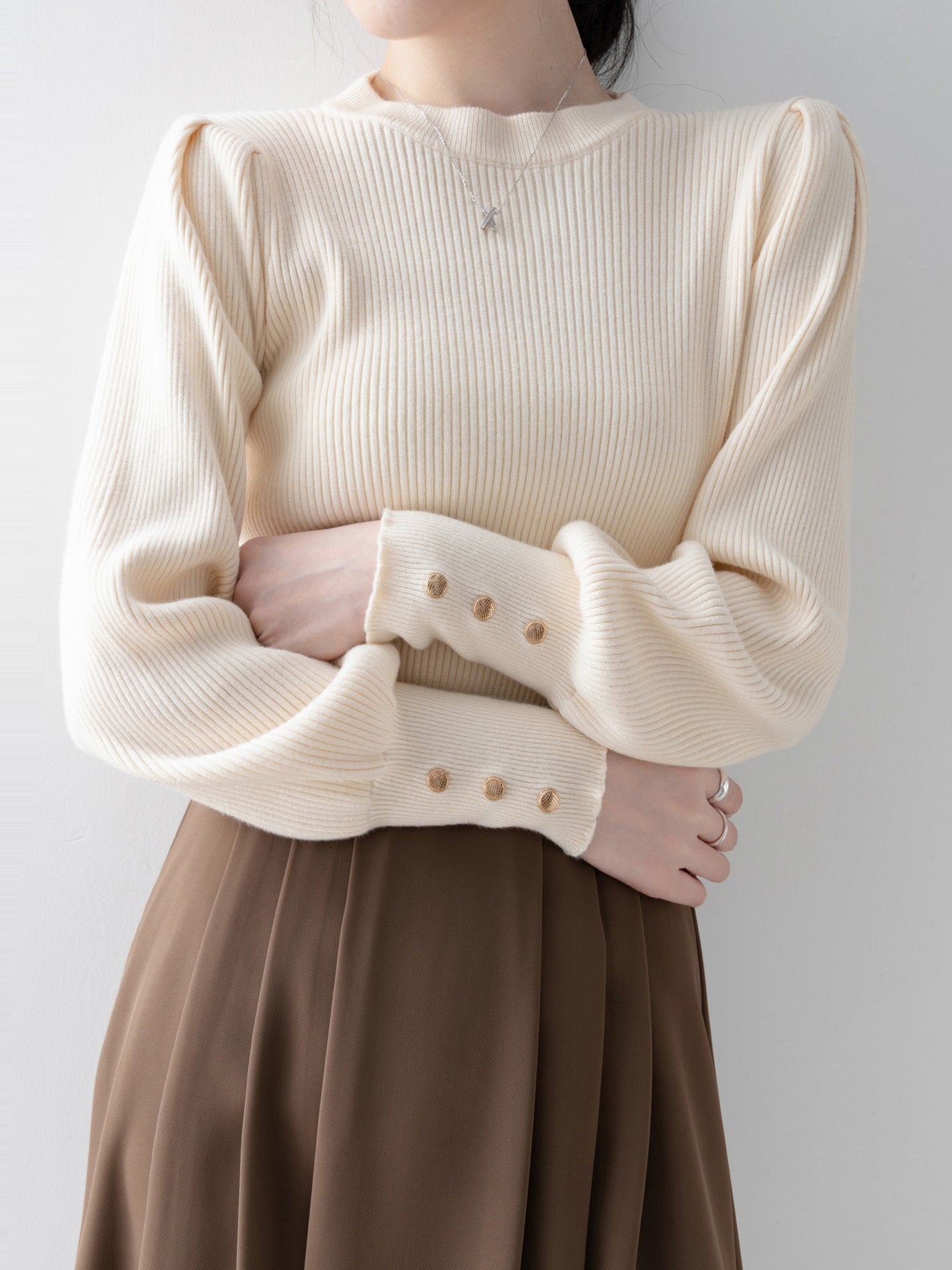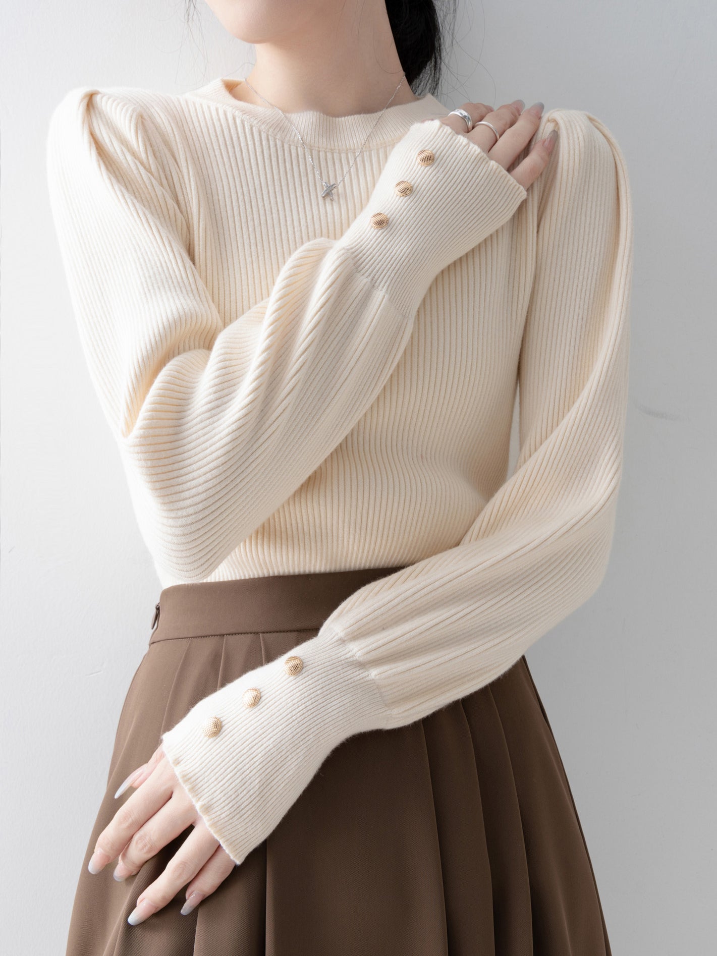 This knit has long cuffs and buttons for a feminine look.