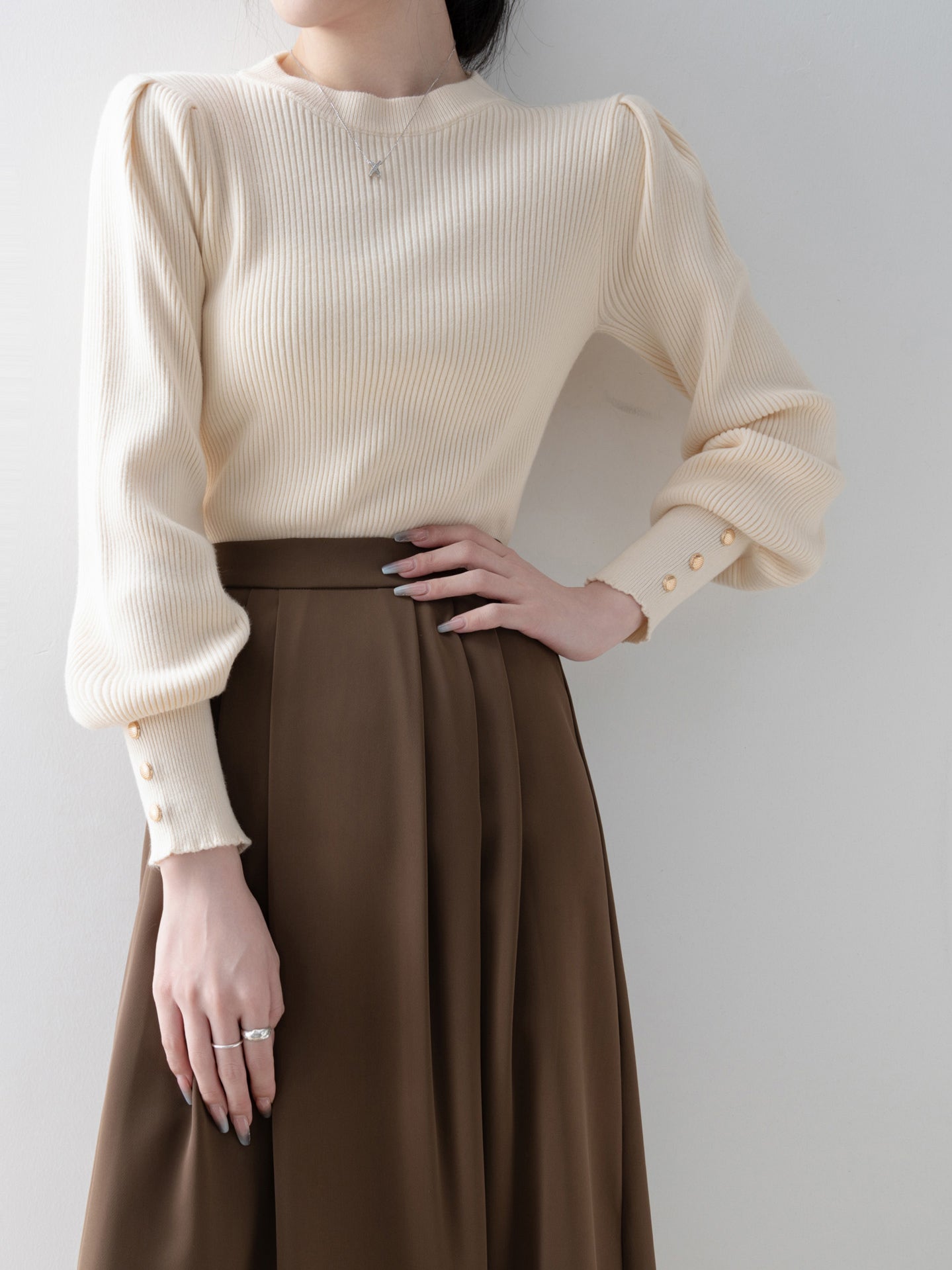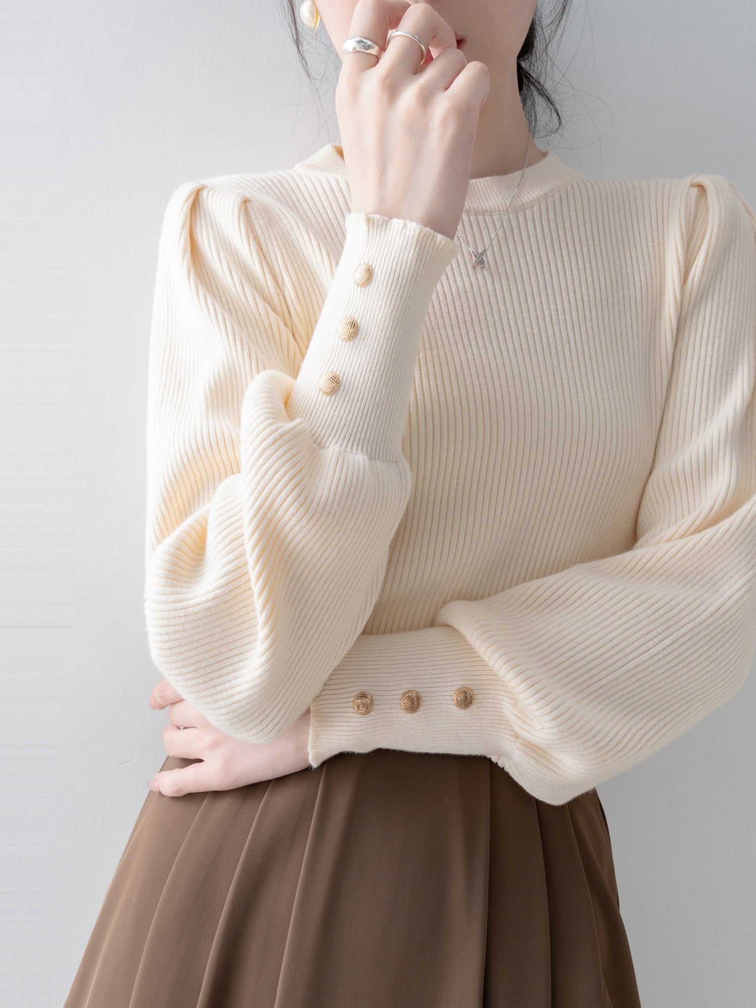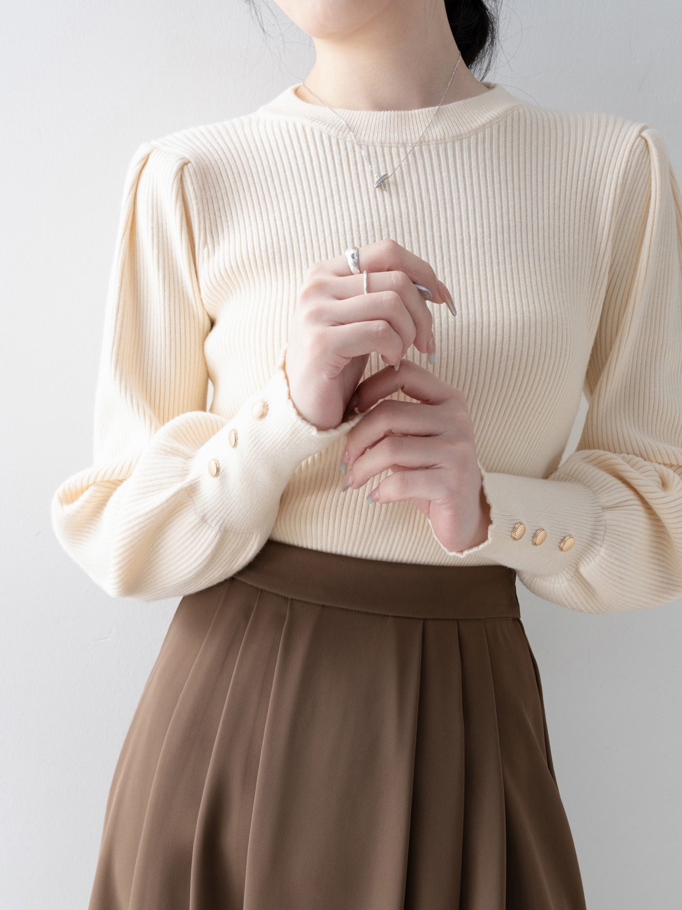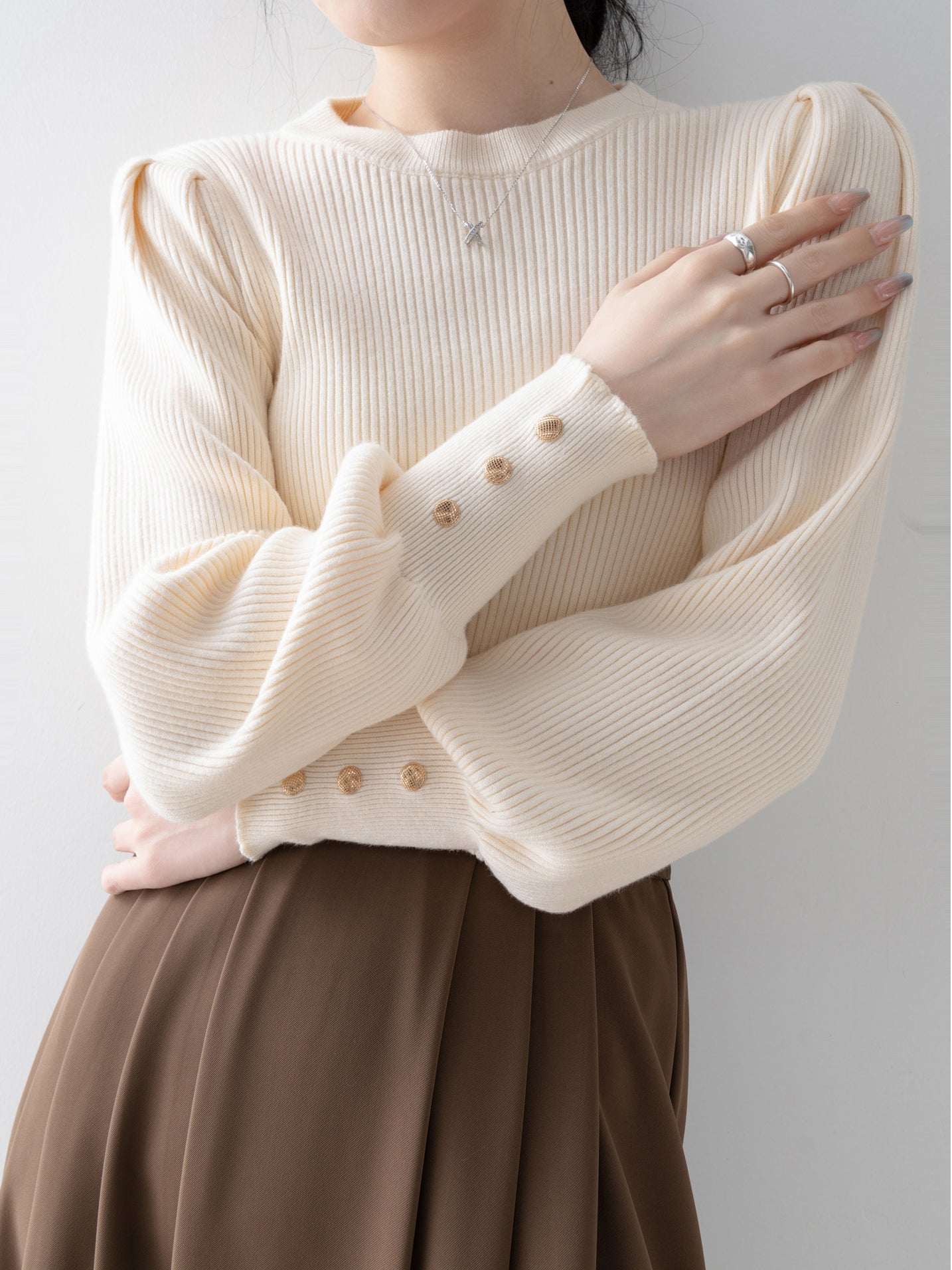 This knit has long cuffs and buttons for a feminine look.
