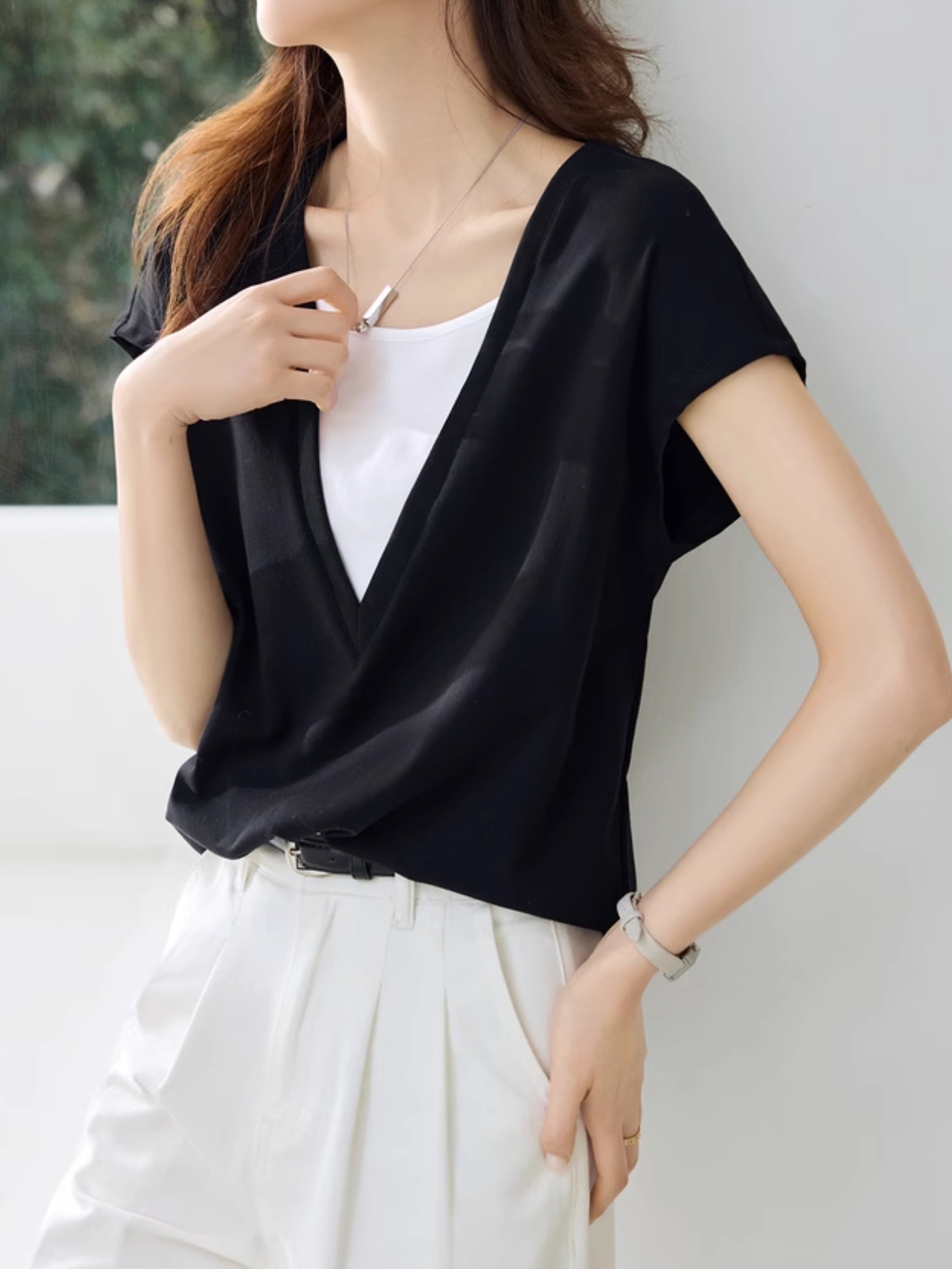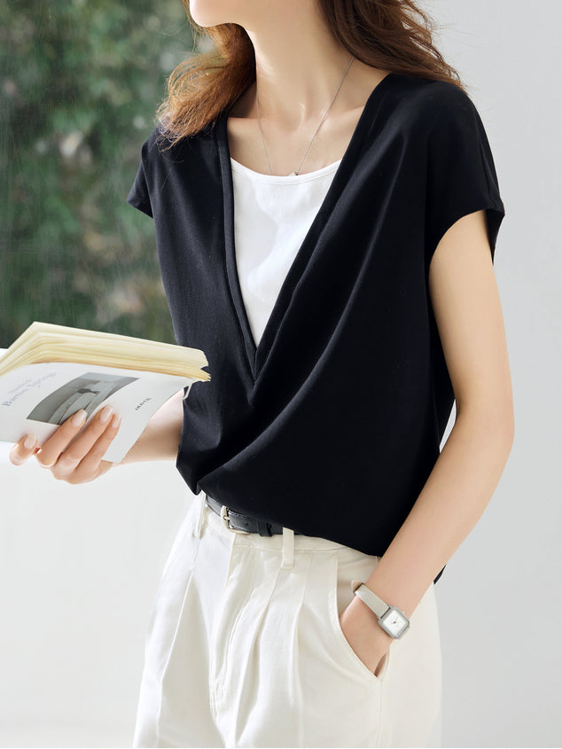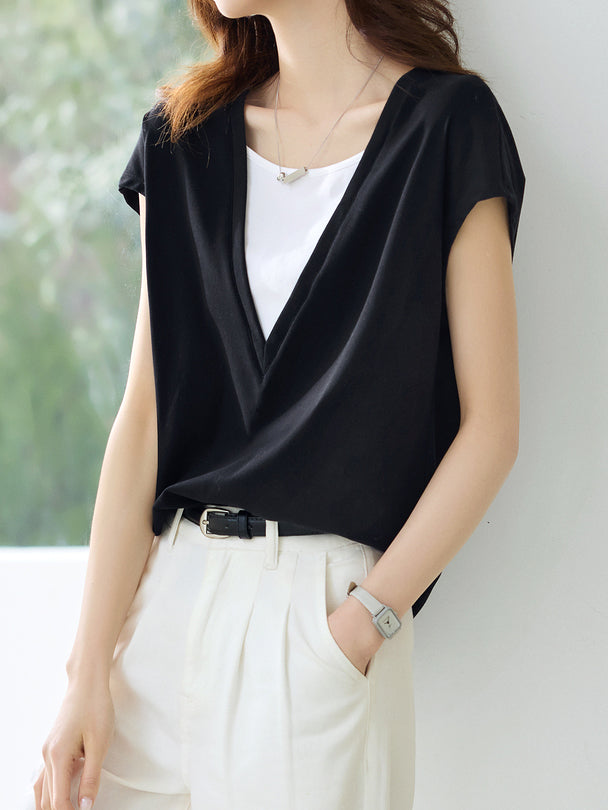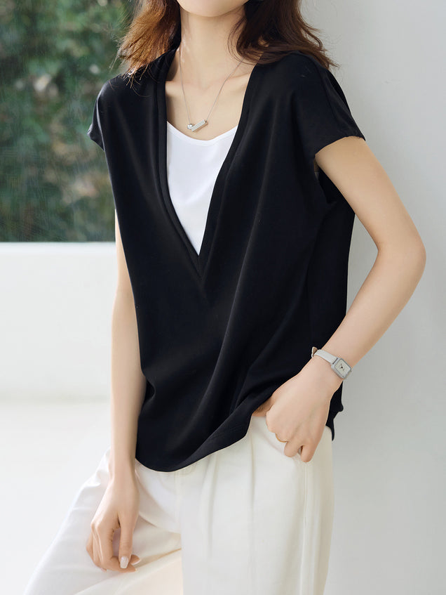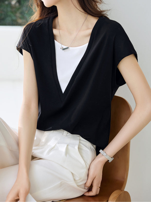 Deep V-neck color-blocked layered T-shirt