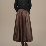 This eco-leather balloon skirt has a soft, glossy texture.