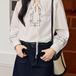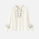 An ethnic-style blouse with delicate color-coordinated embroidery.