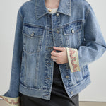 A denim jacket with a beautiful floral print boldly applied to the cuffs .