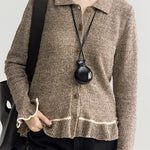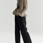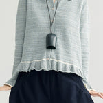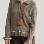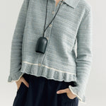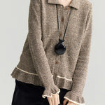 A collared cardigan with trendy ruffles at the hem and cuffs.