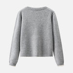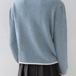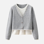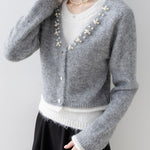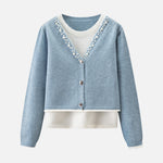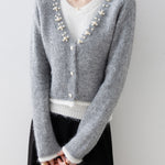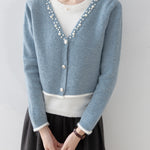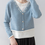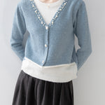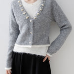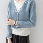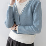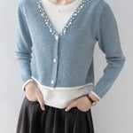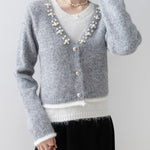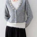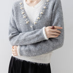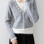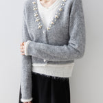 A gorgeous knit with pearl decoration along the V-line .