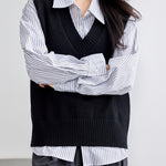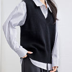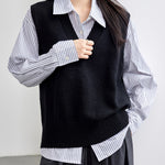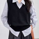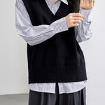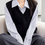 The set features a basic V -neck vest, which can be layered over a striped shirt to complete the look.