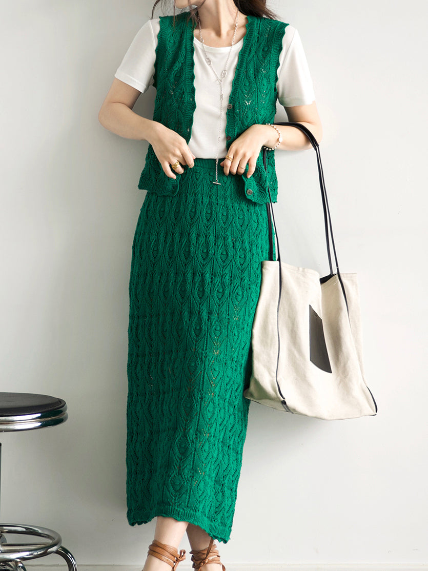 V-neck crochet knit vest + crochet long skirt SET (2 colors)