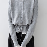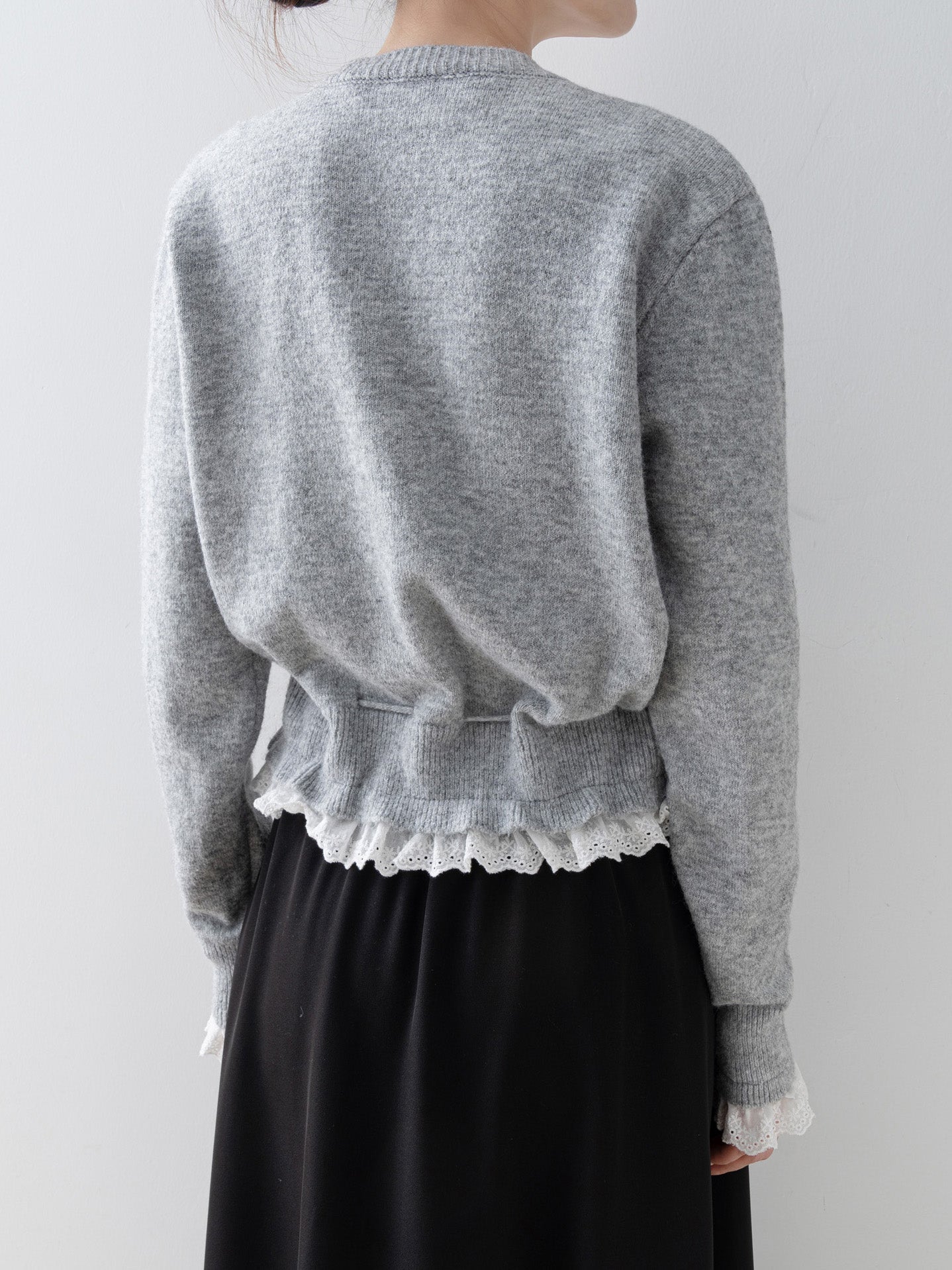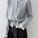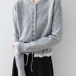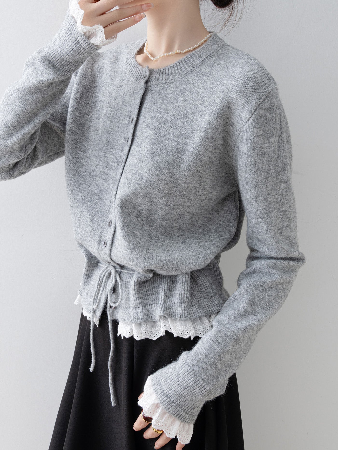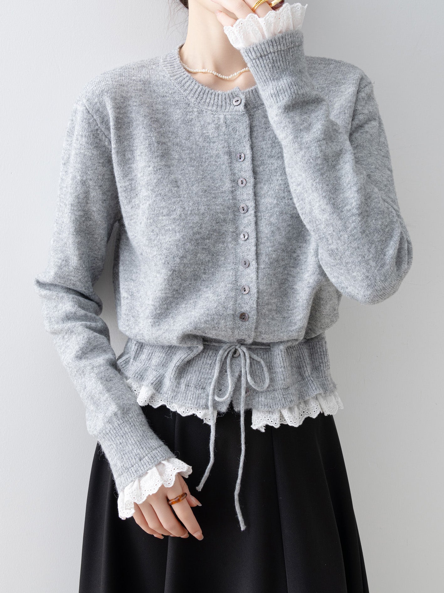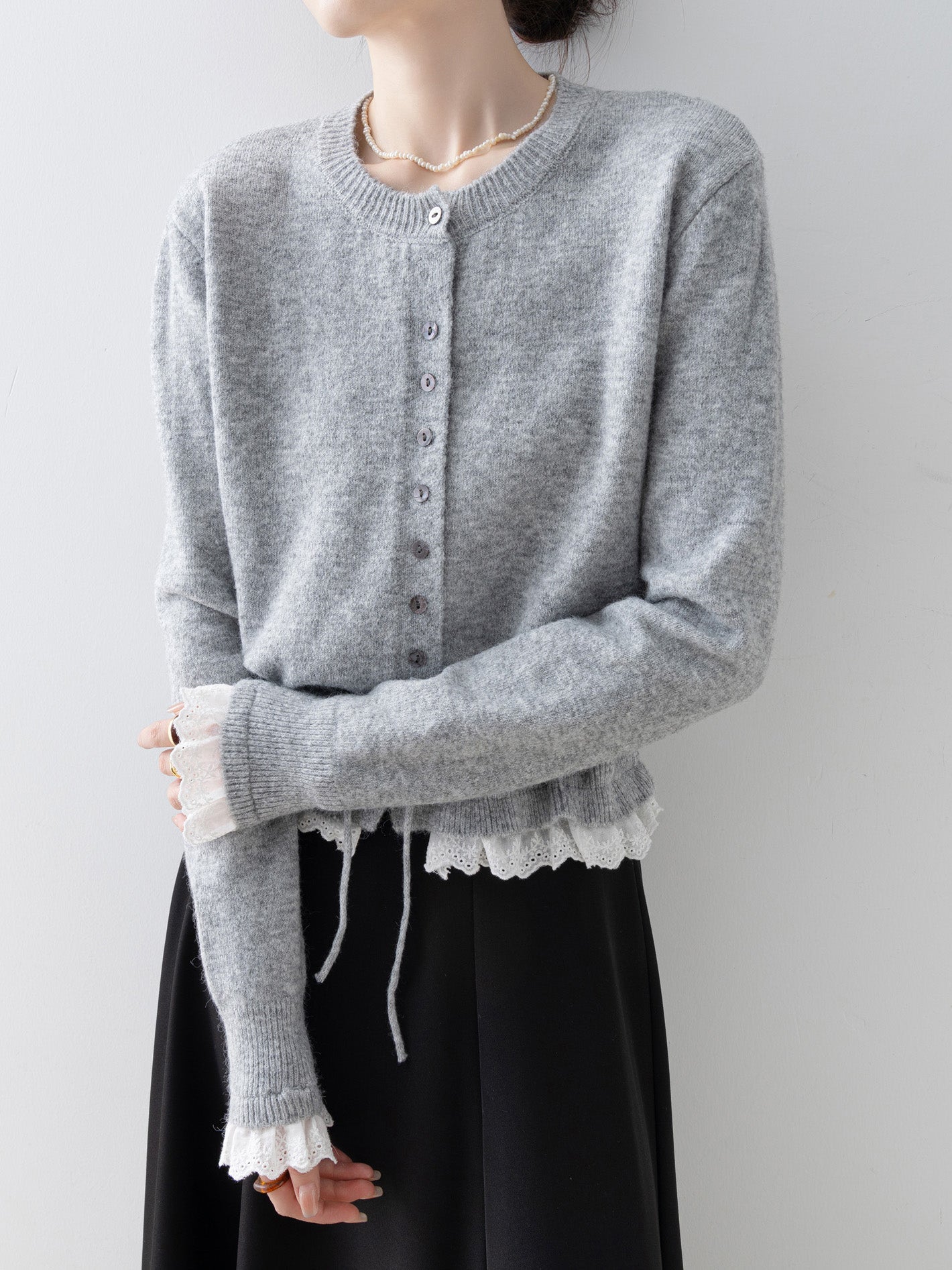 This cardigan is eye-catching with its row of buttons on the front and lace on the hem and sleeves.
