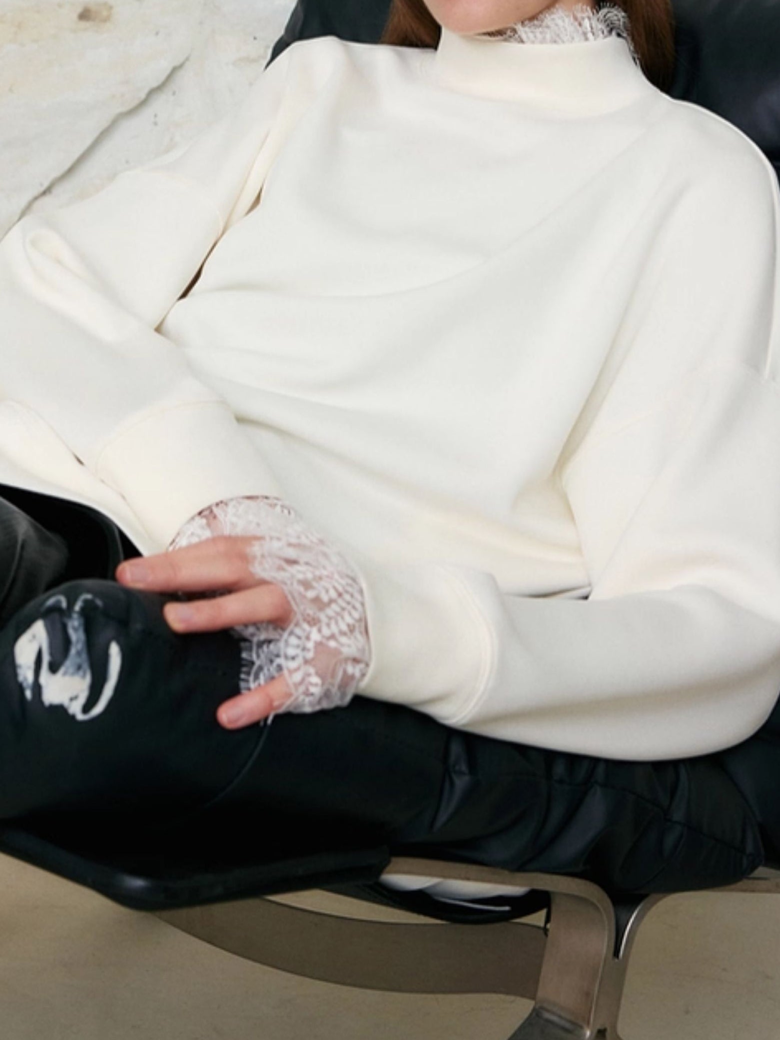 A long-sleeved sweatshirt featuring striking lace on the collar and cuffs.