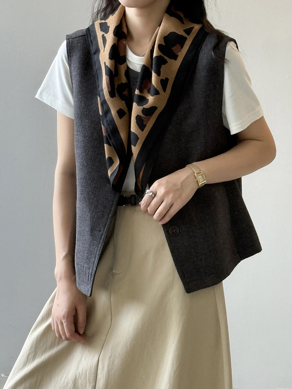 Leopard print collarless gilet with scarf (2 colors)