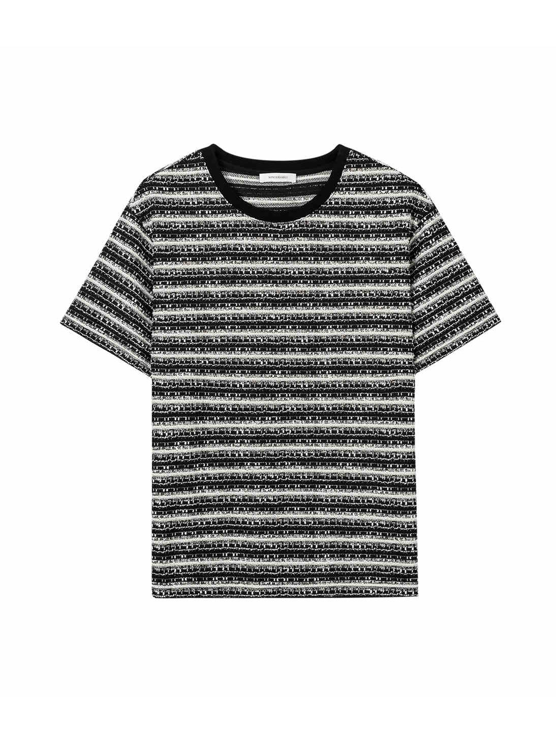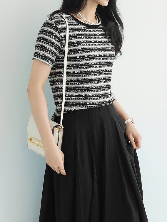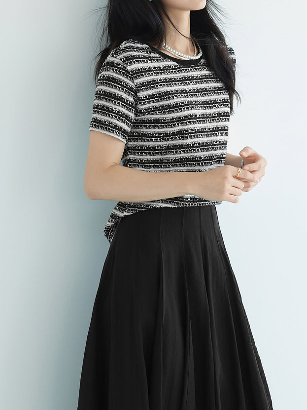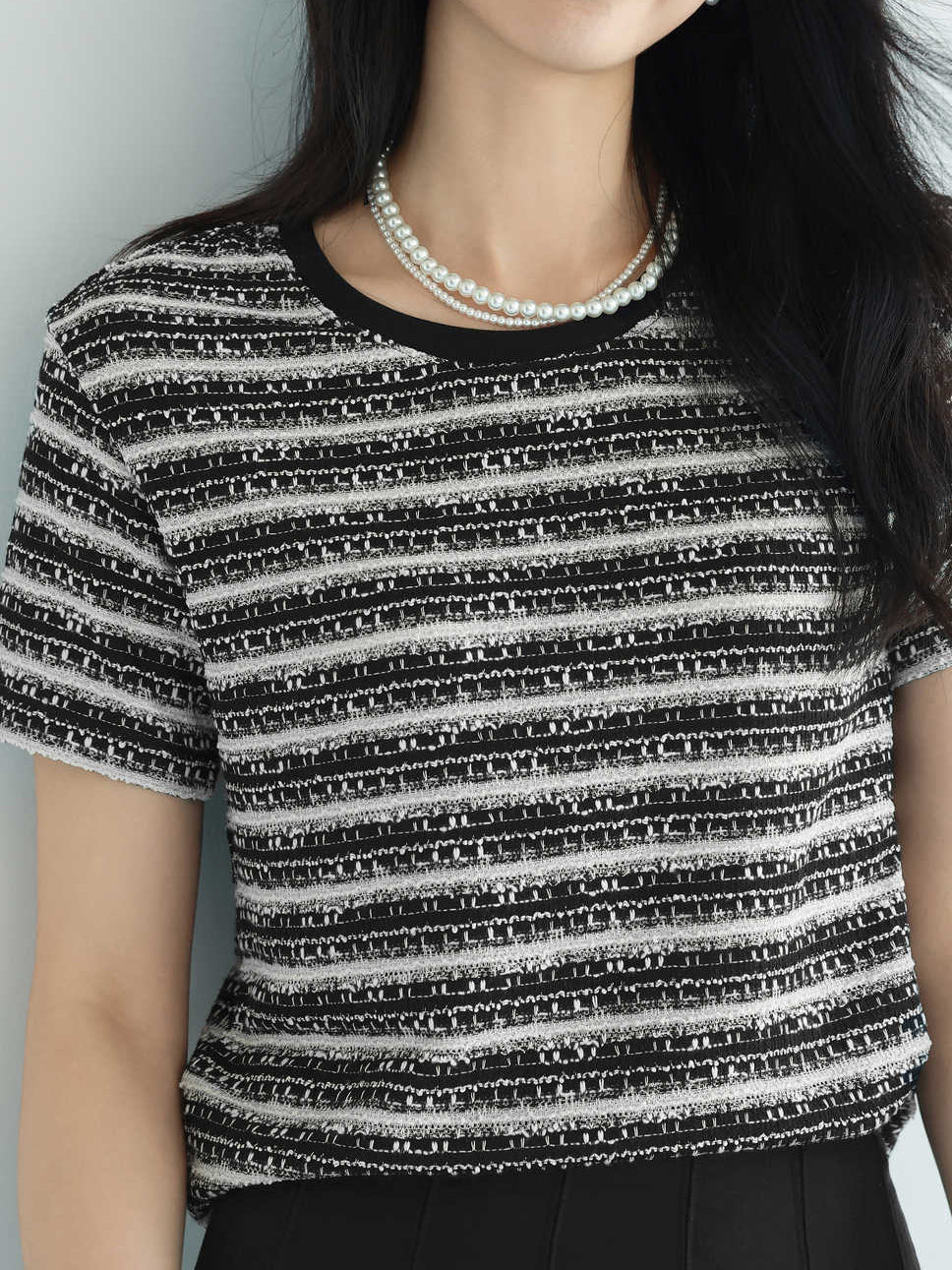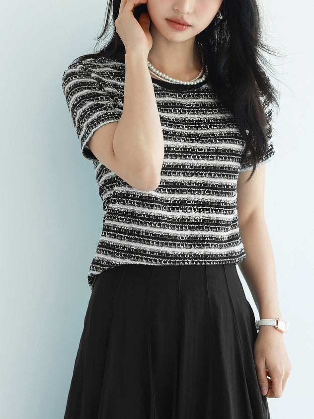 A short-sleeved knit pullover made from rough-textured tweed fabric.