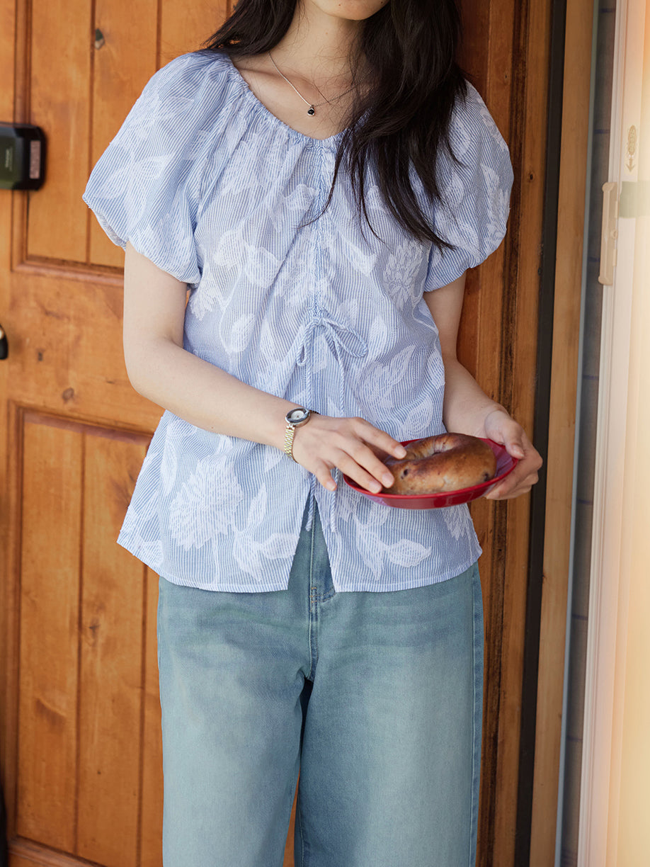 Flower Stripe Drawstring Gathered Blouse