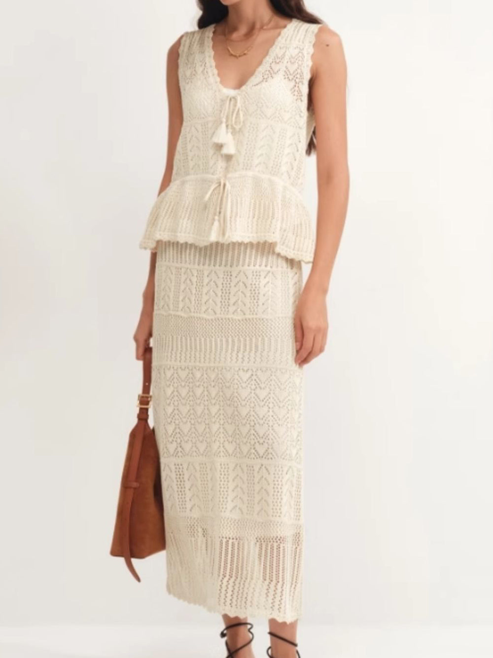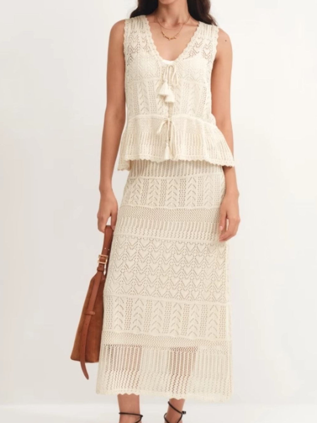 Tassel Mesh Knit Peplum Top + Openwork Mesh Knit Skirt Set (2 Colors)