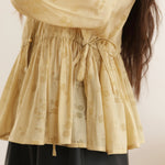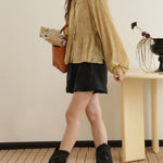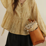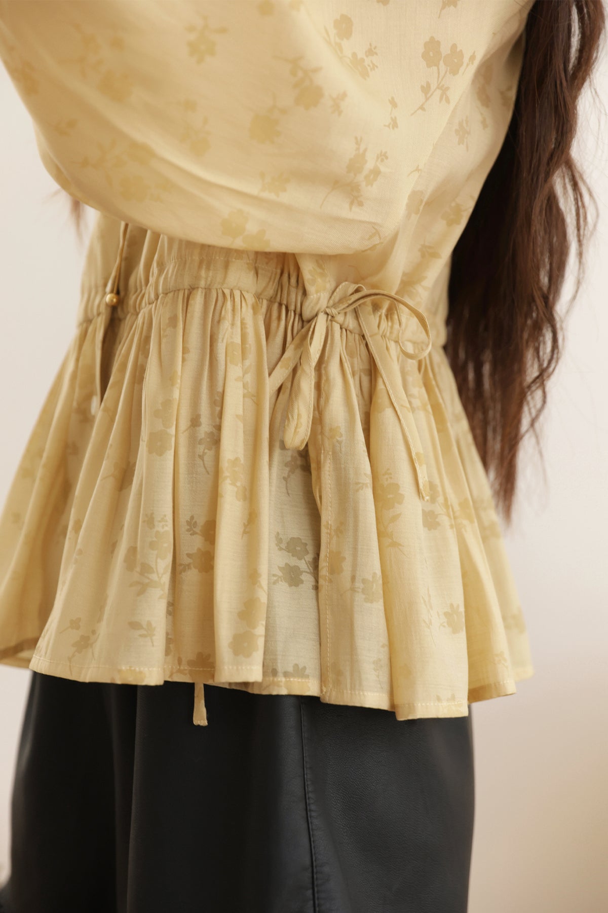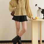 ☆襟元にはギャザーをあしらうことで、シルエットに華やかな立体感をプラスした。