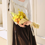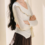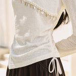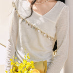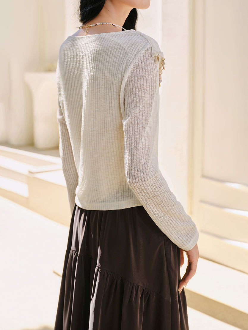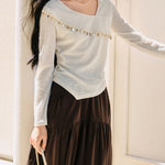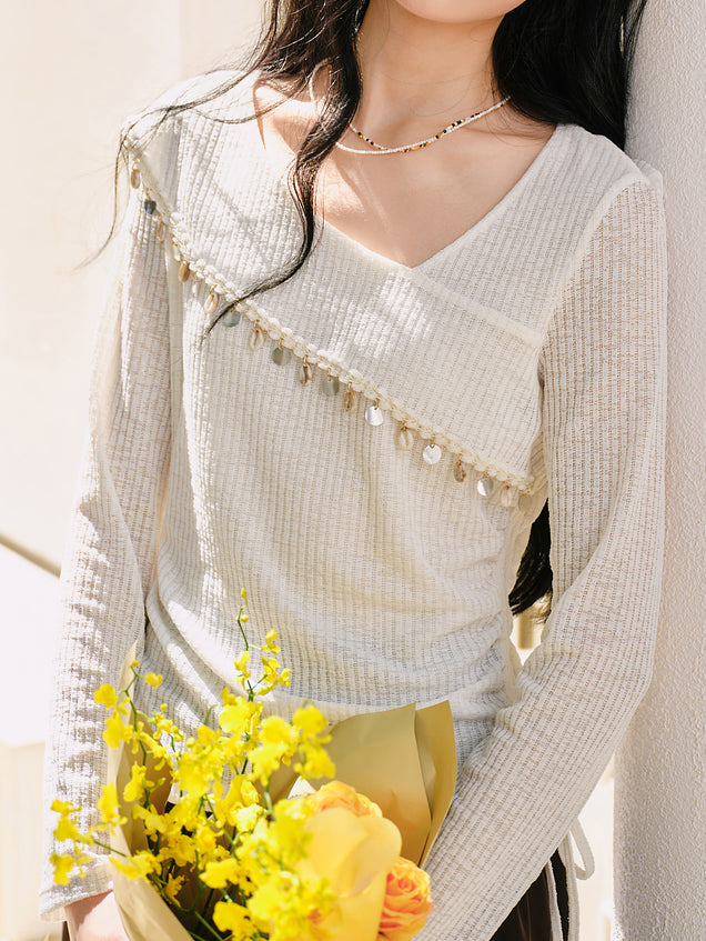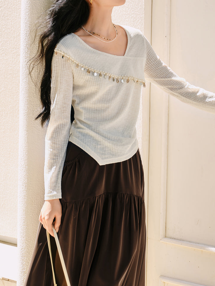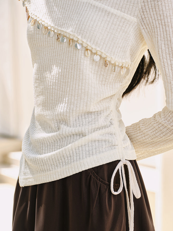 ☆胸元に斜めに飾った貝ビーズがトレンド感満載で、可愛くてフェミニンな雰囲気をプラス。