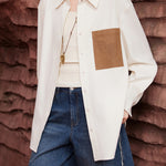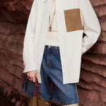 ☆片胸元にバイカラーポケットがカジュアルさと上品さのバランスが取れた。
