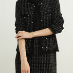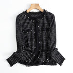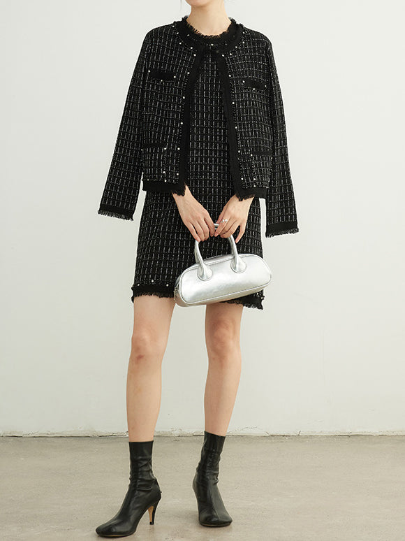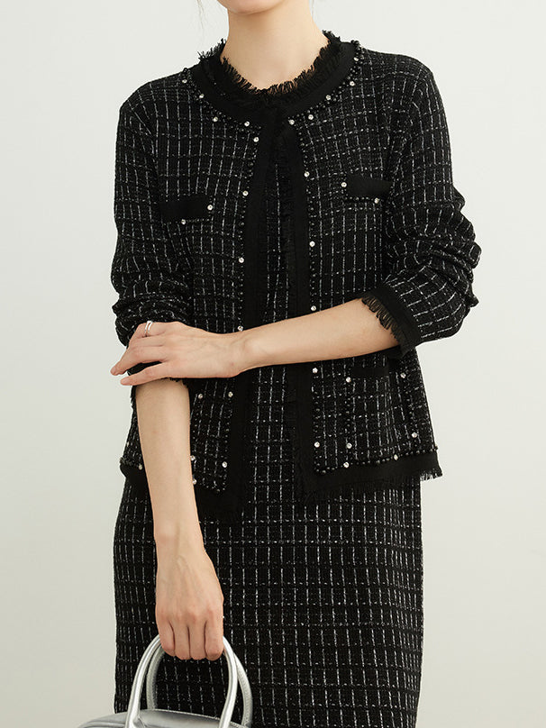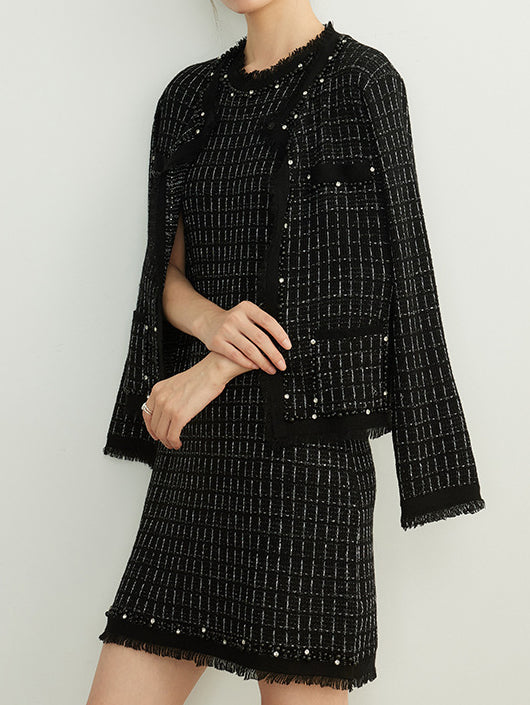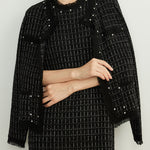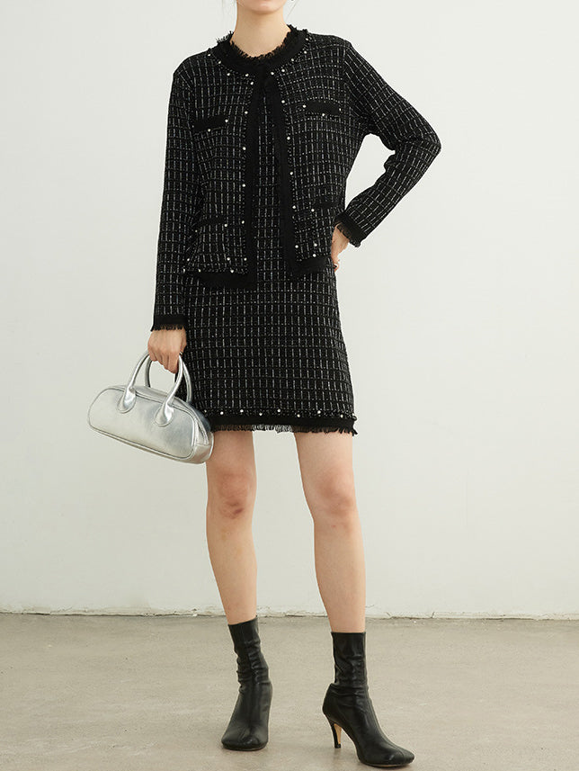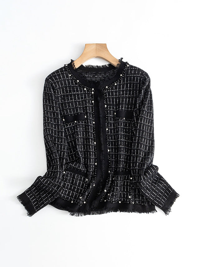 フリンジパールノーカラーウールツイードカーディガン