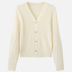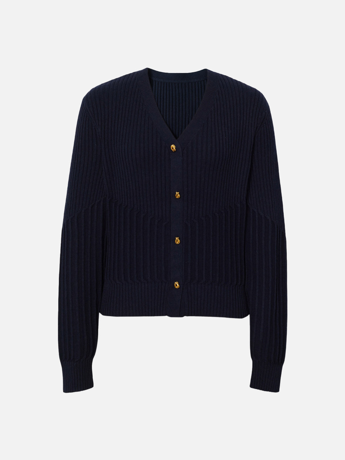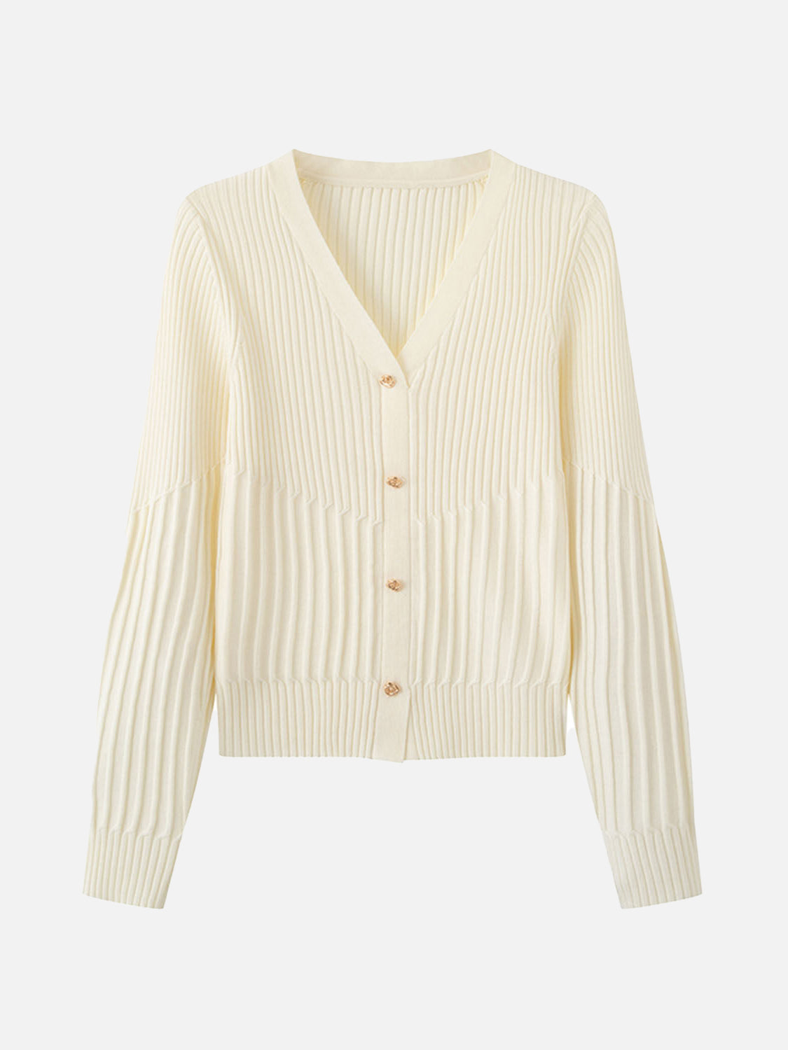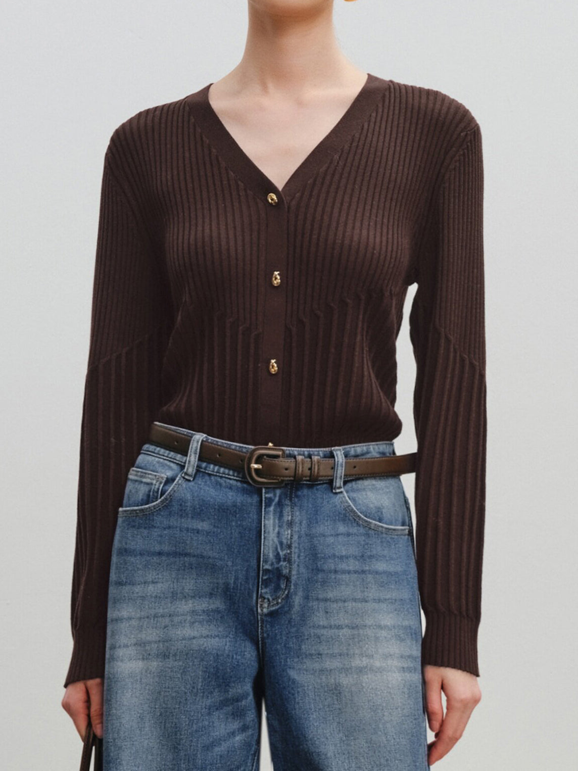リブ切替え、ボディラインがスッキリ見えるように仕上げるニットカーディガン。