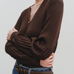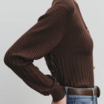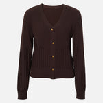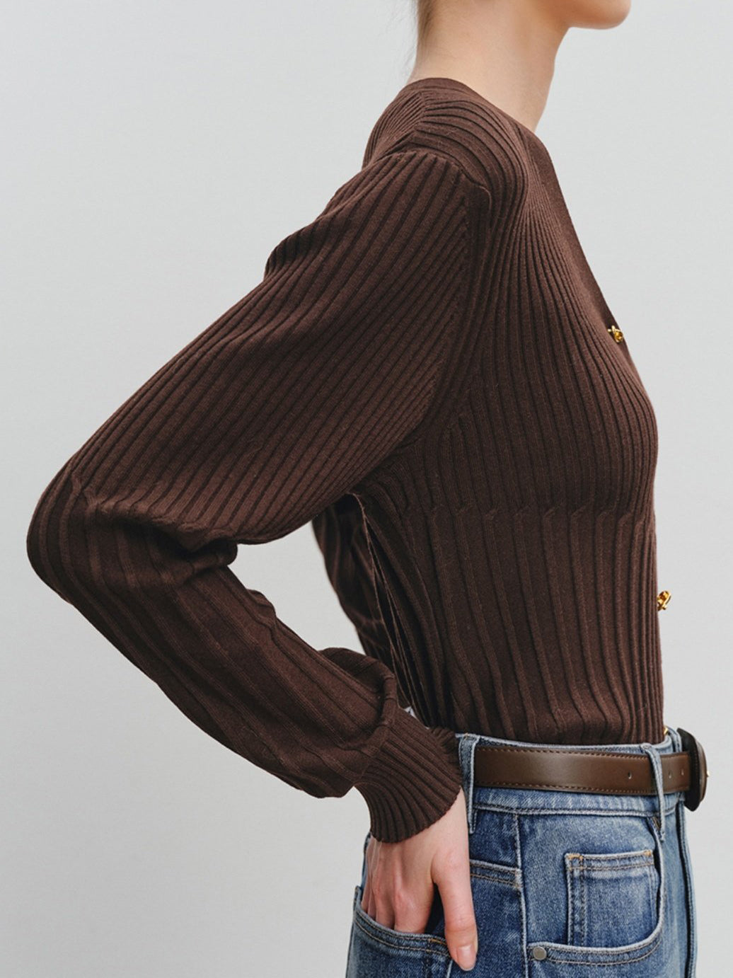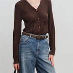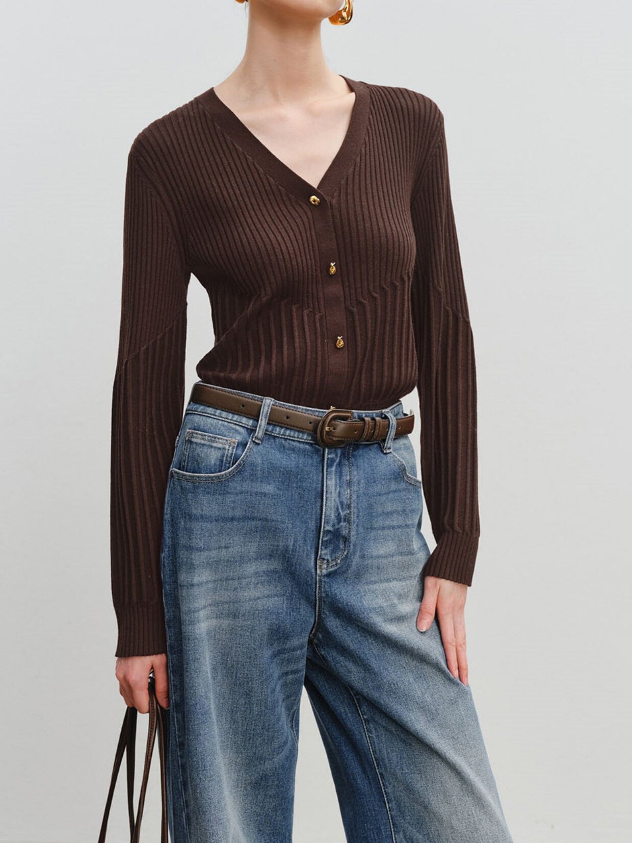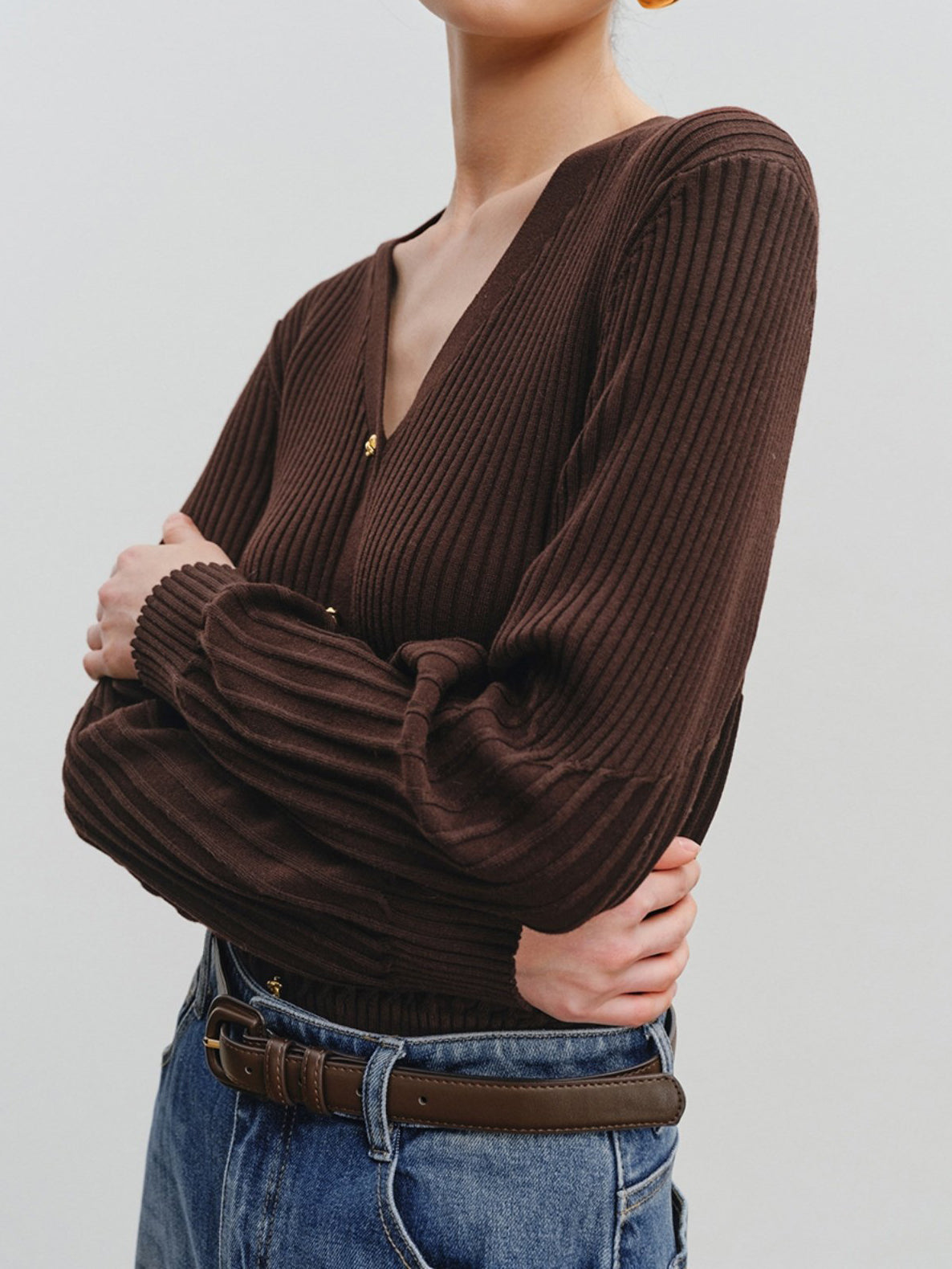 リブ切替え、ボディラインがスッキリ見えるように仕上げるニットカーディガン。