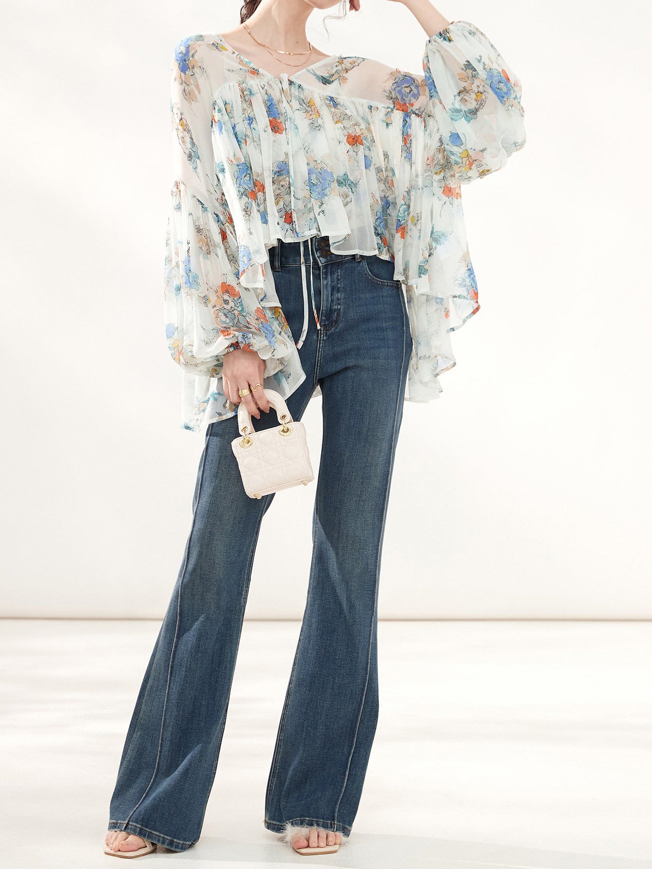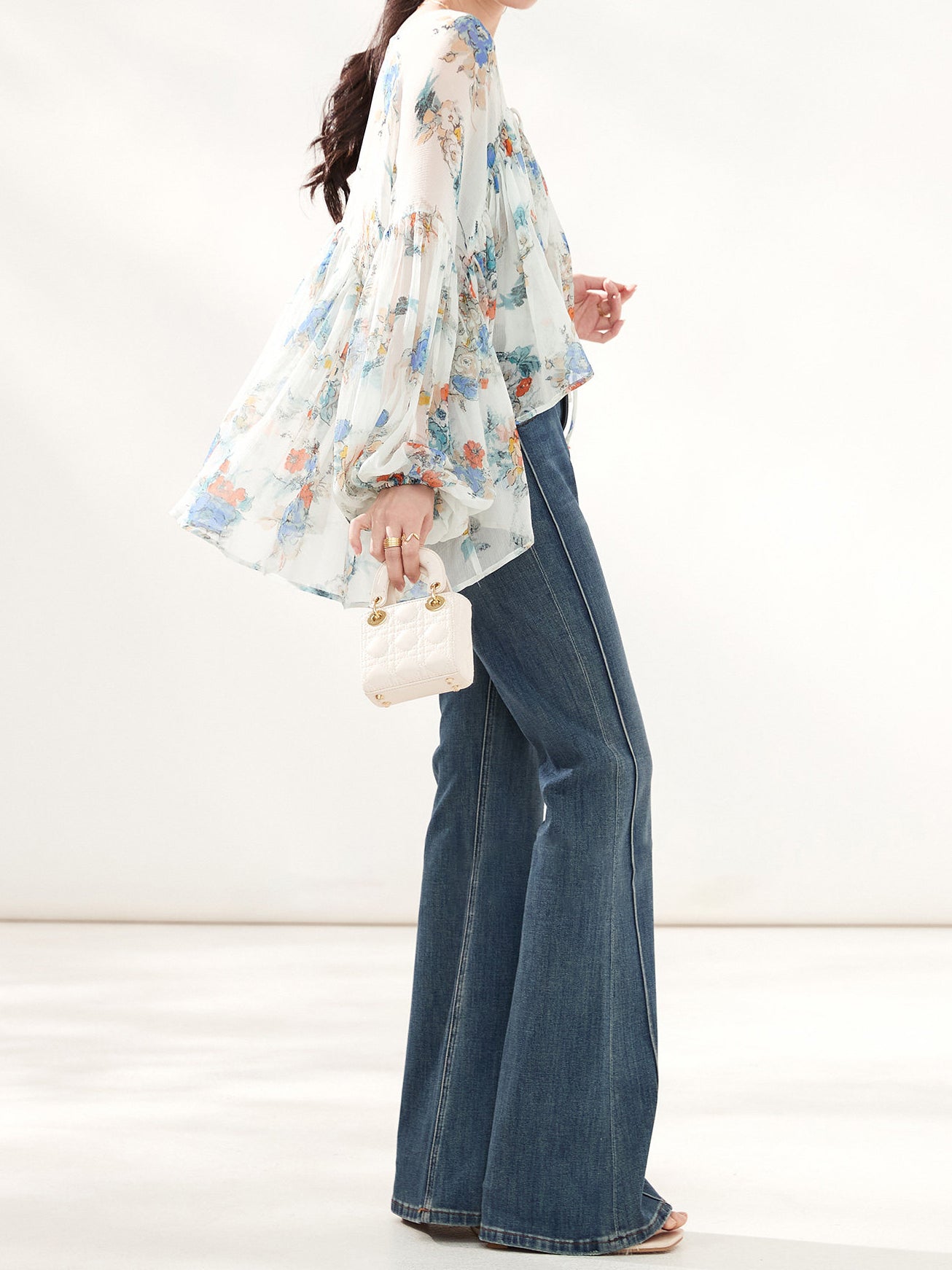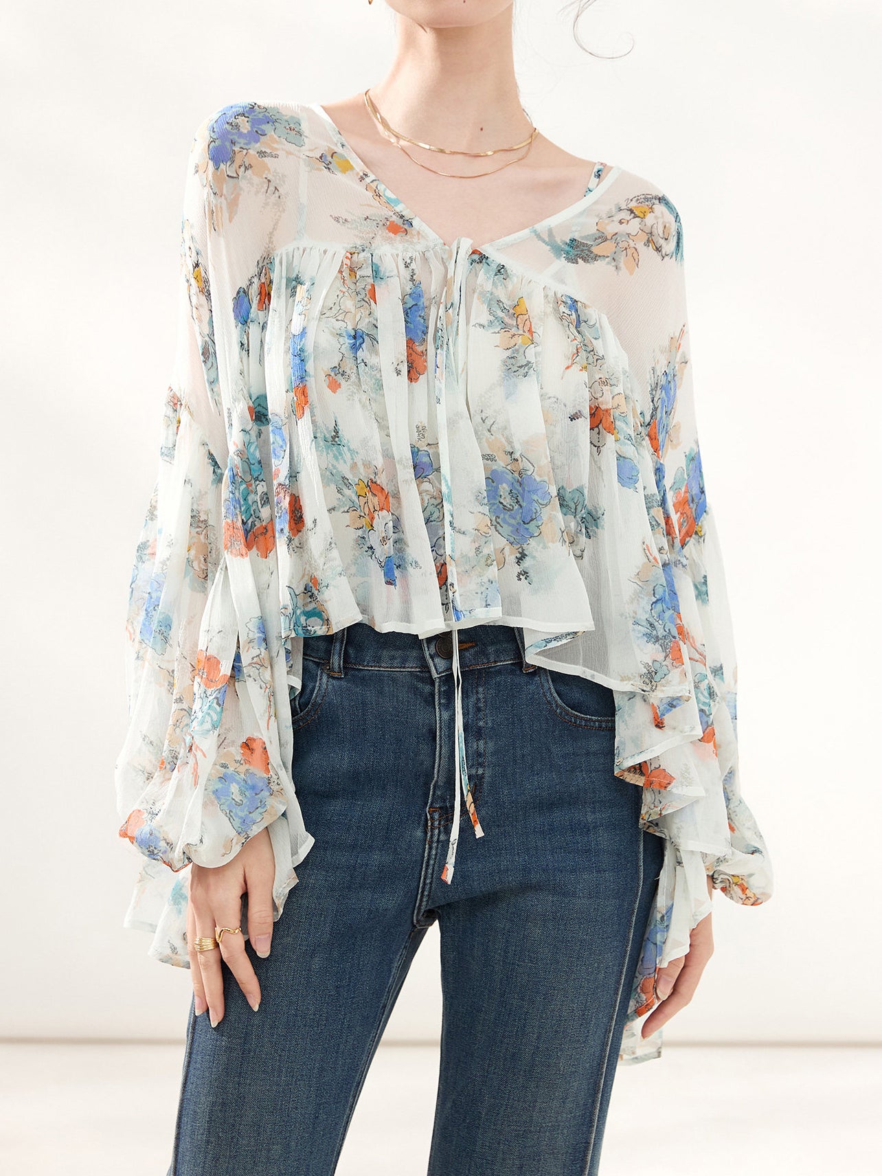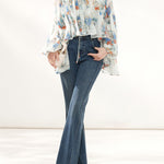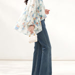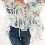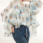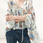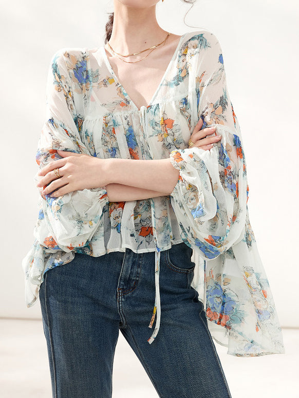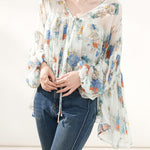 上品な花柄のプリントがシフォン生地に映え、エレガントさを際立たせるボリュームブラウス。