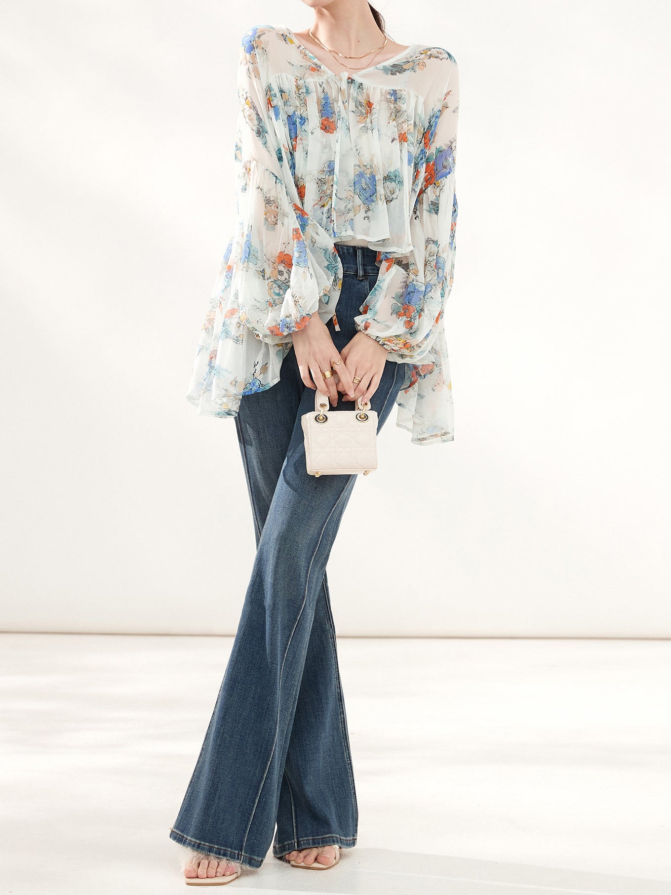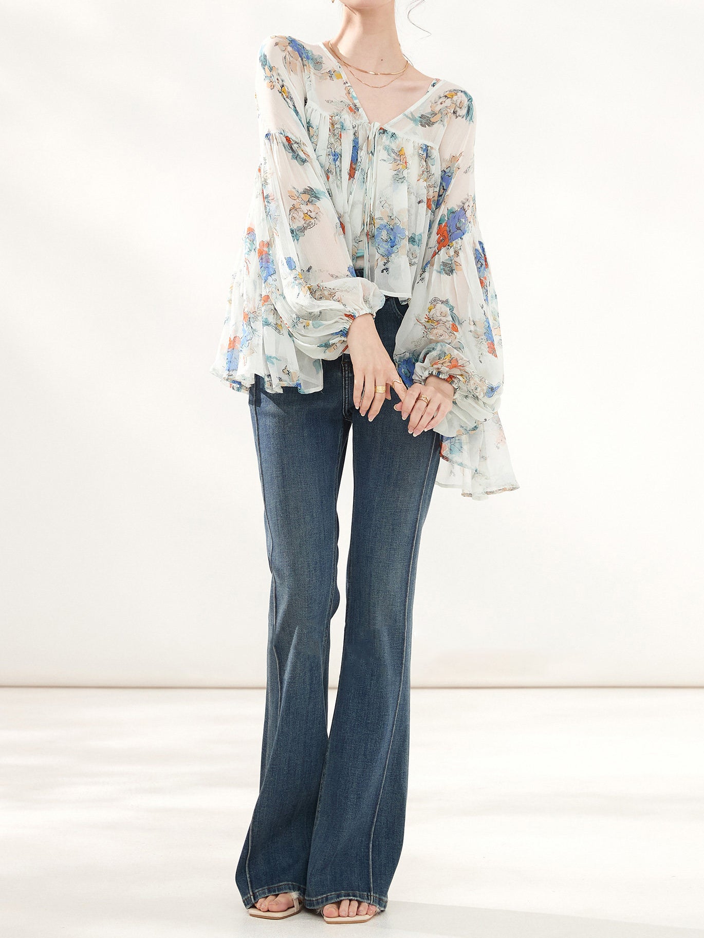 フラワープリントシフォンボリュームブラウス