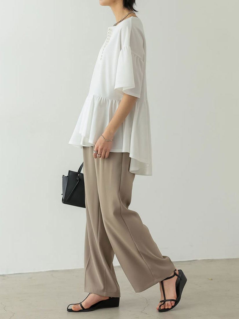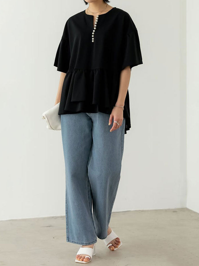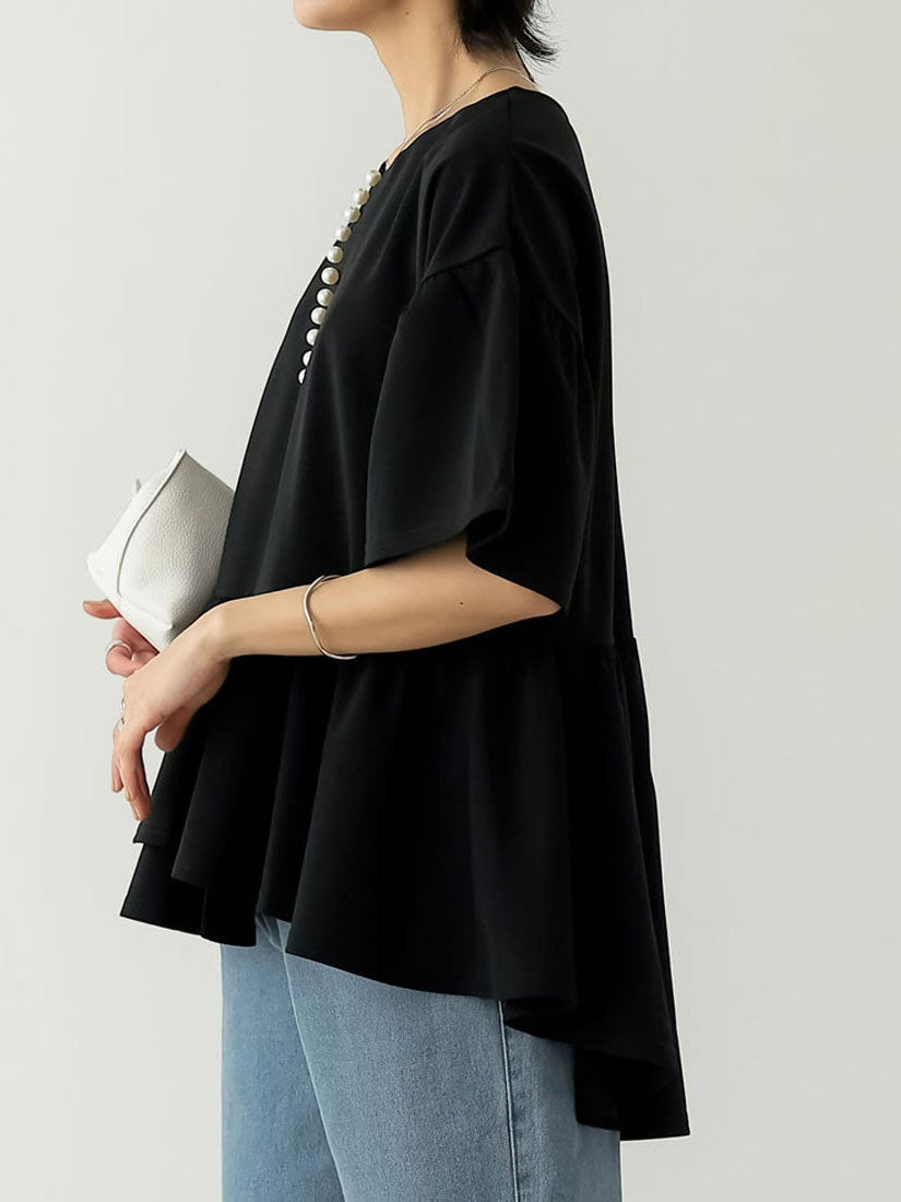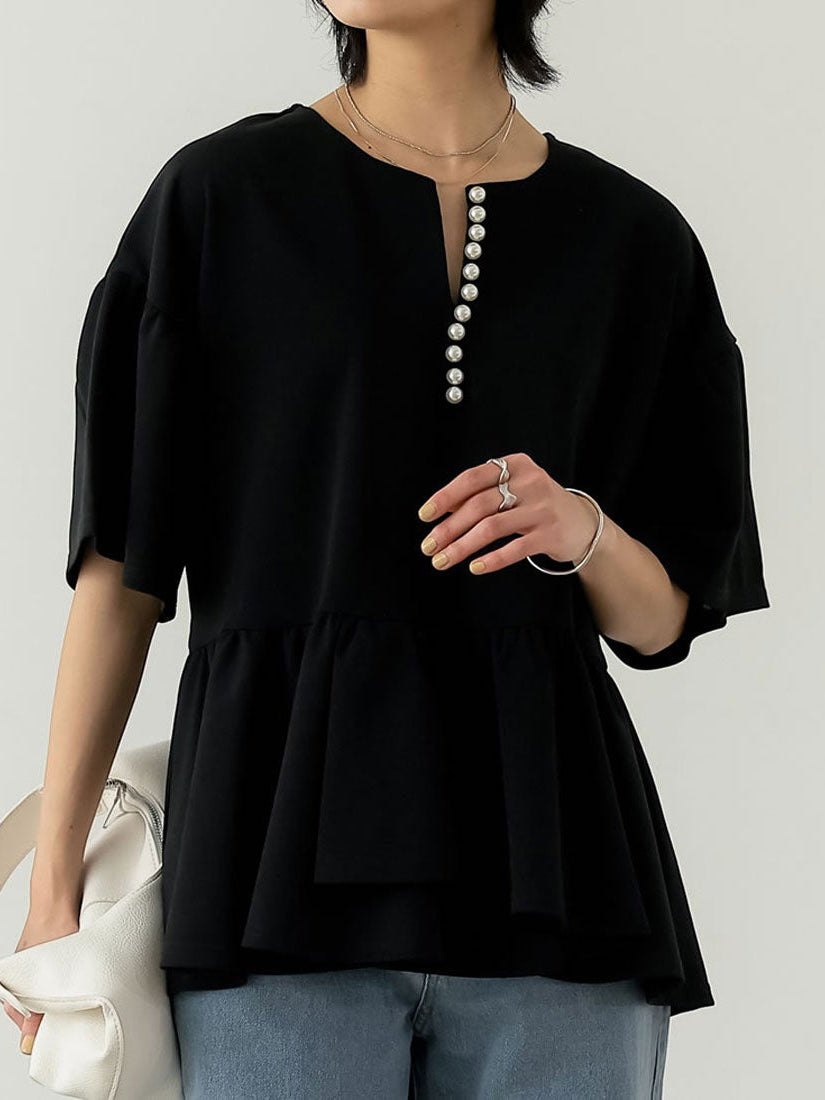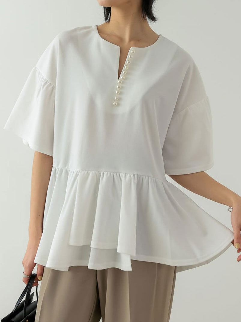 キーネック部分の連なったパールデザインがコーデのアクセントになるペプラムブラウス。