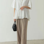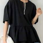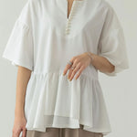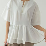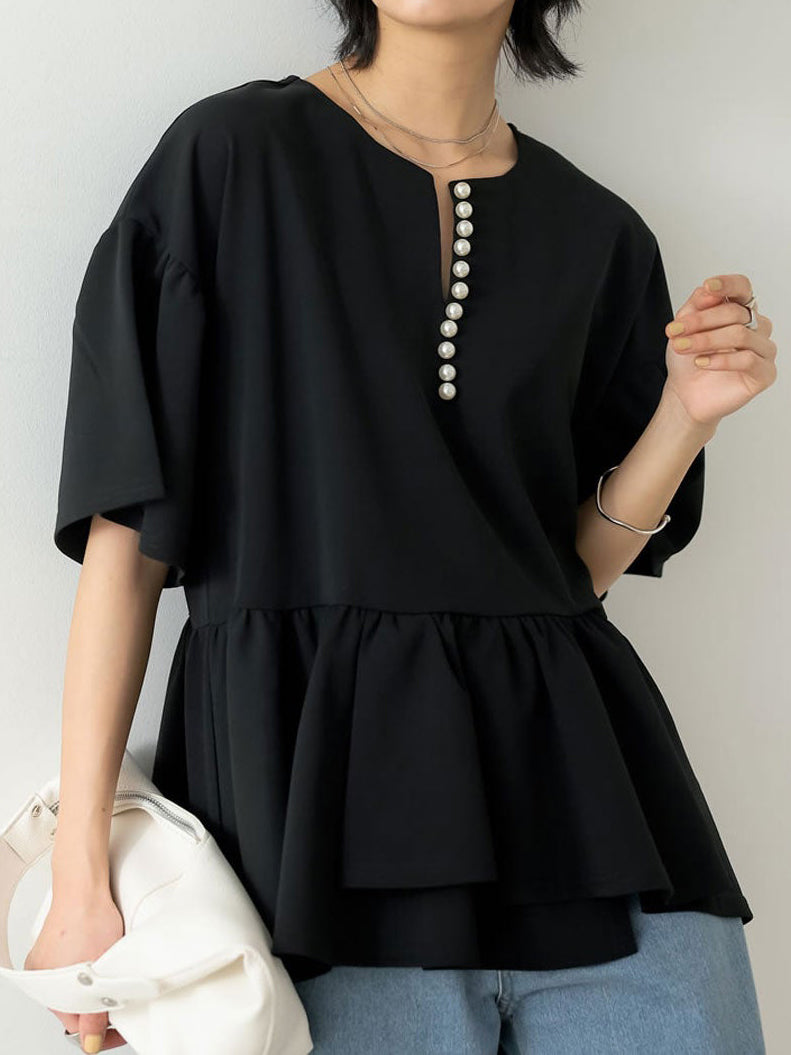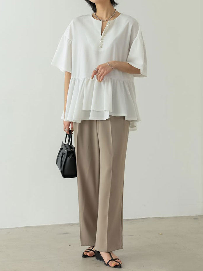 パール付きキーネックカットジョーゼットペプラムブラウス 2色入