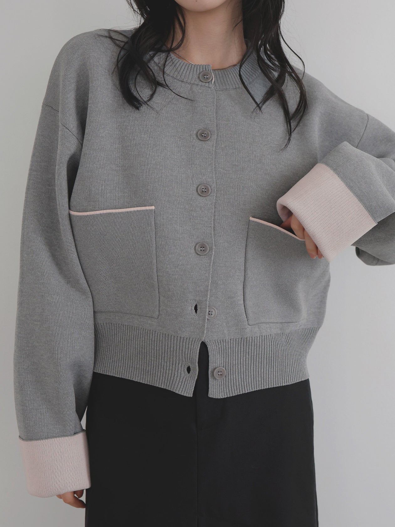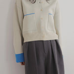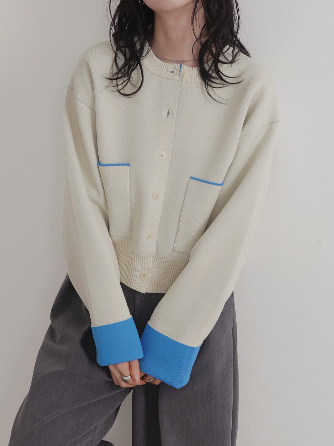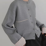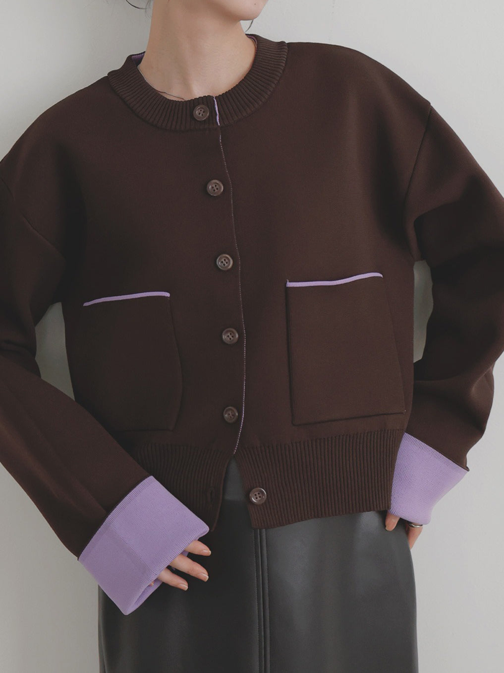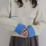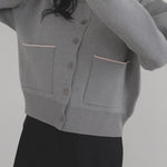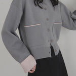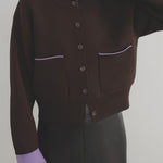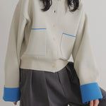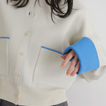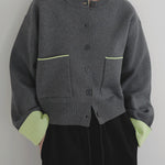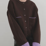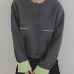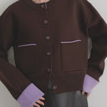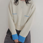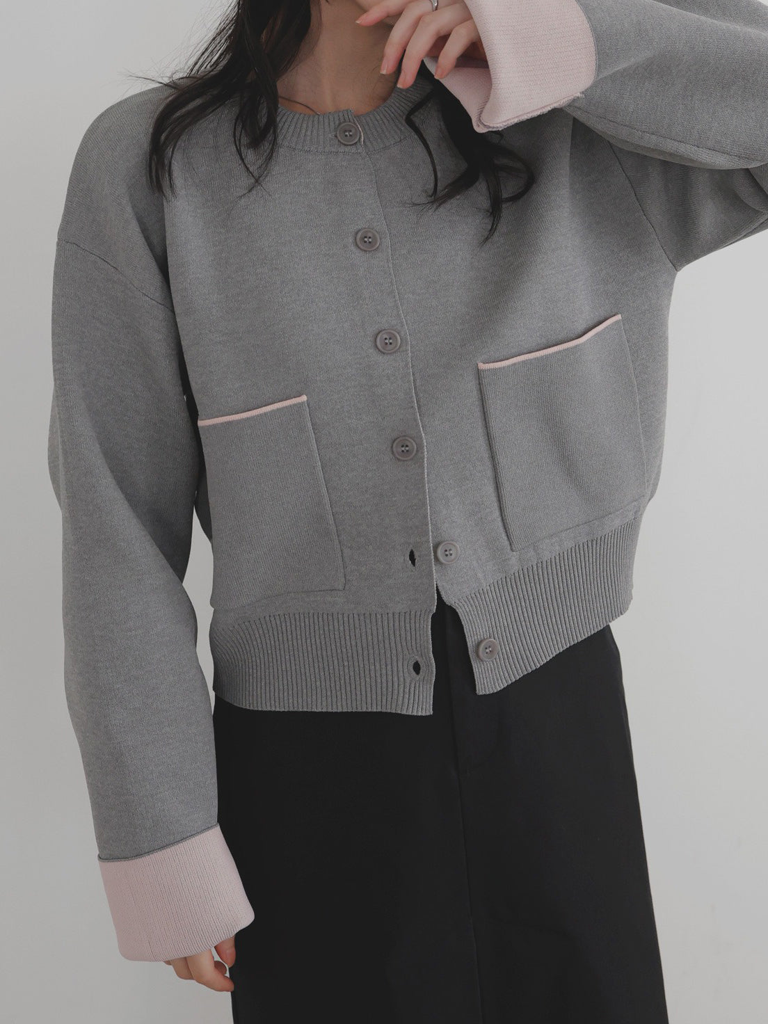 新鮮な配色のバイカラーが映えるポリエステルニットカーディガン。