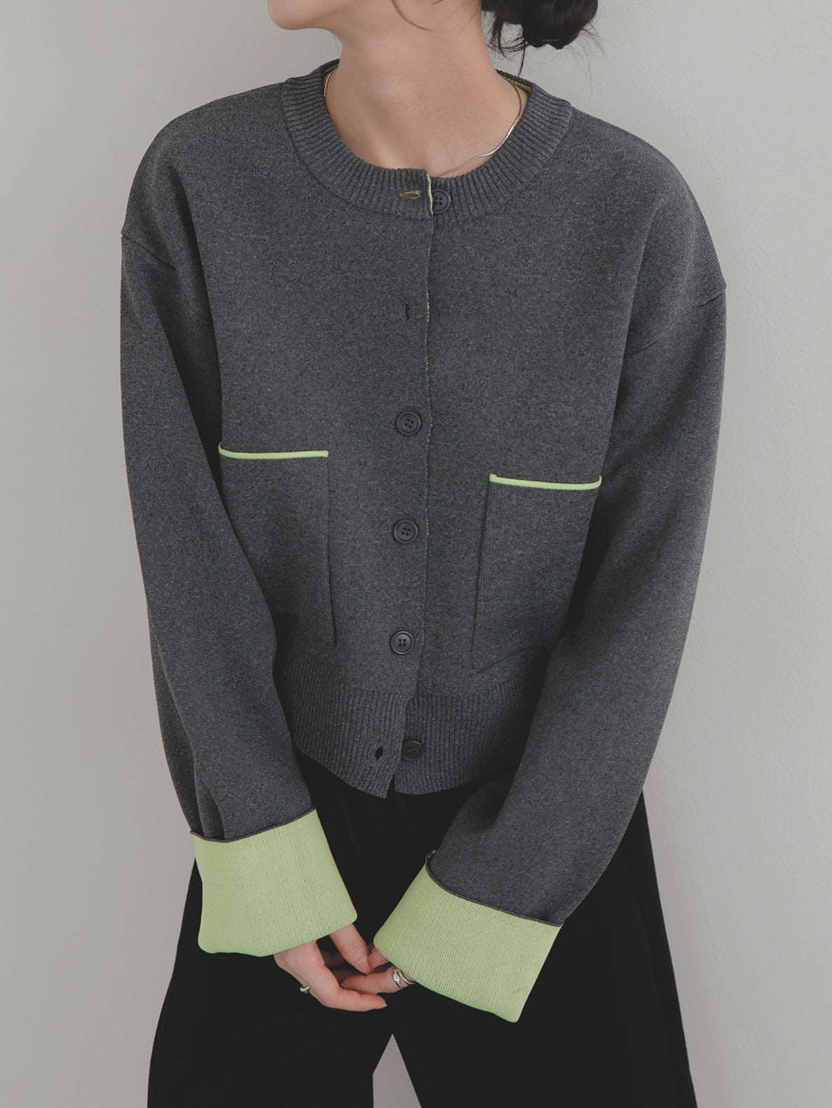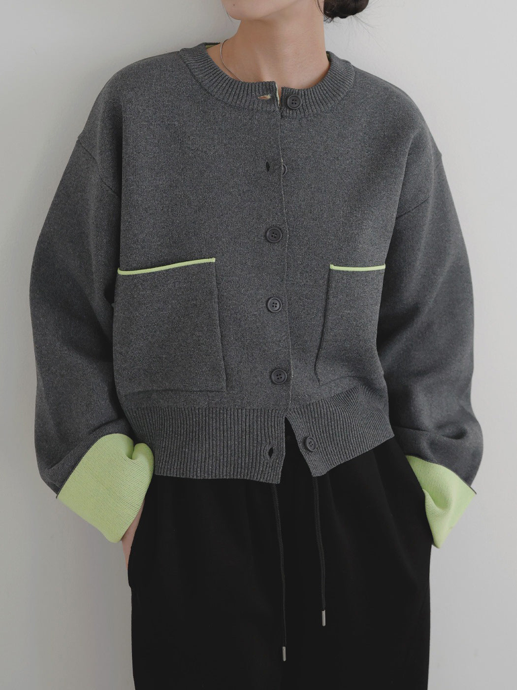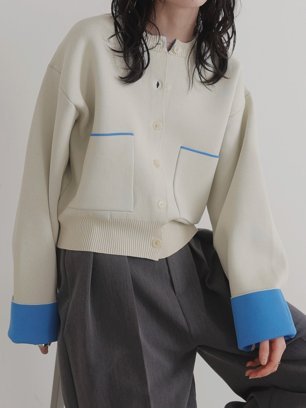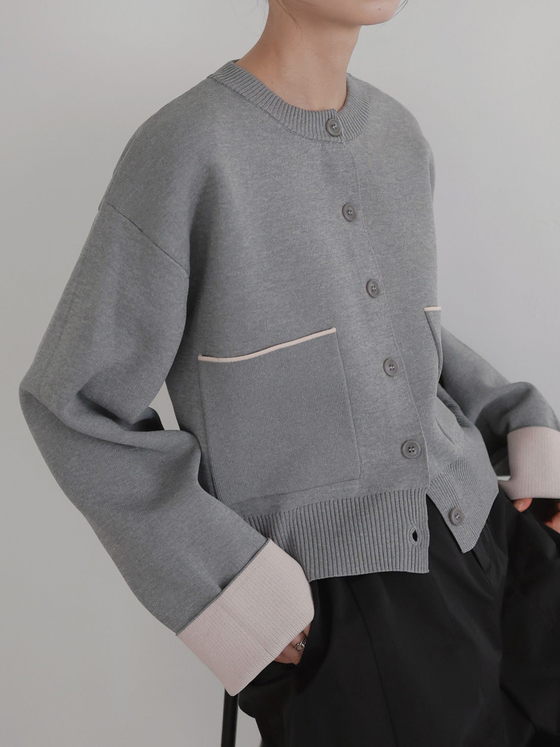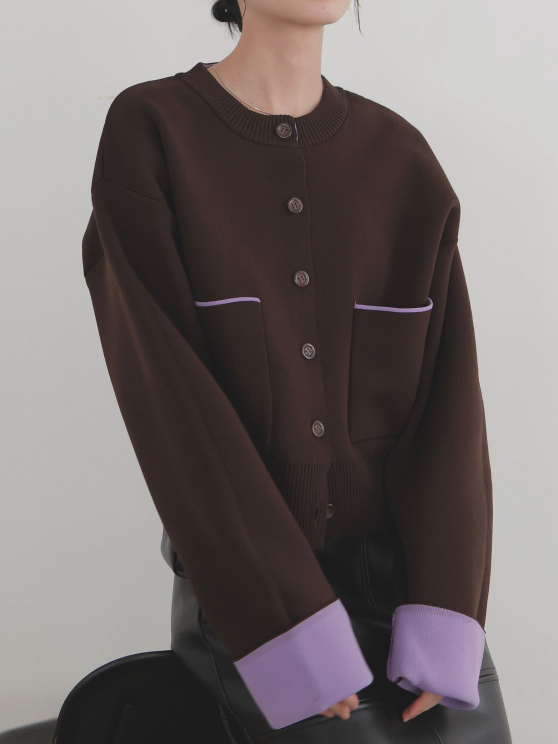 新鮮な配色のバイカラーが映えるポリエステルニットカーディガン。