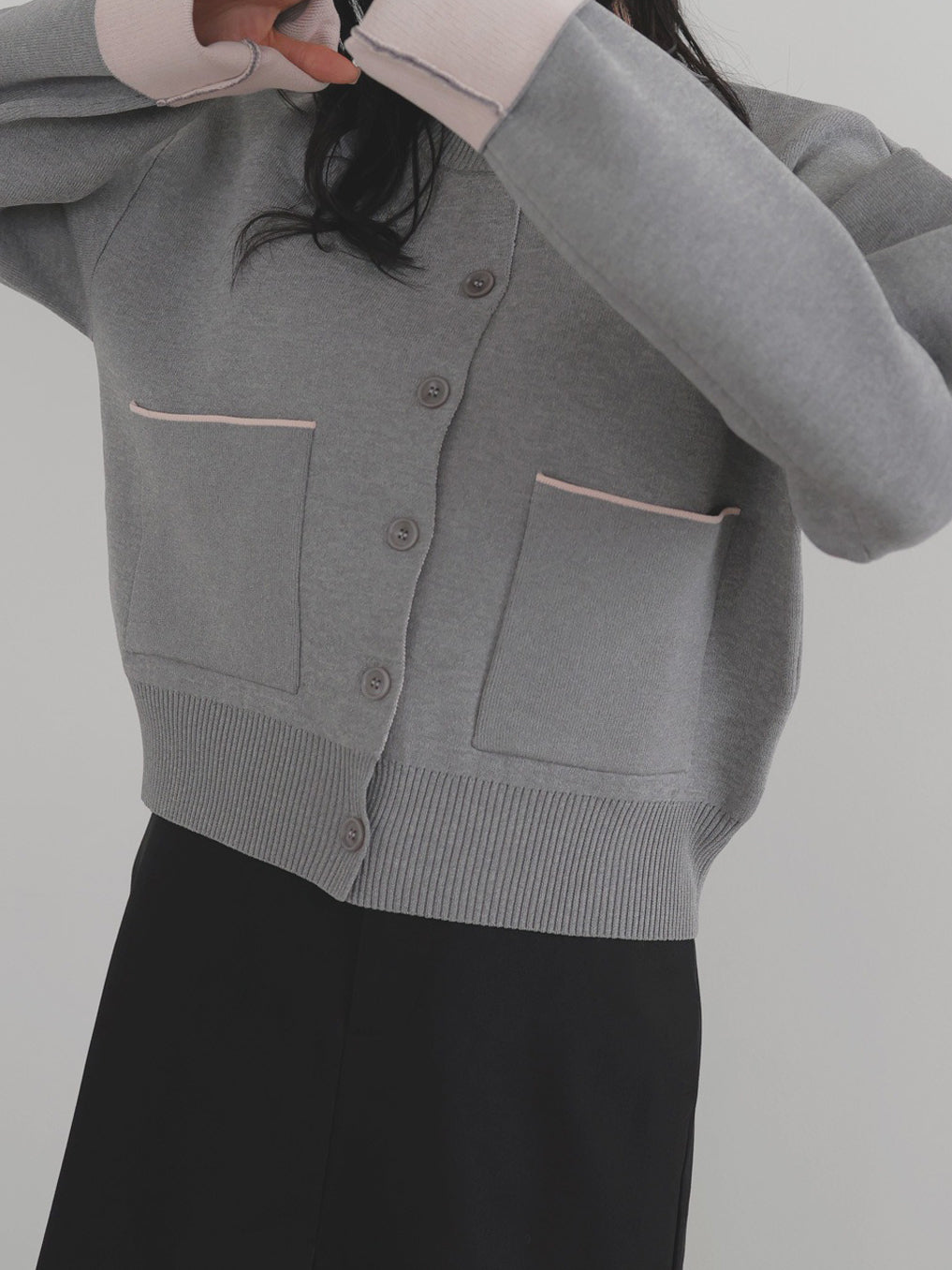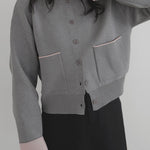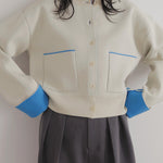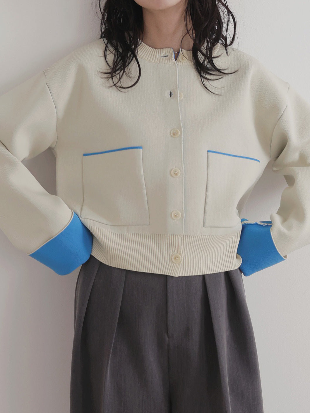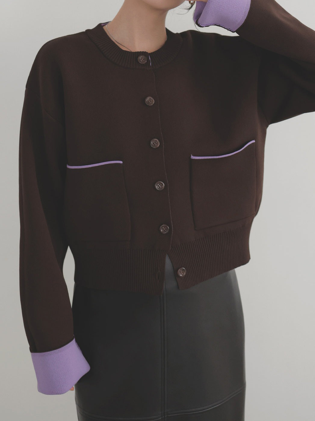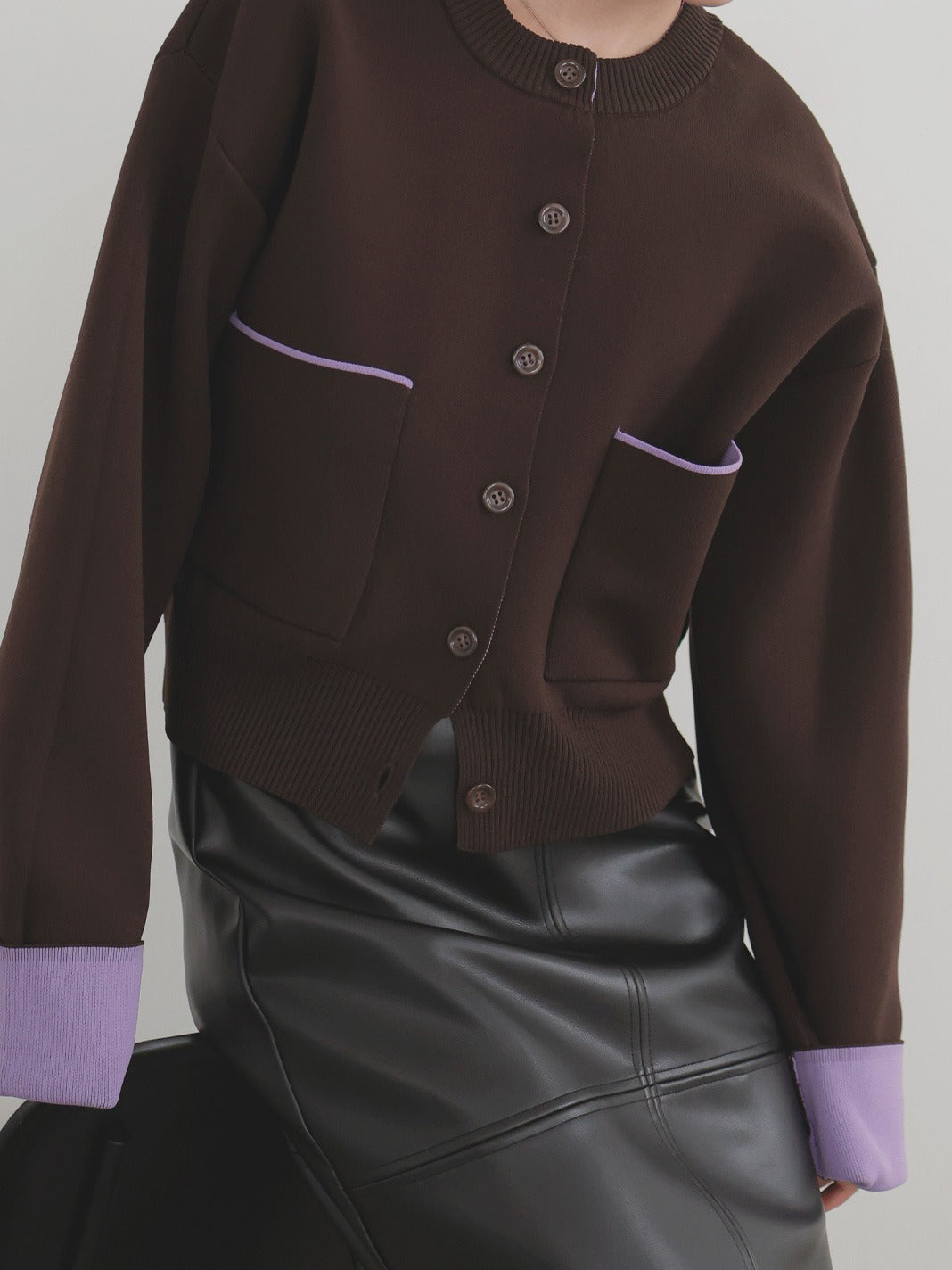 新鮮な配色のバイカラーが映えるポリエステルニットカーディガン。