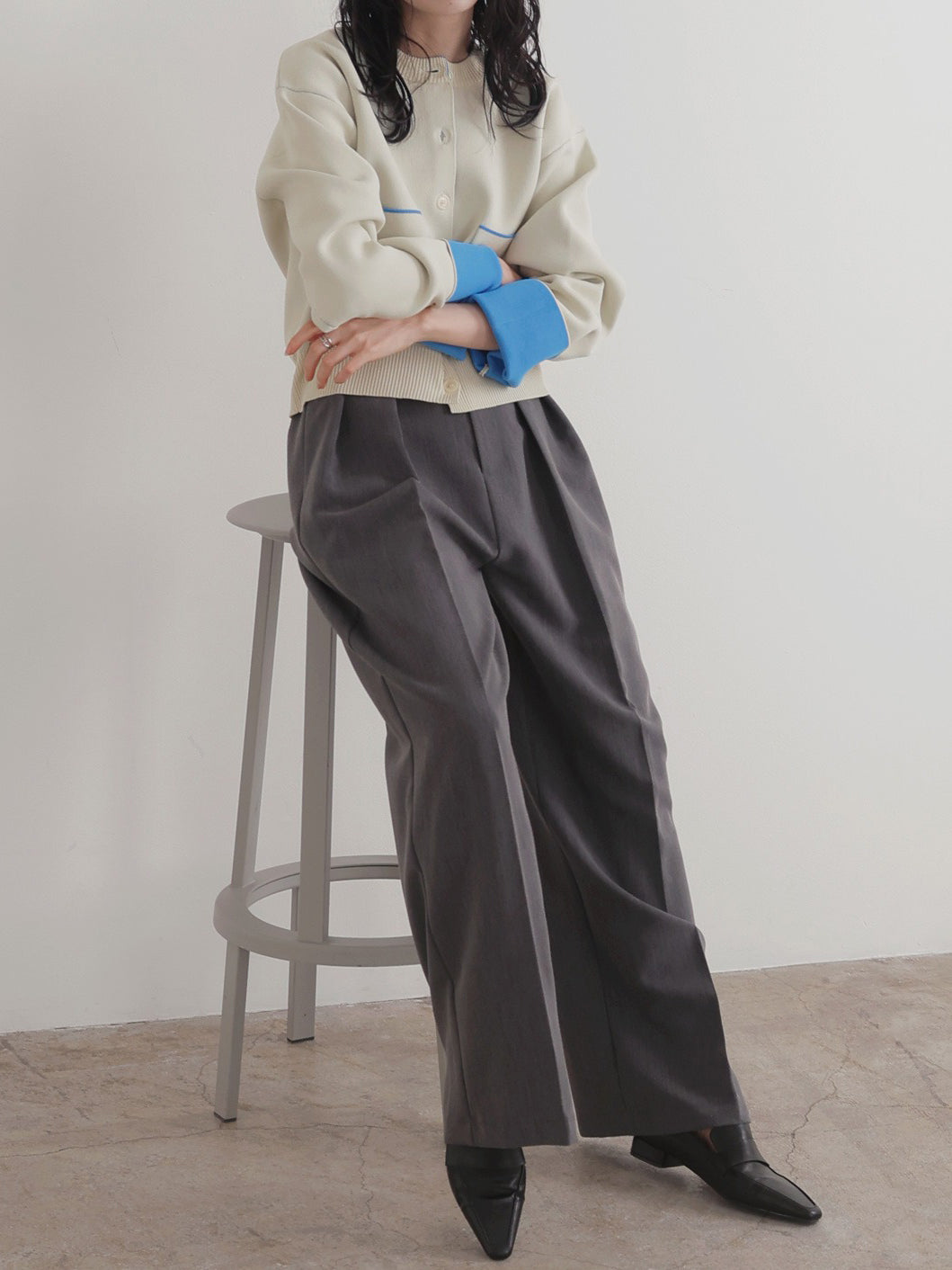 ・インナーにロンTやカットソーを合わせたり、薄手のタートルネックニットをレイヤードしてもごわつかず、秋から春先までロングシーズン活躍します。