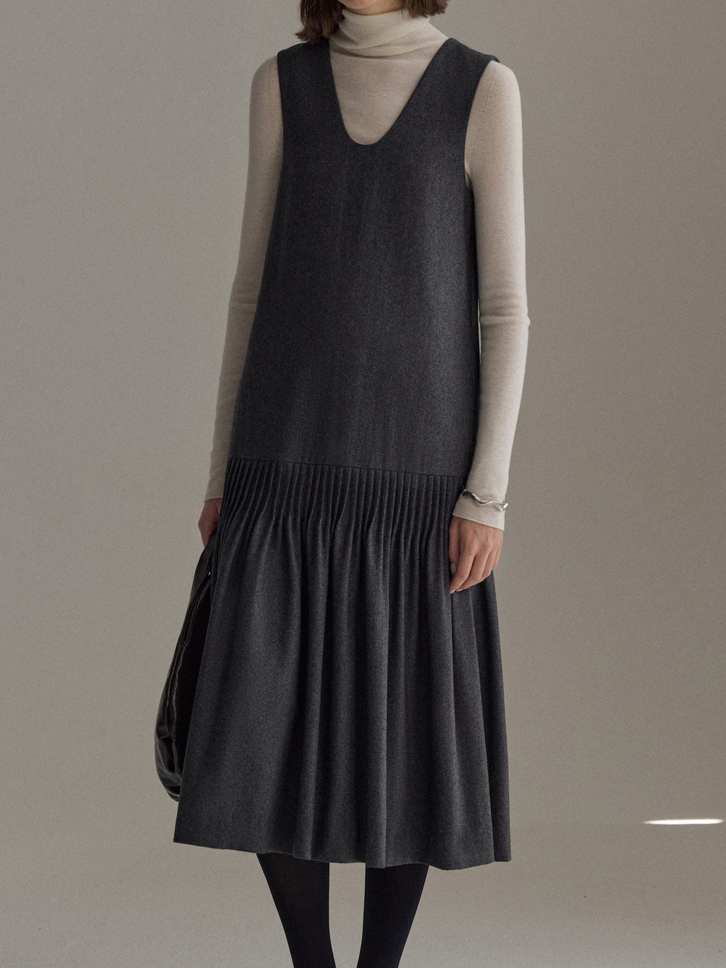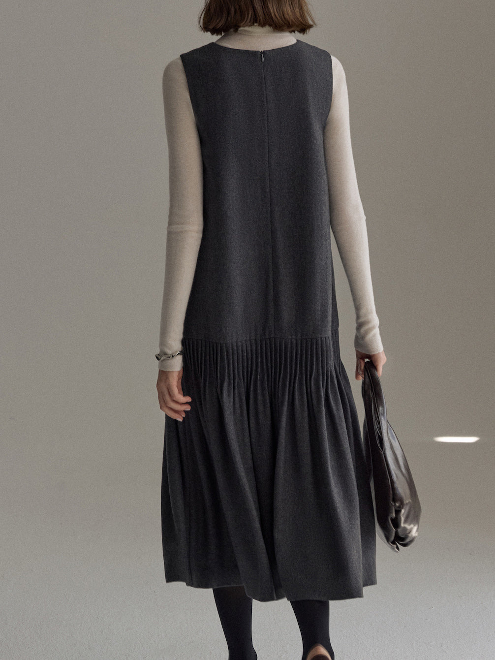 動くたびに揺れるプリーツフレアが女性らしさを演出したニットワンピース。