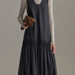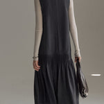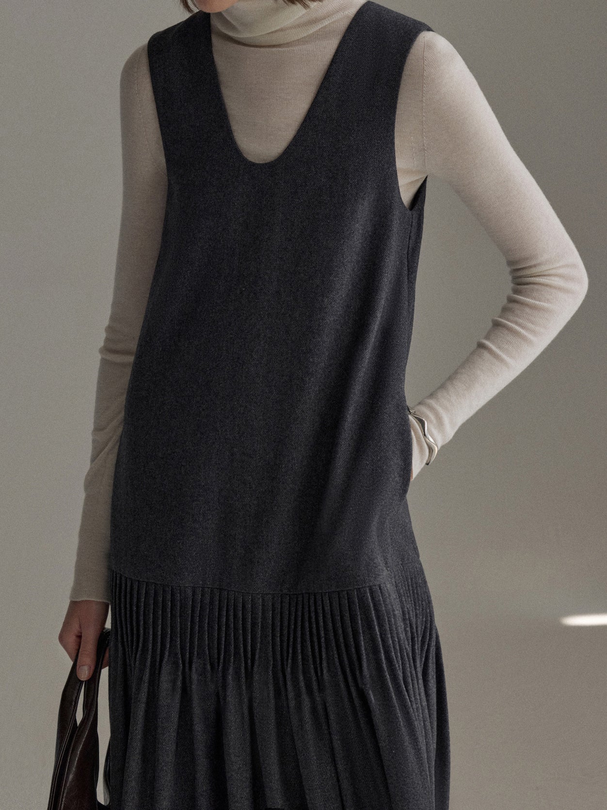 ノースリーブのすっきりとしたデザインで、1枚でもレイヤードでも着回しやすい一着です。