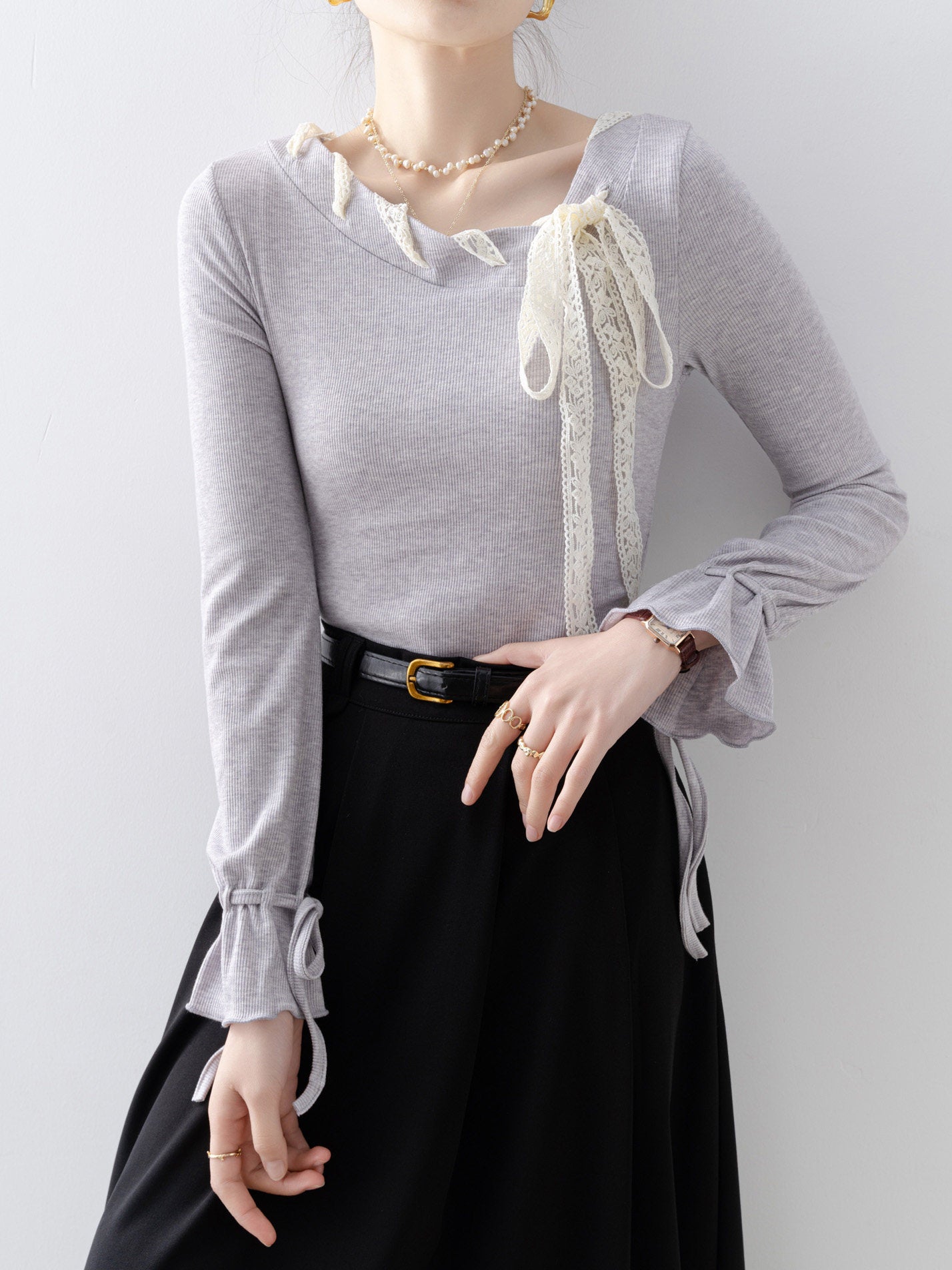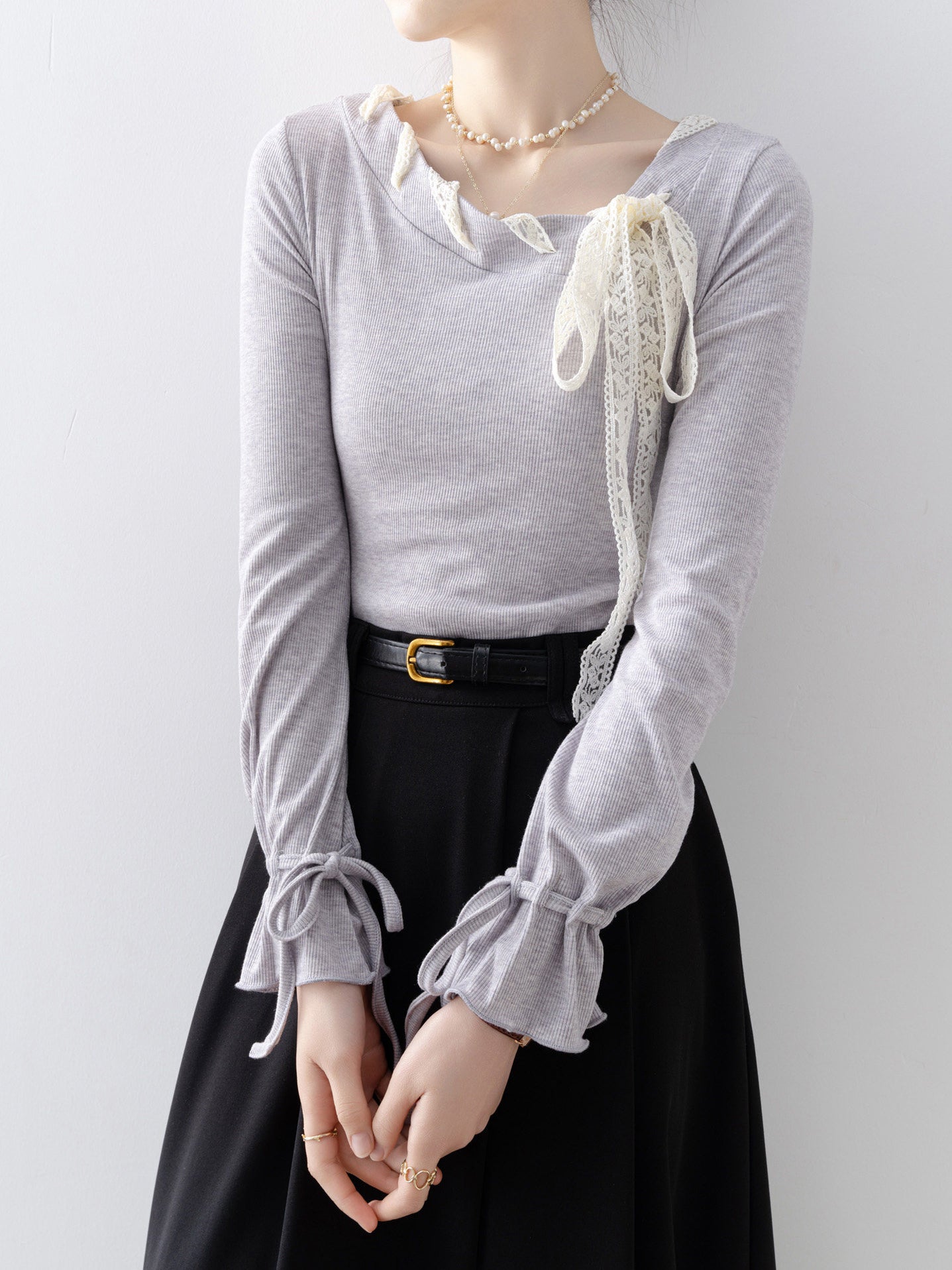レースアップボウタイリブニット
