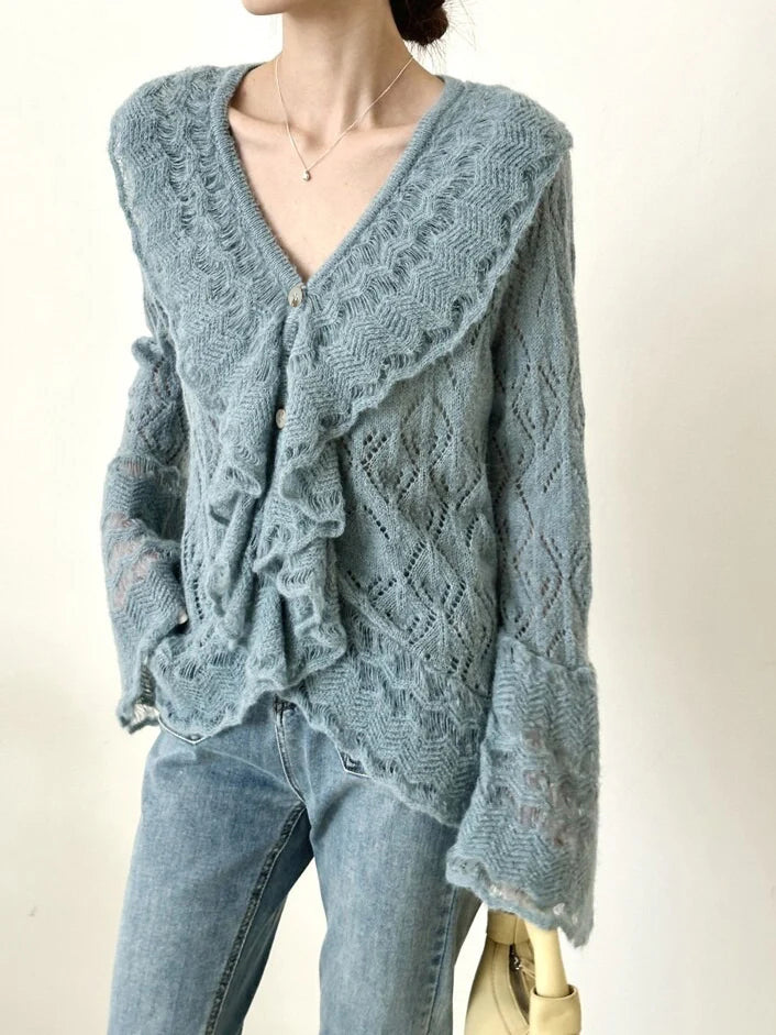 Vネックフリルデザインメッシュニット 2色入