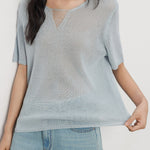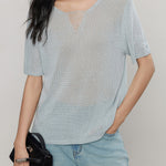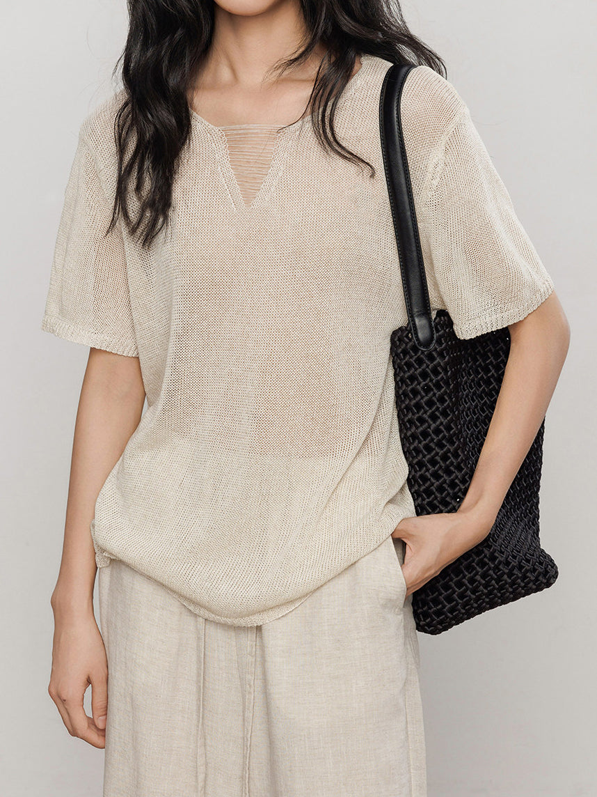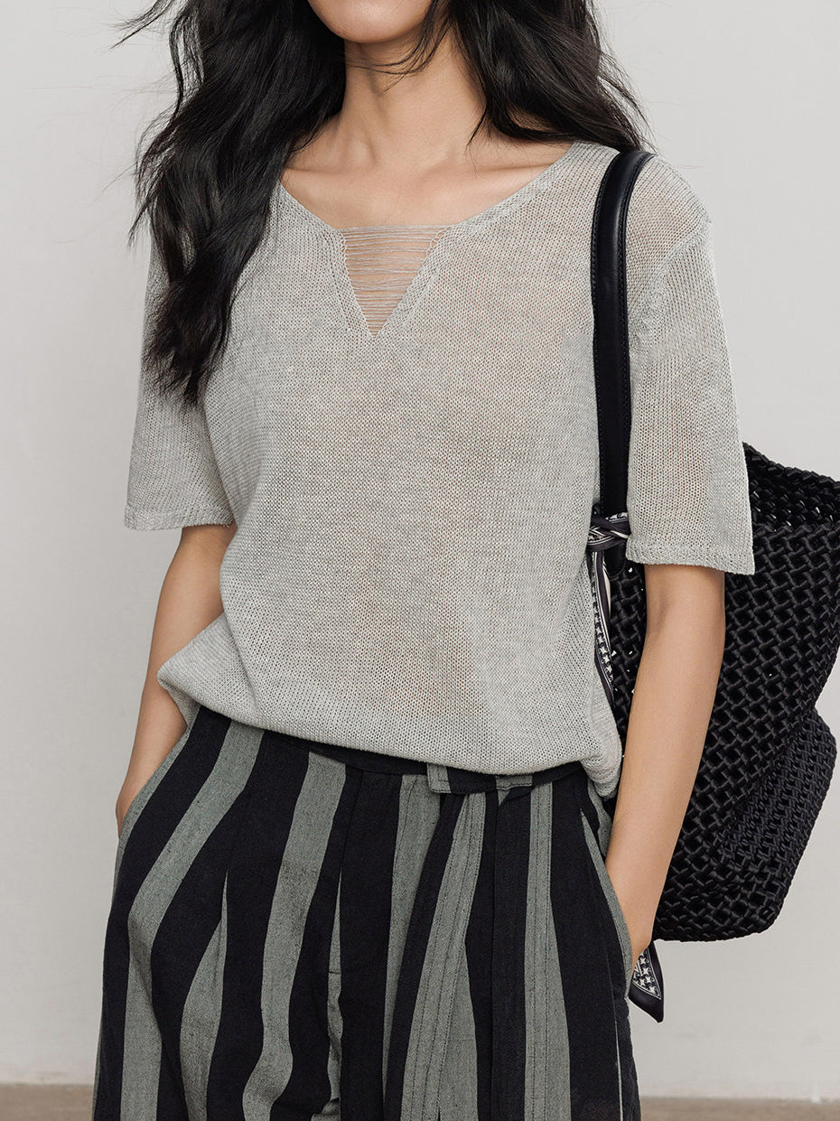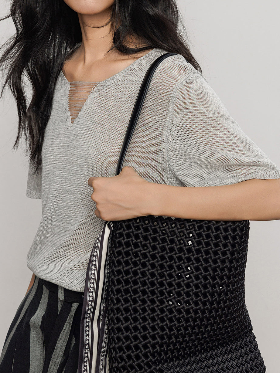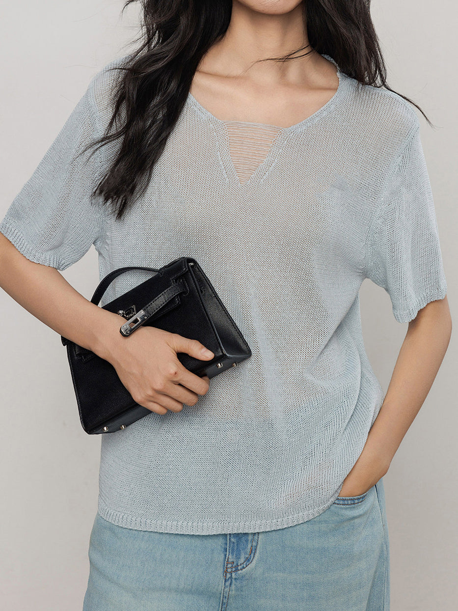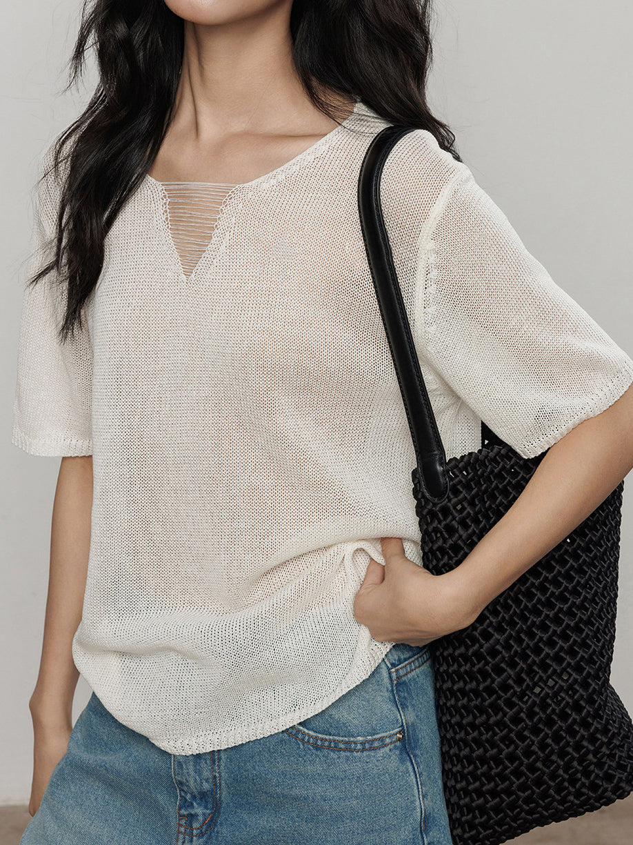 メッシュ組織ですが、目をそこまで大きくしていないため、適度なシアー感でトレンドを取り入れやすいデザインです。