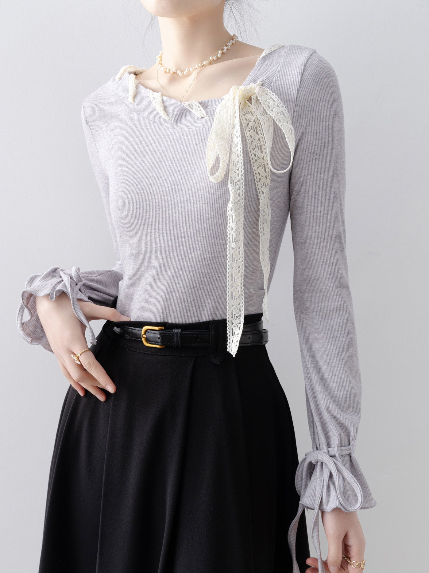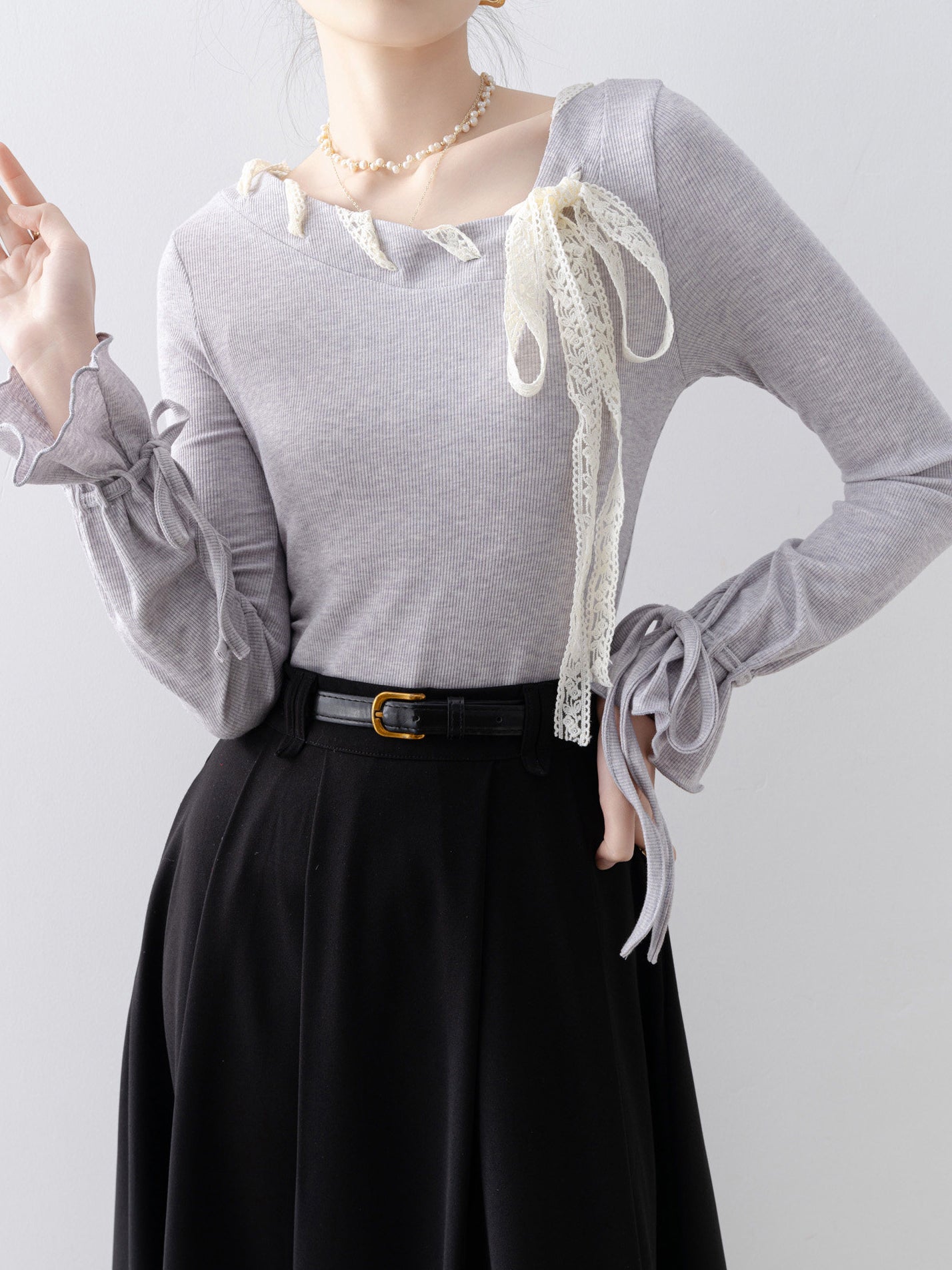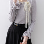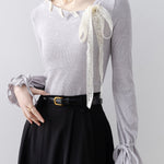 華やかさと上品さをひと結び、レースアップのボウタイニット。